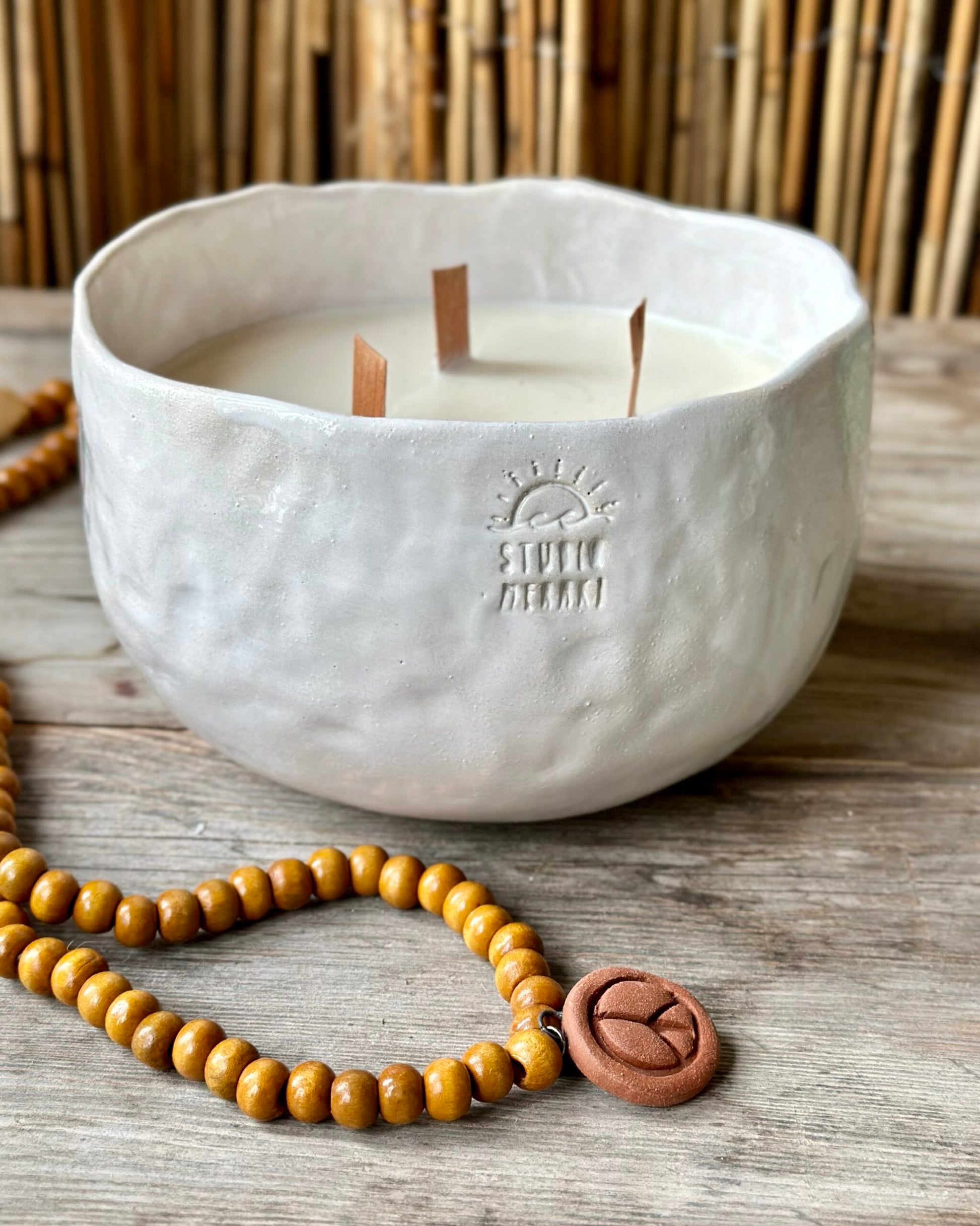 An extra large and luxurious scented candle made of rapeseed wax, an environmentally friendly wax that does not release soot and toxins. Scented with organic lemongrass essential oil. When the candle has burned out, you can use the bowl over and over again.