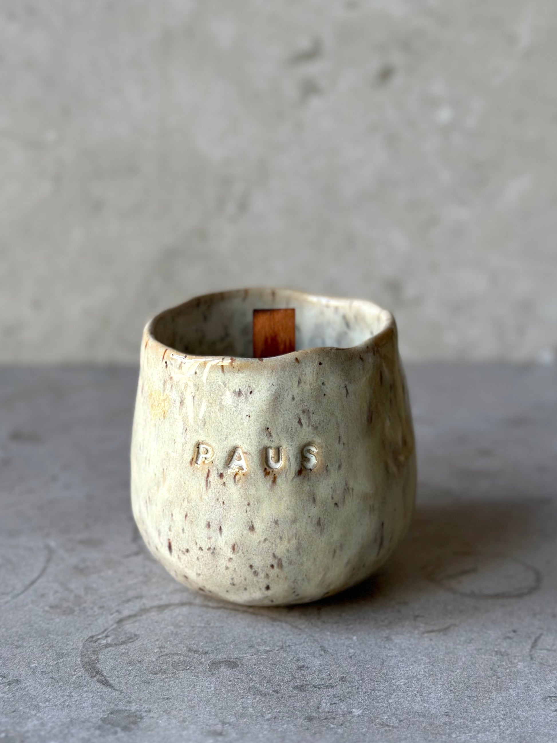 Bowl/mug in spotted stoneware clay with light beige/mint green glaze. Decorated with the word PAUS on the side.