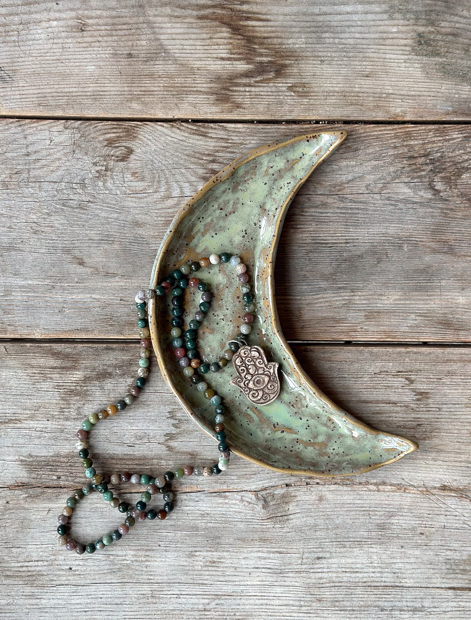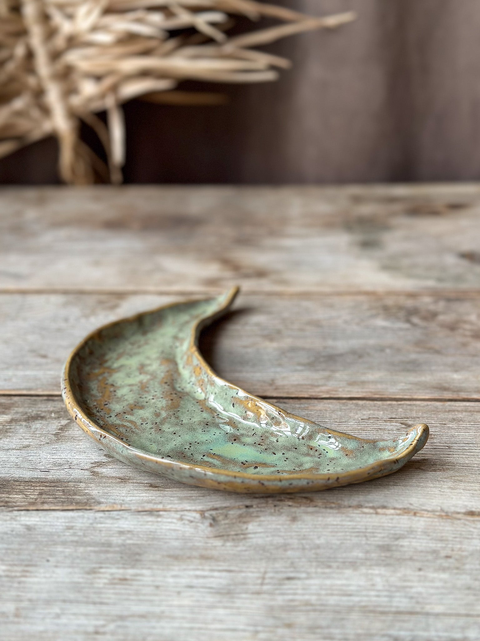 Decorative dish in the shape of a moon, perfect for your Palo Santo, your jewelry or crystals. Glazed in a sea green glaze.