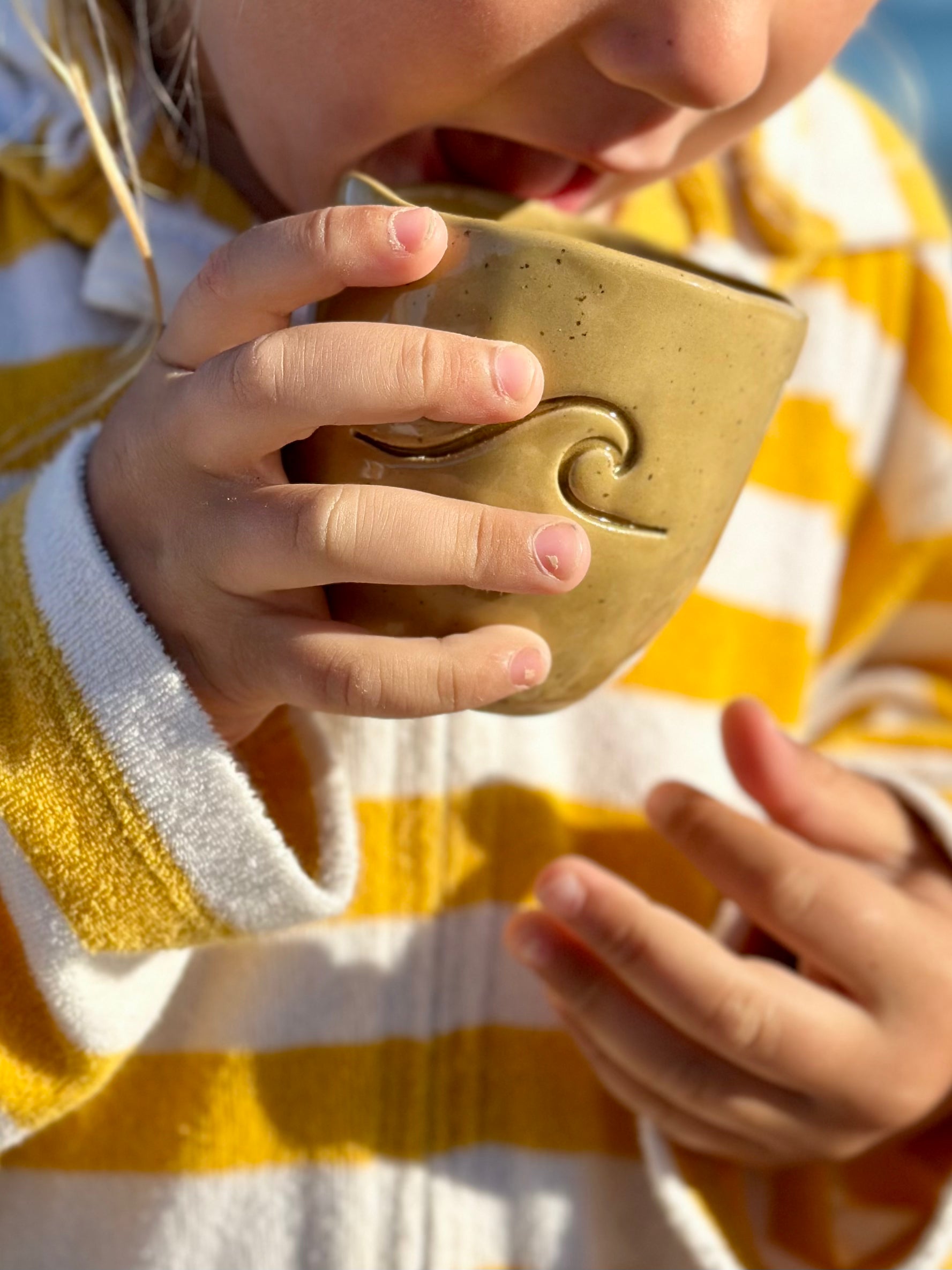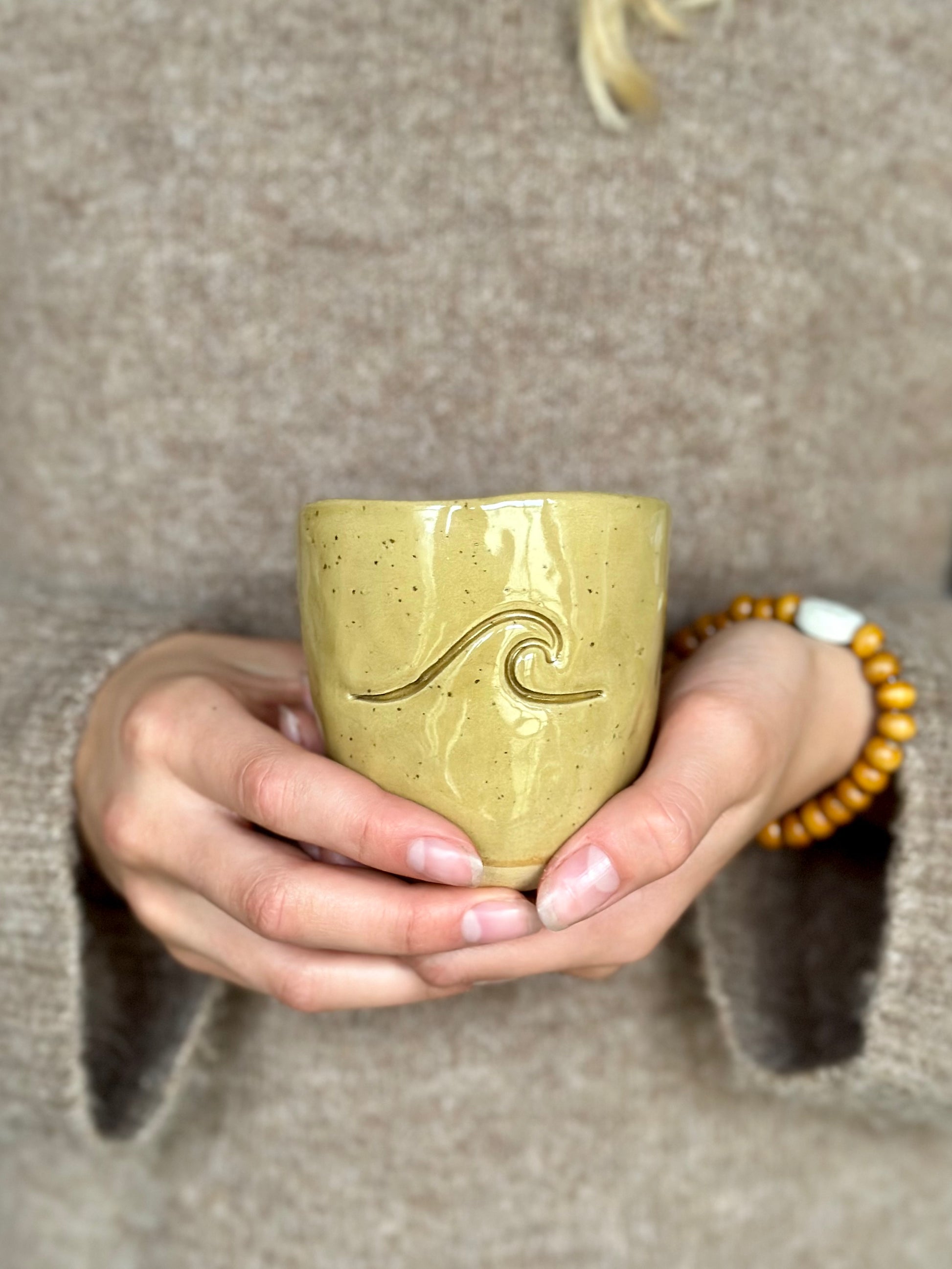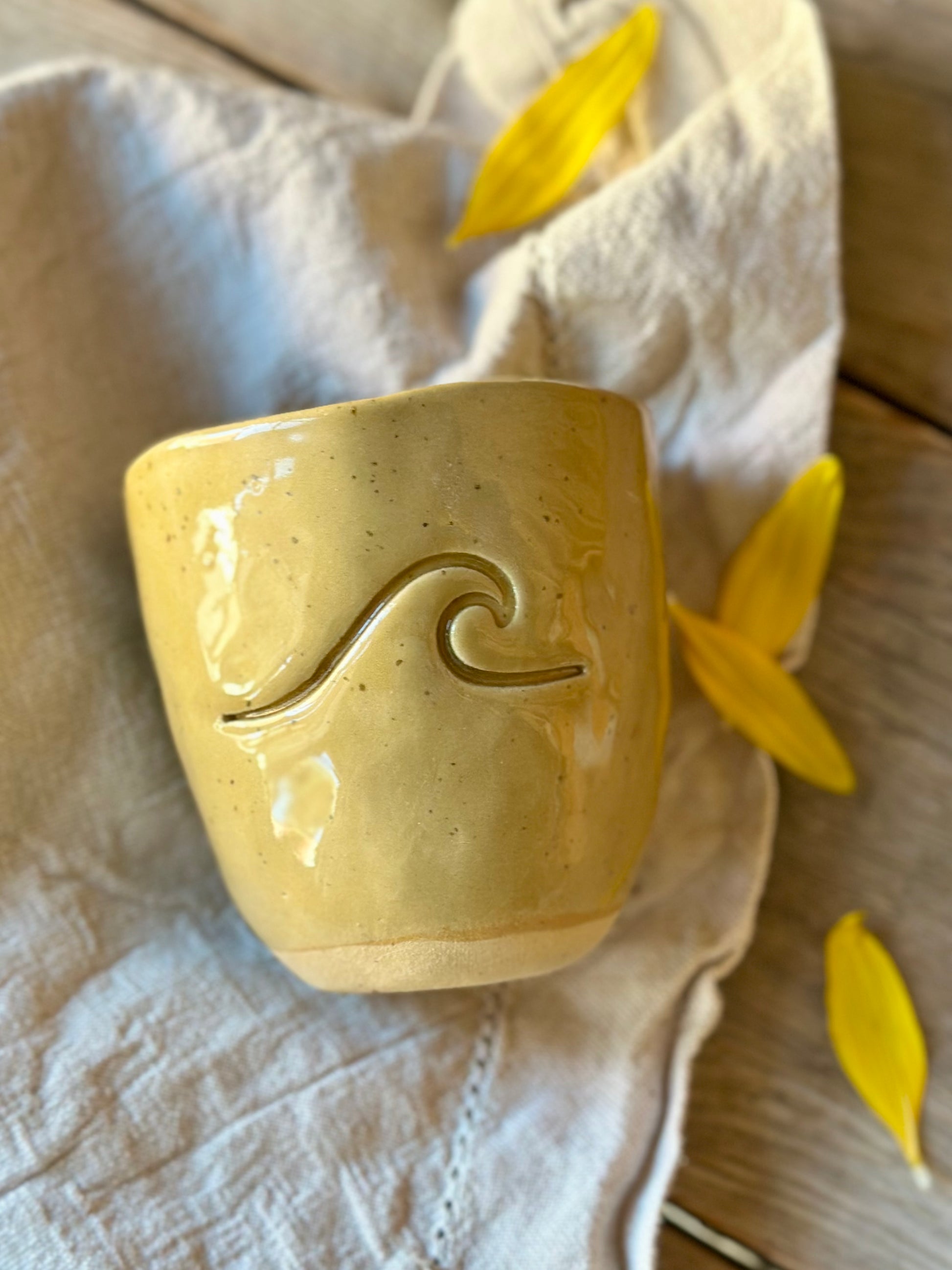 Pinched mug in spotted stoneware clay with a warm mustard yellow glaze. Decorated with a wave on the side.