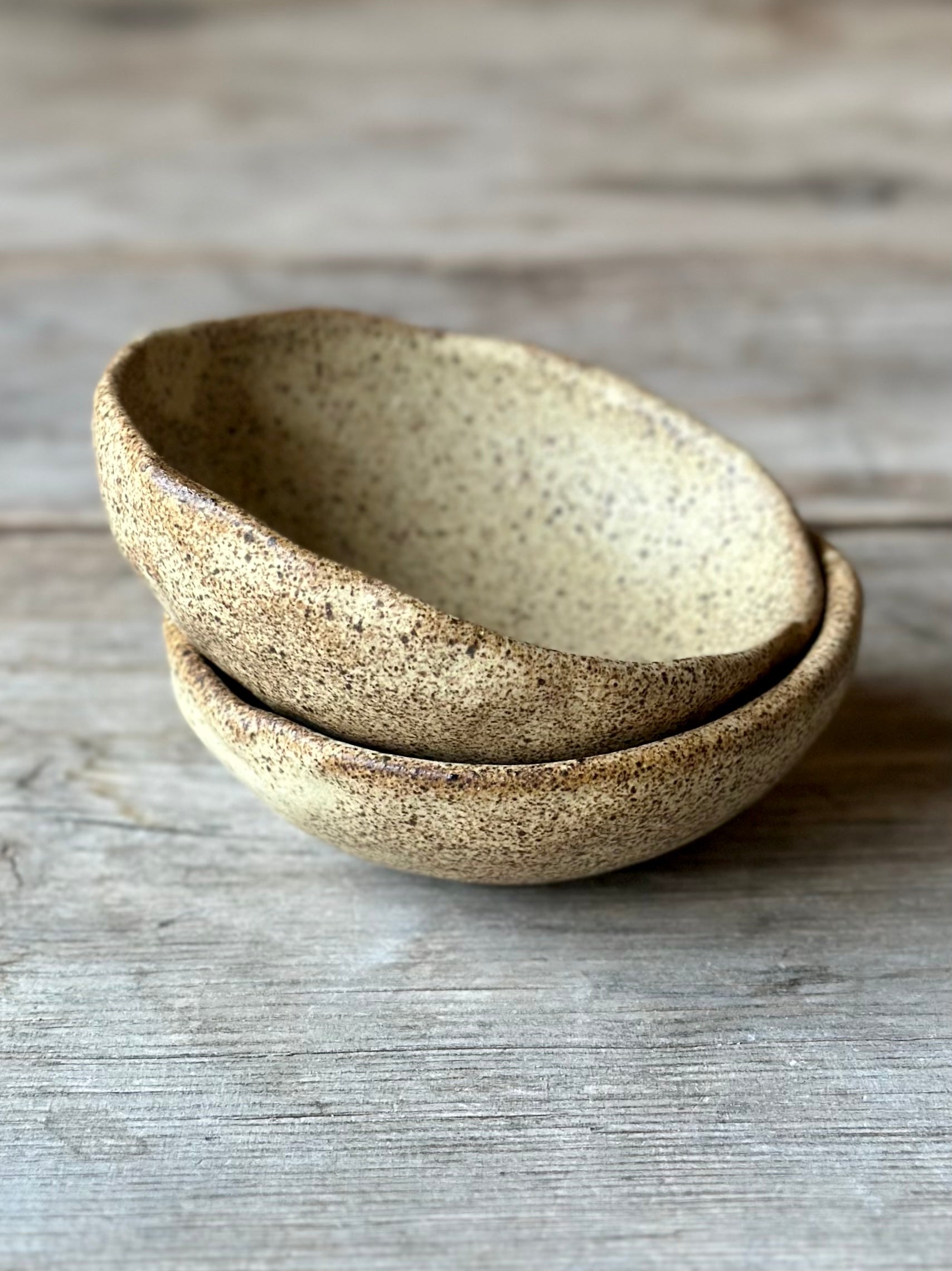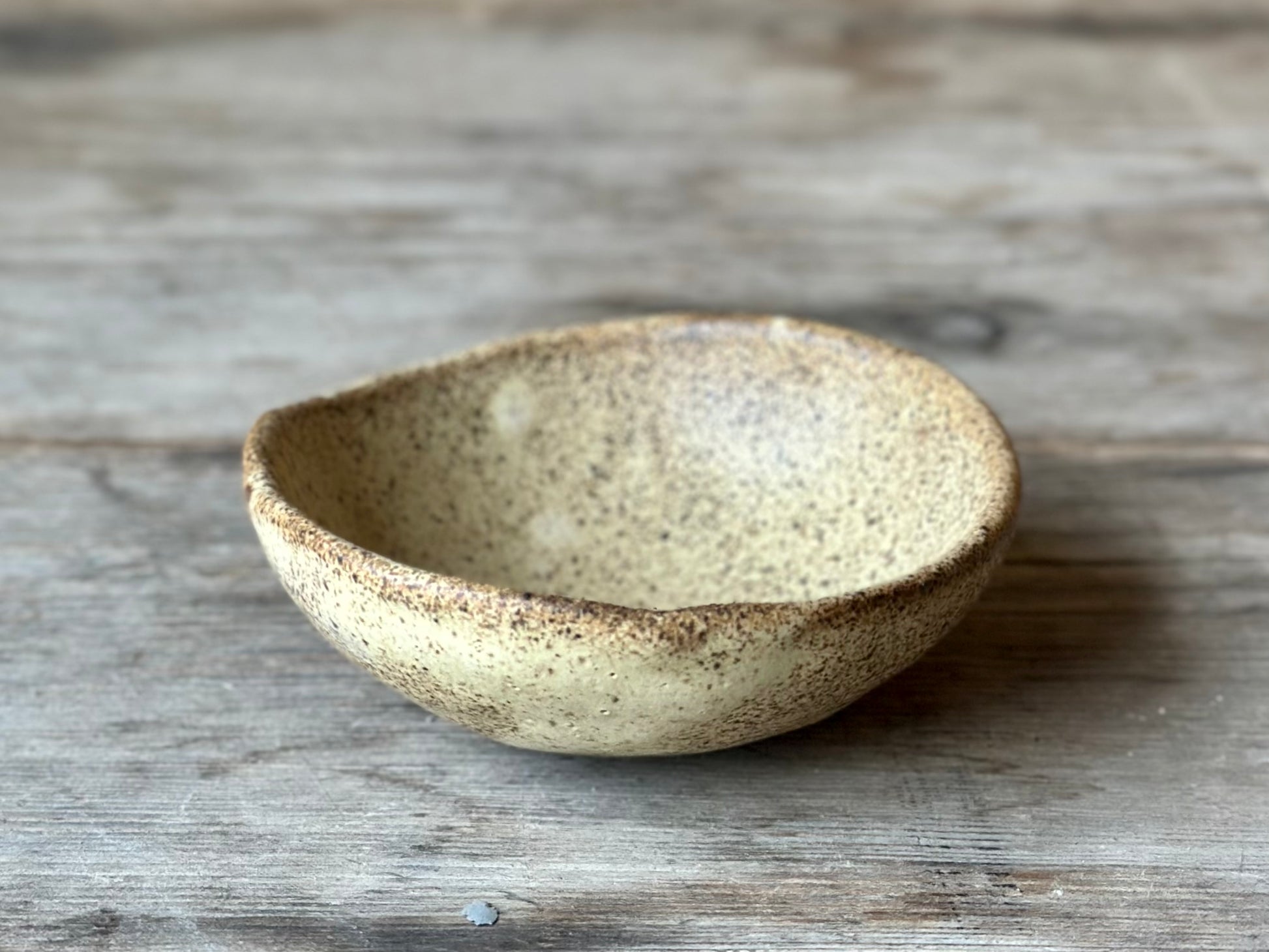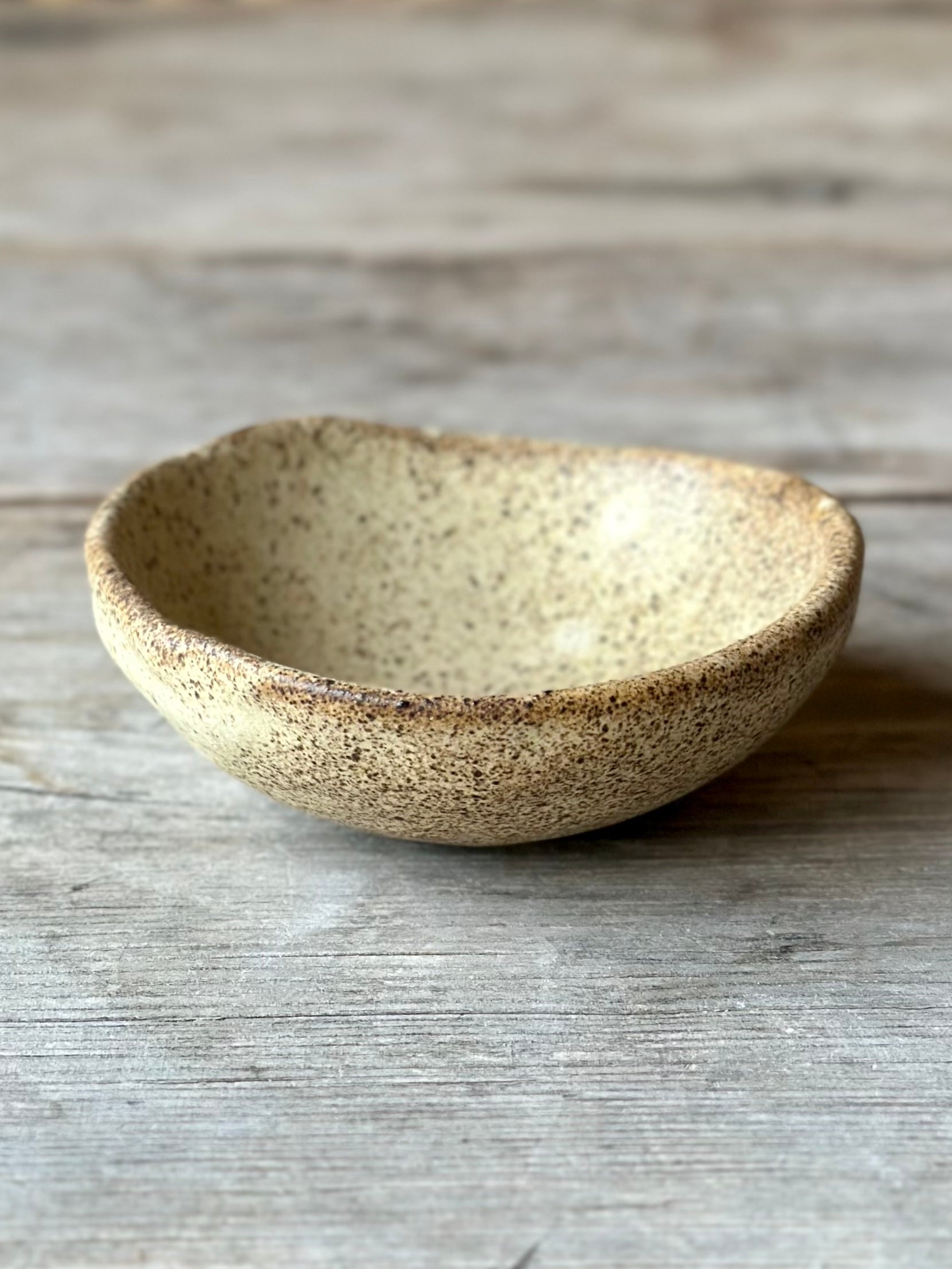 Small bowl in gray stoneware clay with beige and brown matte glaze.