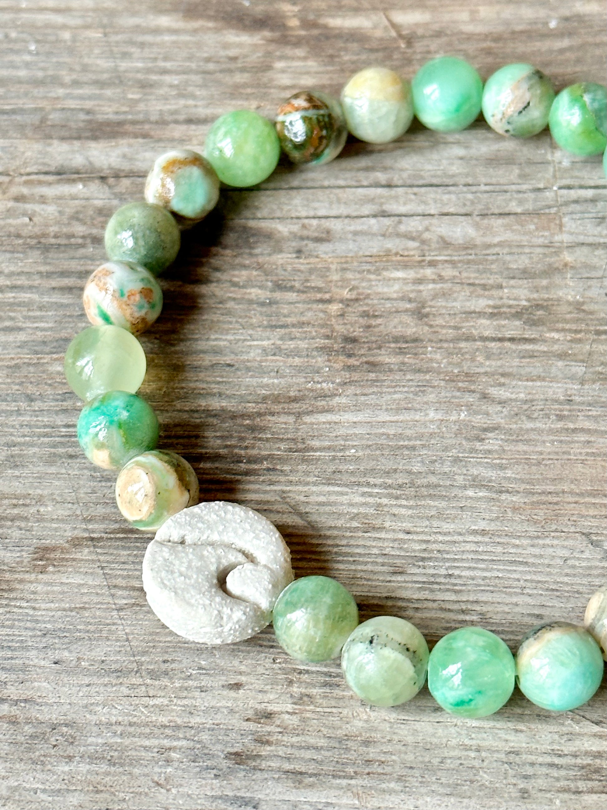 Armband i natursten (Kalcit) och handgjord keramikpärla i vit stengodslera med en våg.