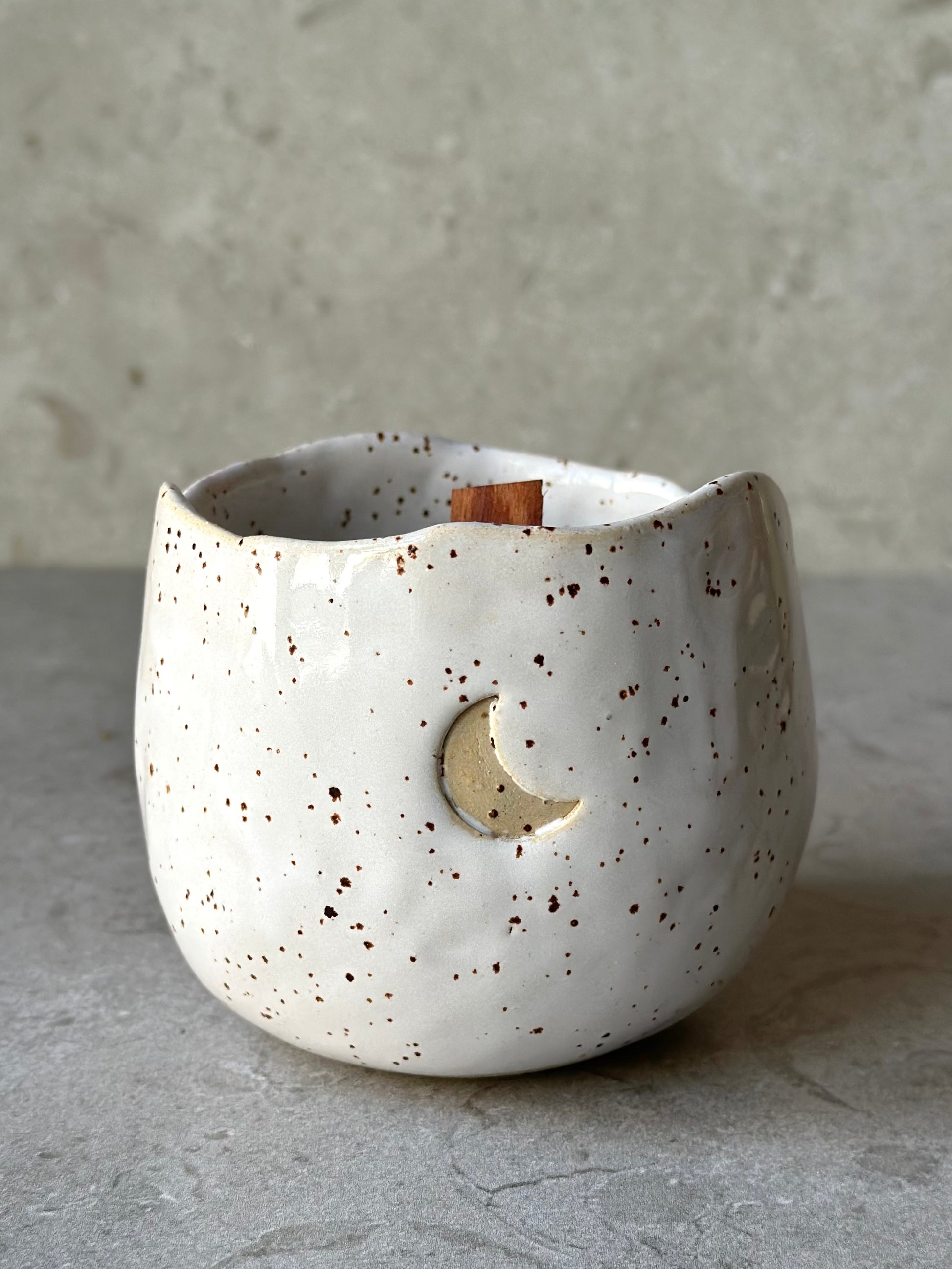 Skål/mugg i prickigstengodslera med vit glasyr. Dekorerad med en måne på sidan.