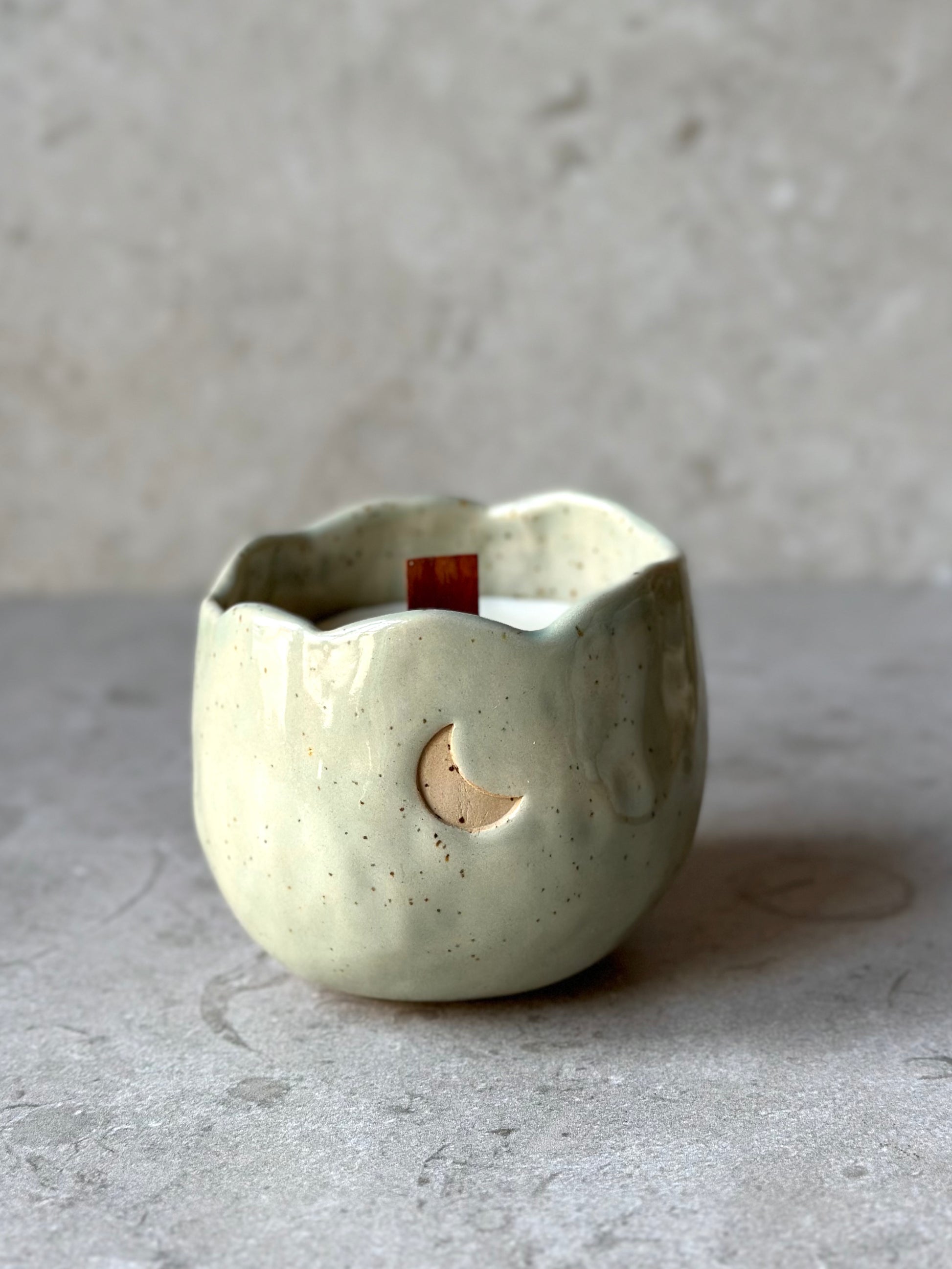 Skål/mugg i stengodslera med mintgrön glasyr. Dekorerad med en måne på sidan.