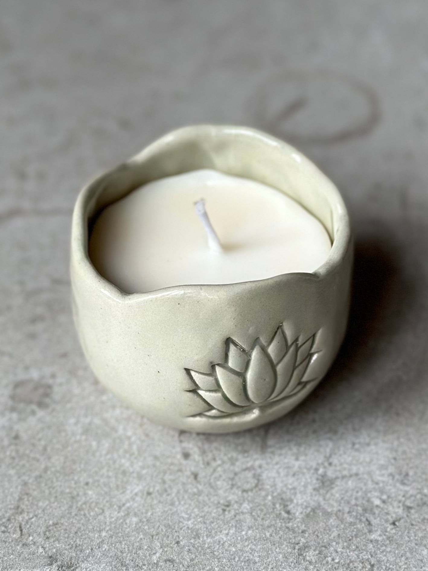 Skål i stengodslera med mintgrön glasyr, dekorerad med en lotusblomma på sidan.