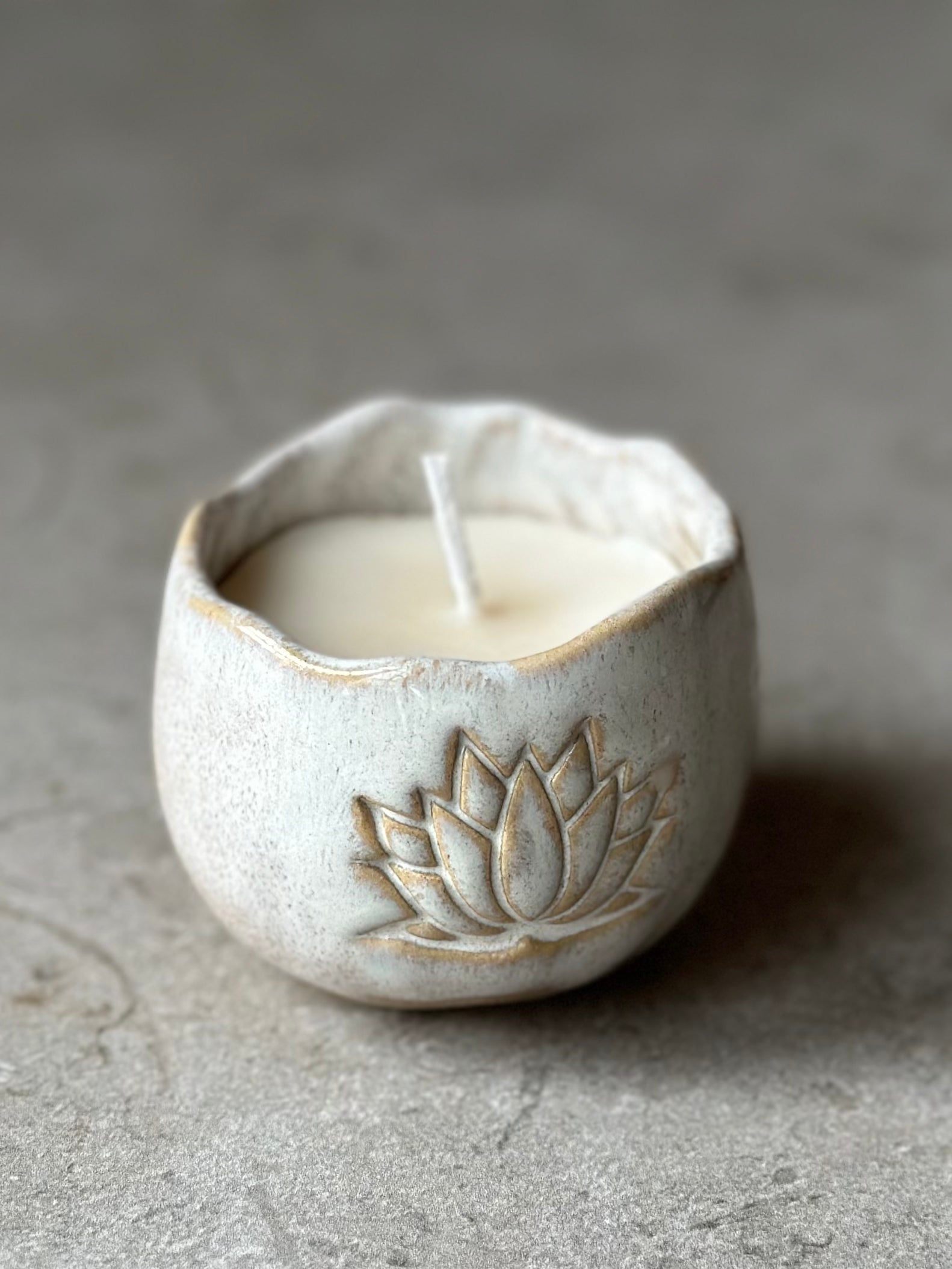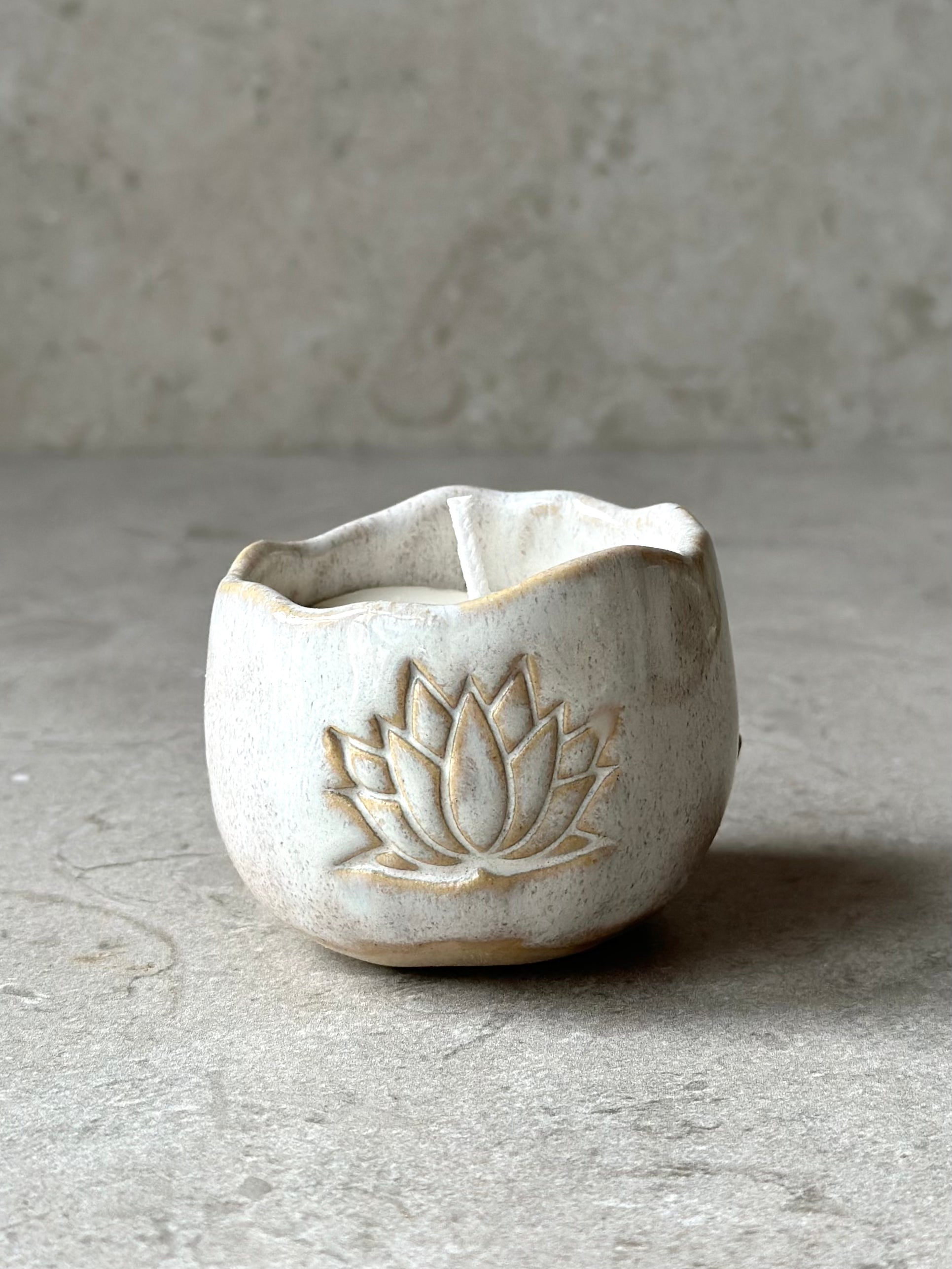 Skål i stengodslera med cremevit glasyr, dekorerad med en lotusblomma på sidan.