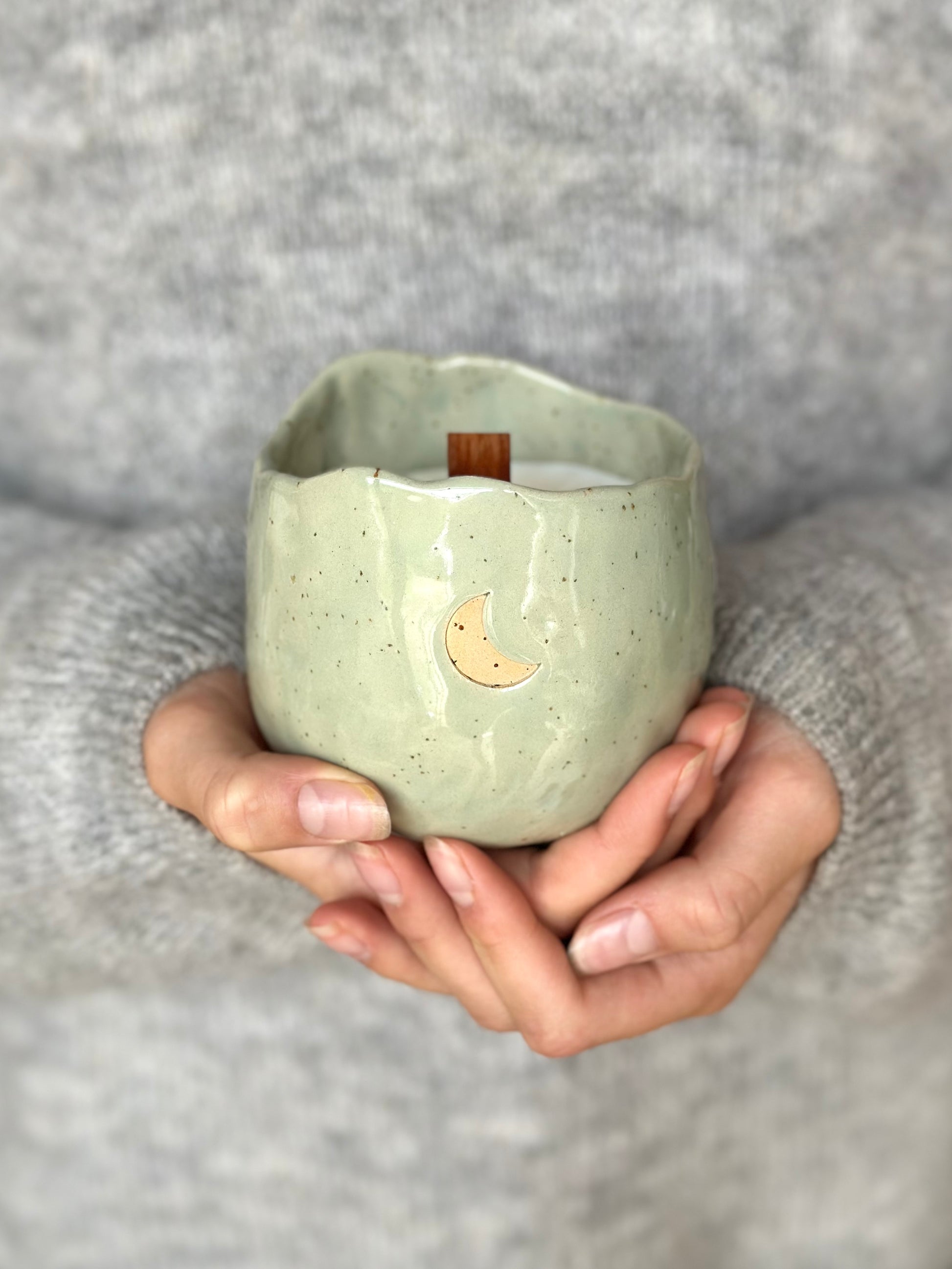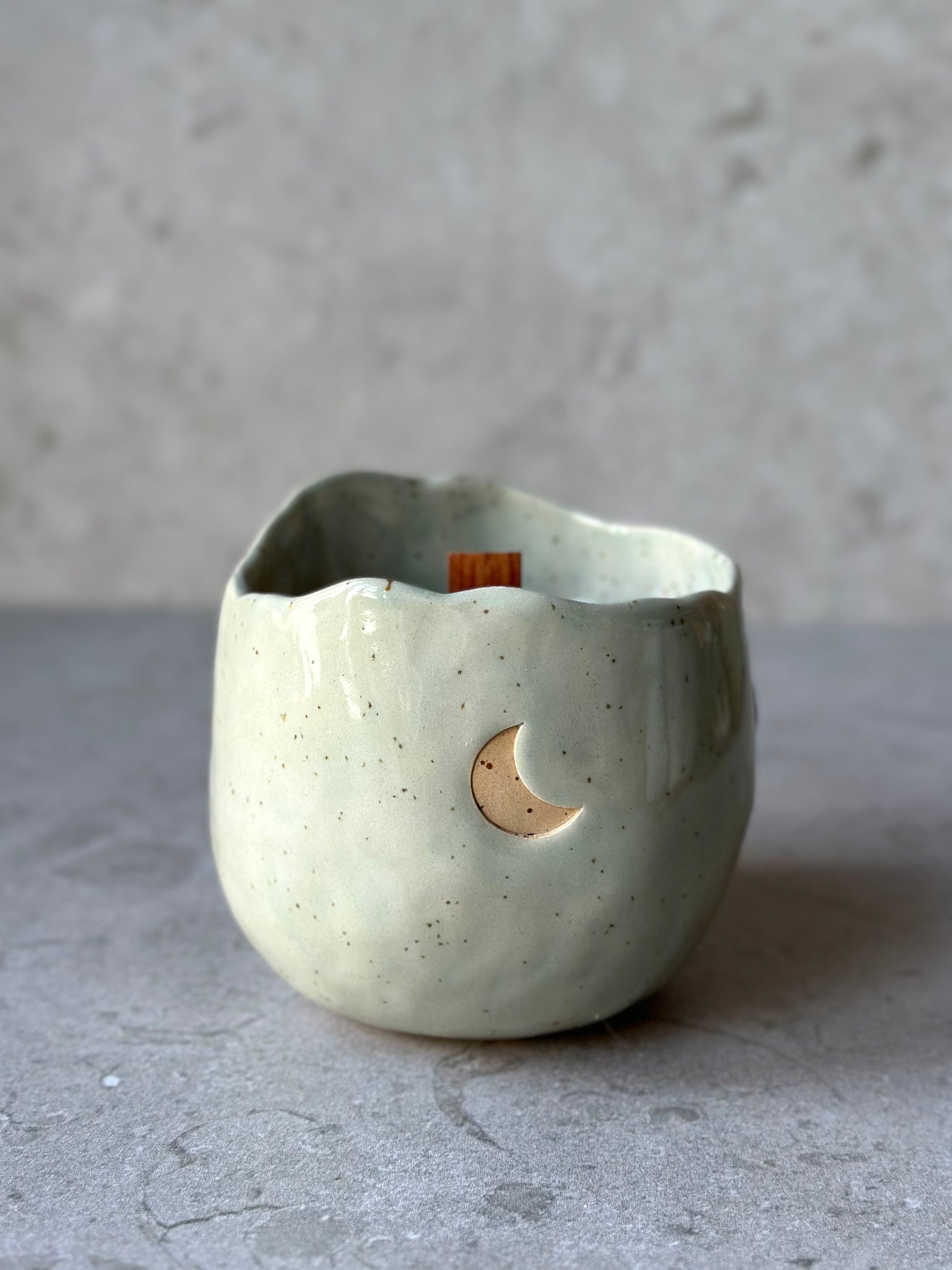 Skål i stengodslera med mintgrön glasyr, dekorerad med en måne på sidan.