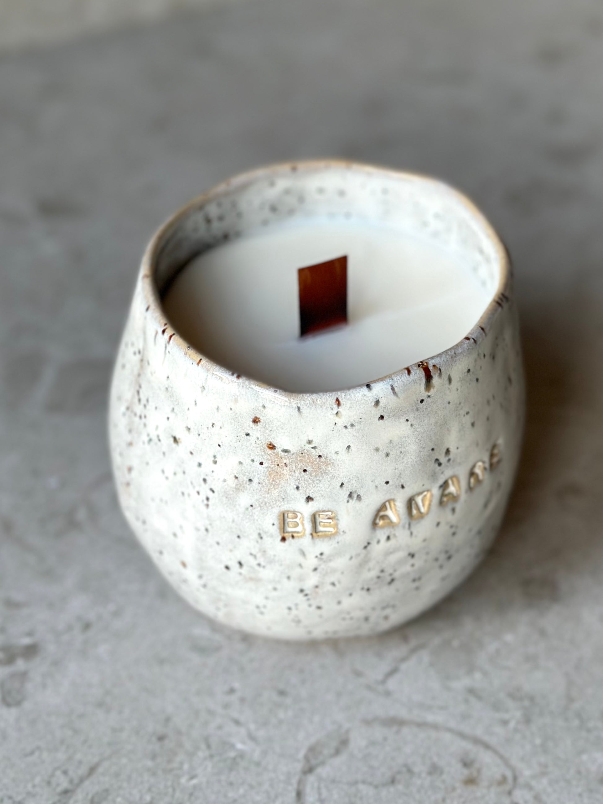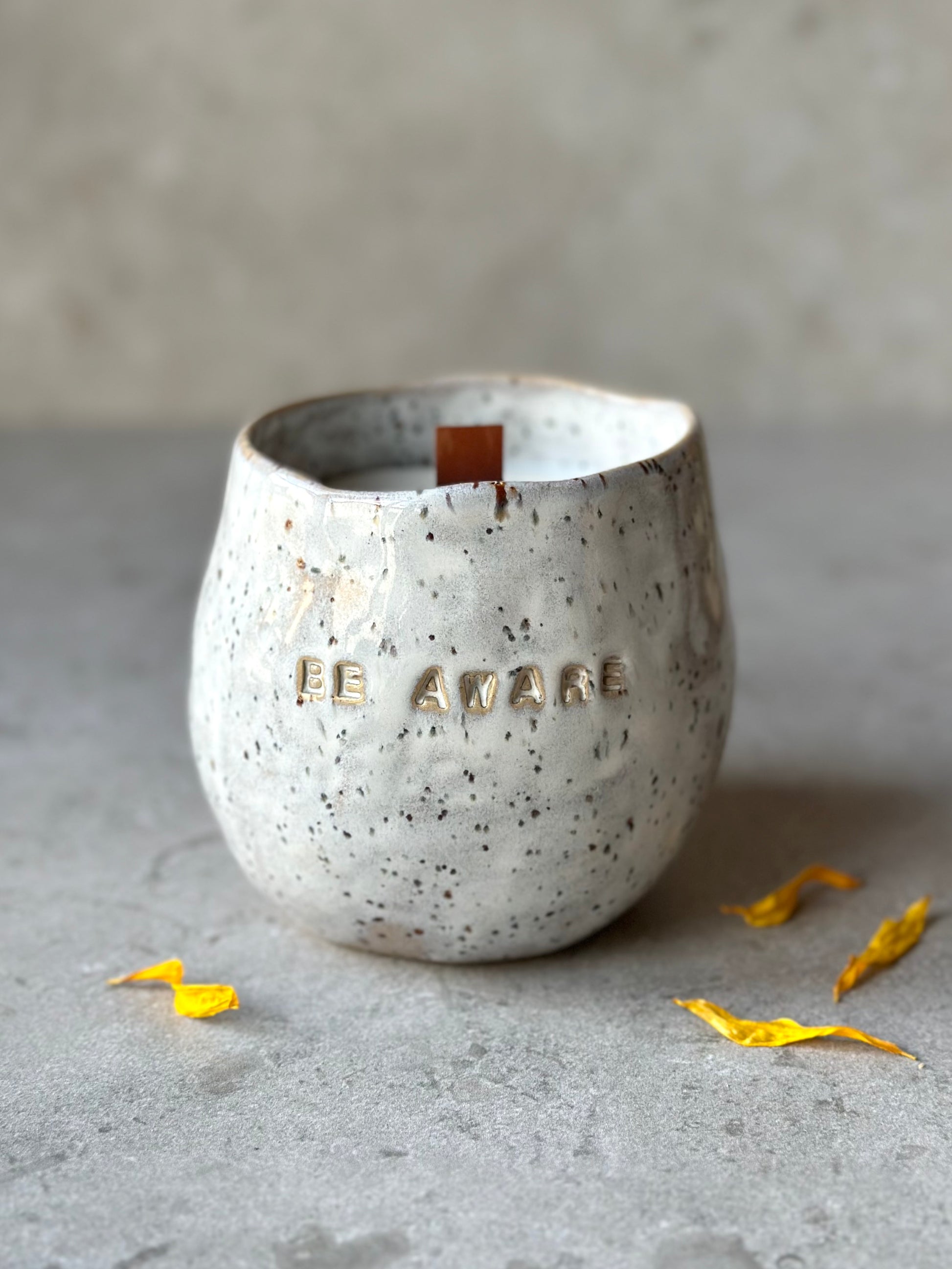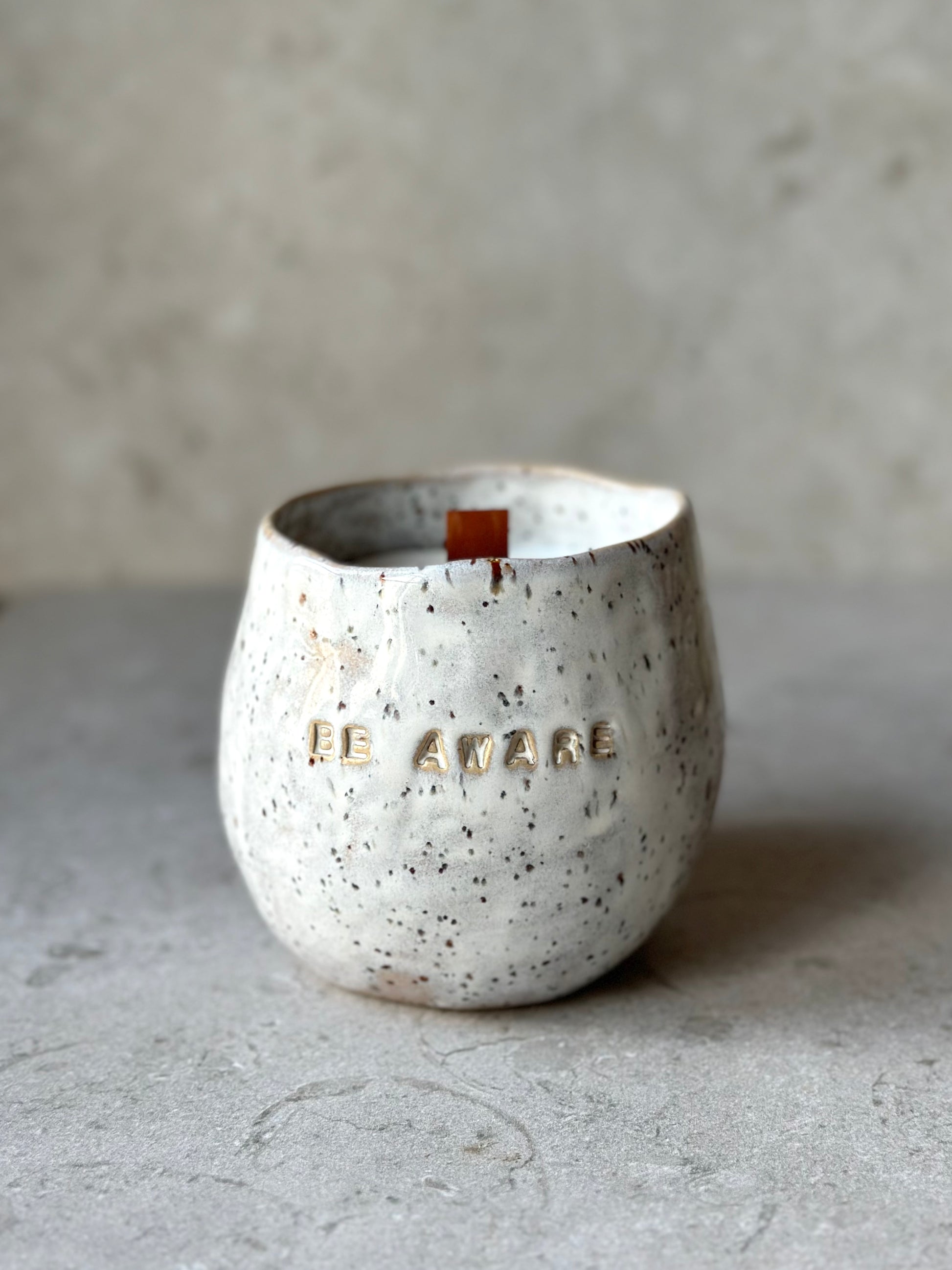 Skål/mugg i prickig stengodslera med vit glasyr, dekorerad med budskapet BE AWARE på sidan.