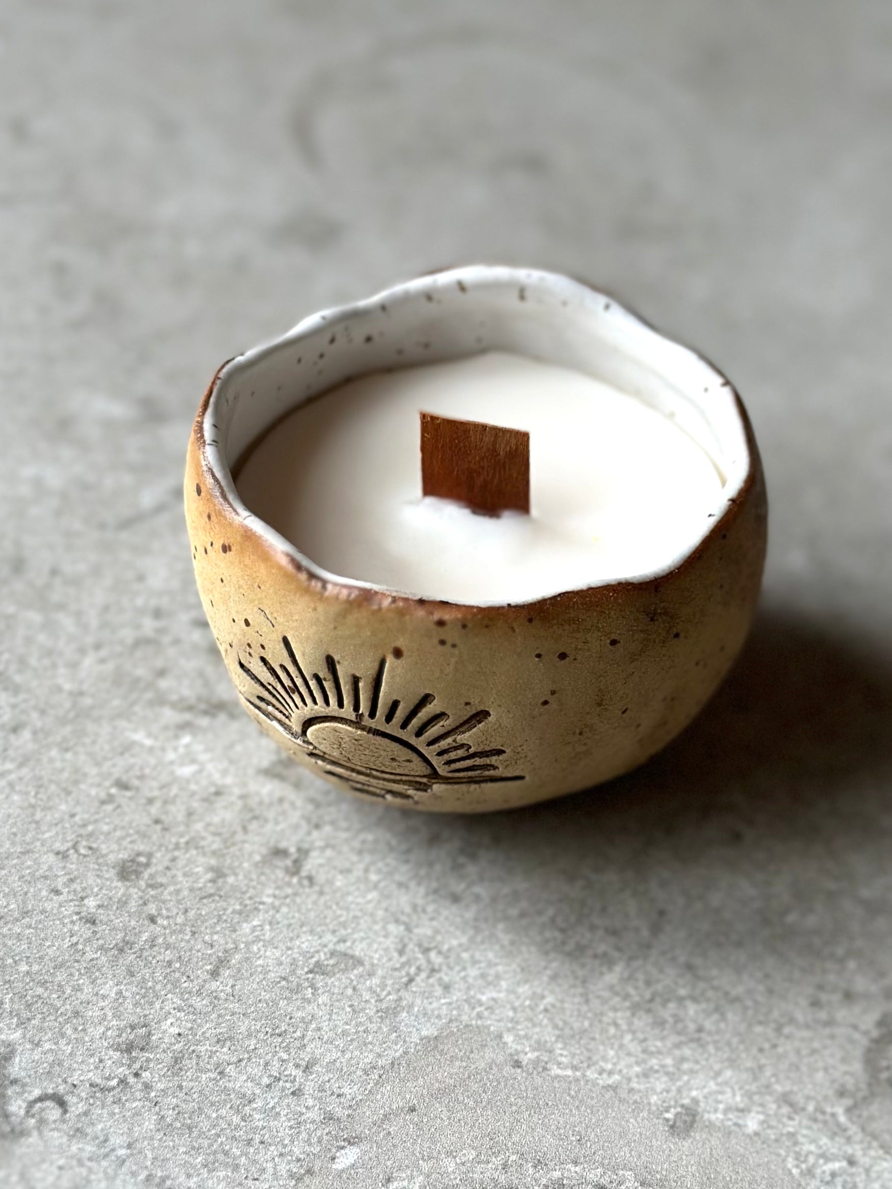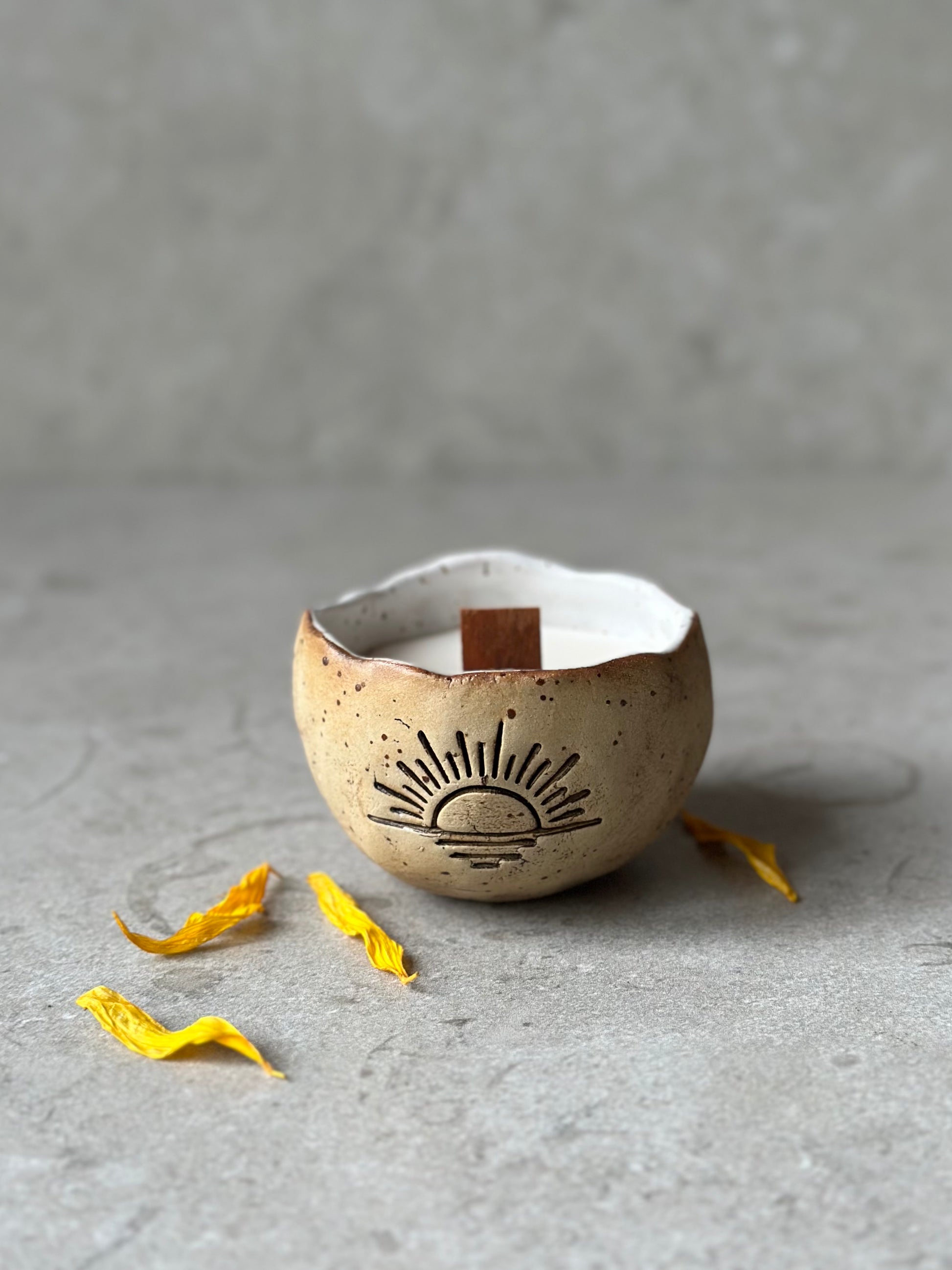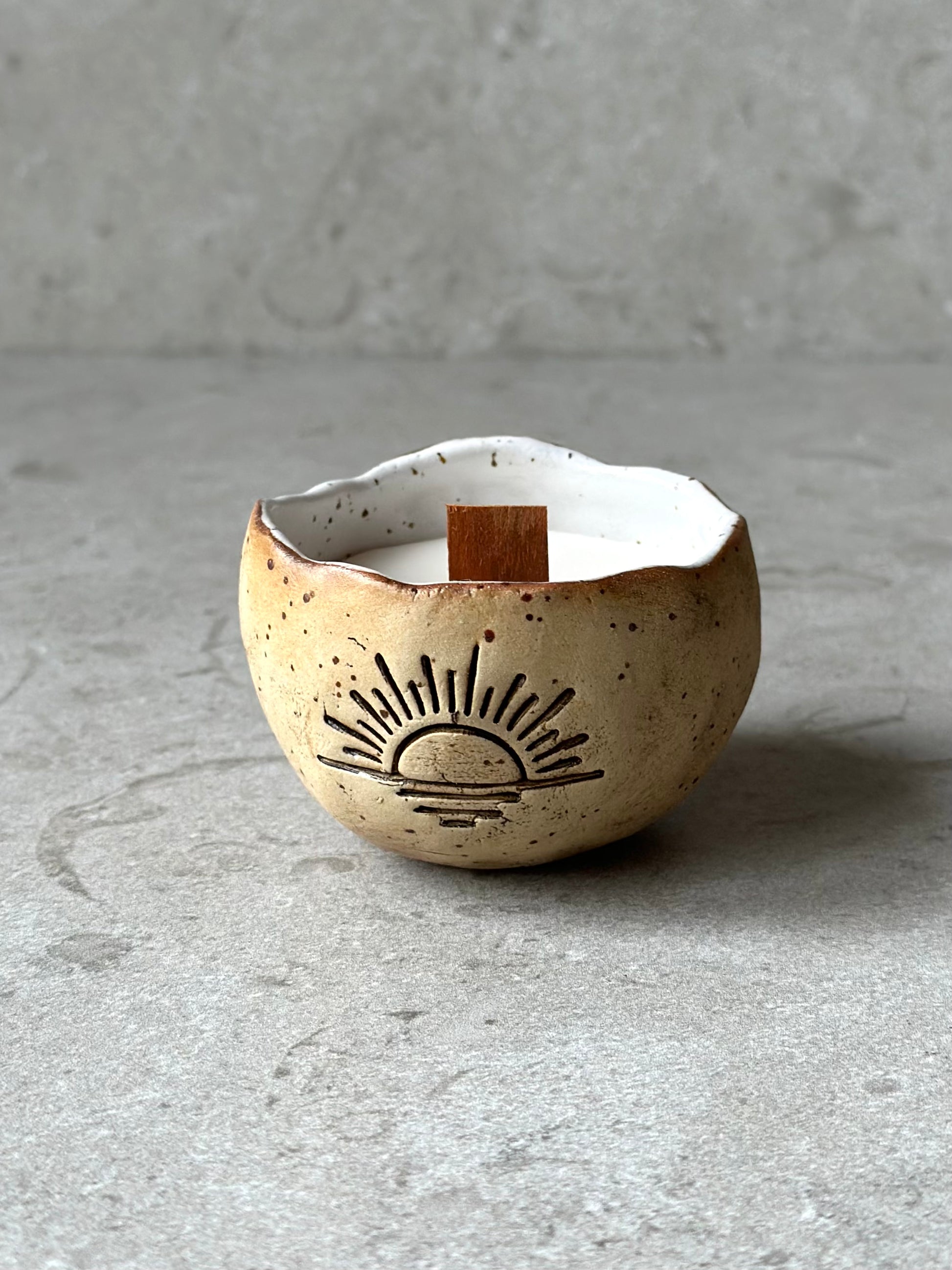 Skål i prickig stengodslera, rå på utsidan och med vit glasyr. Dekorerad med en infärgad solnedgång på sidan.