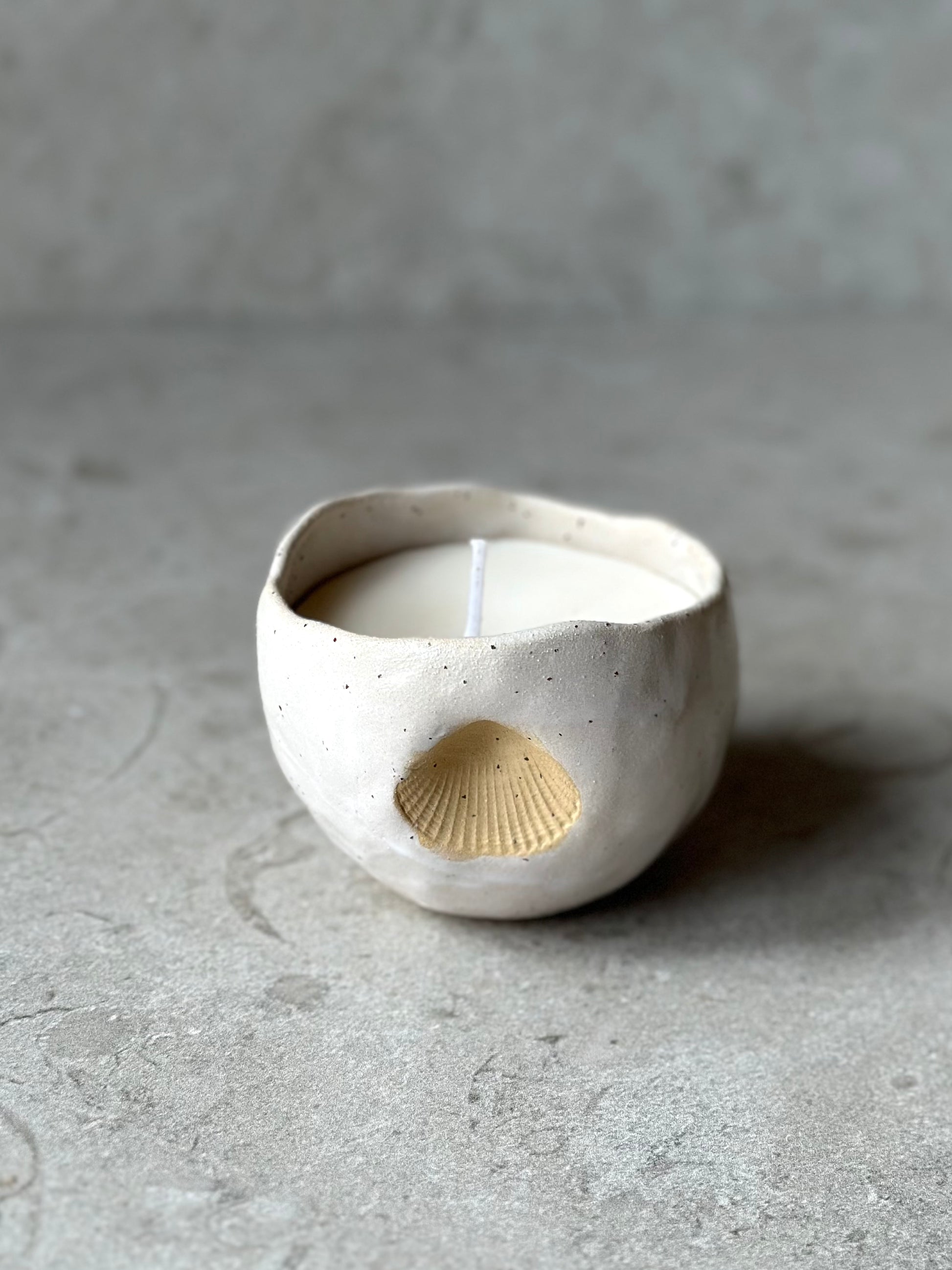 Skål i prickig stengodslera med vit glasyr, dekorerad med en snäcka på sidan.
