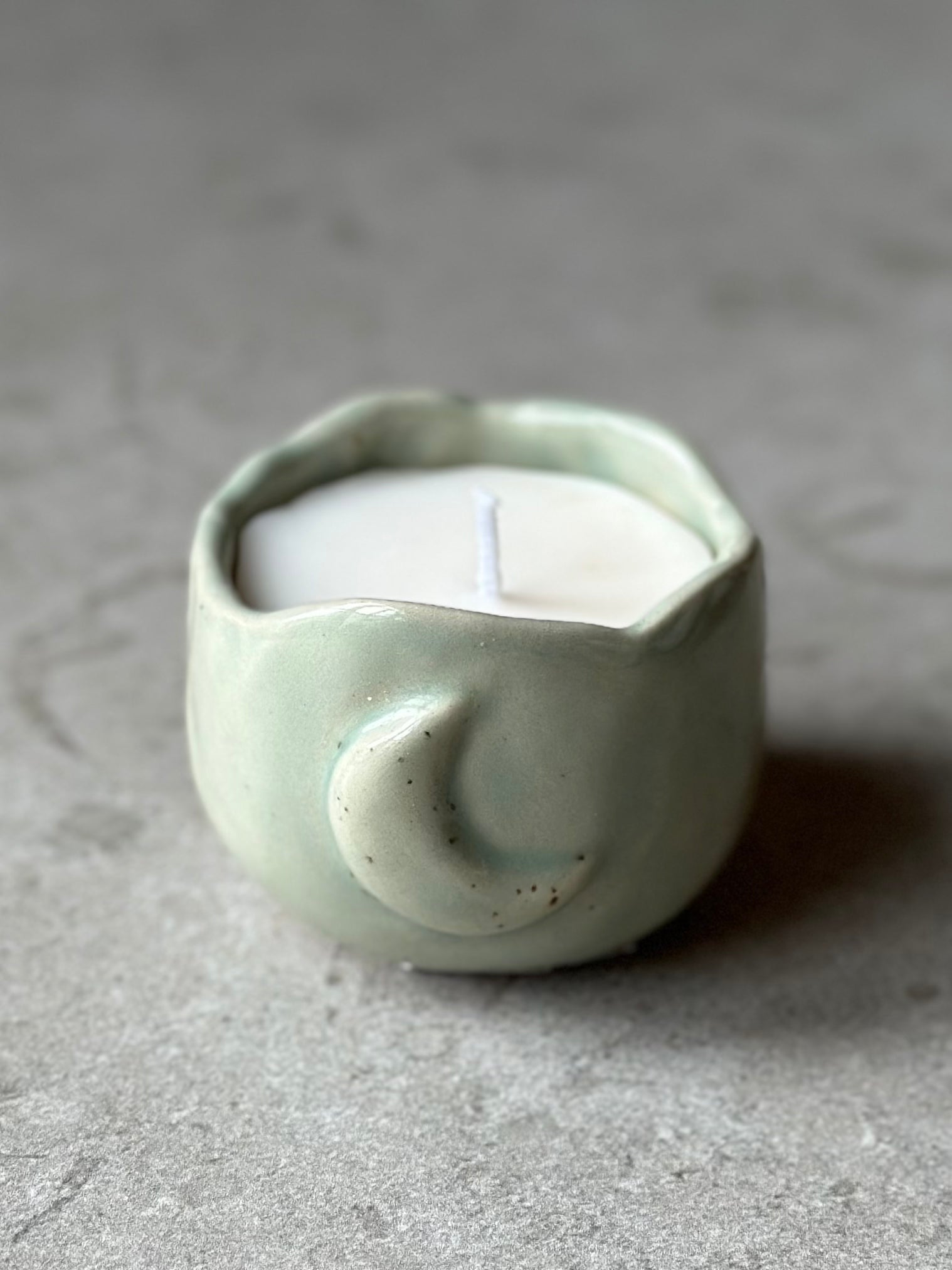 Skål av stengods med ljus mintgrön glasyr dekorerad med en måne på sidan.