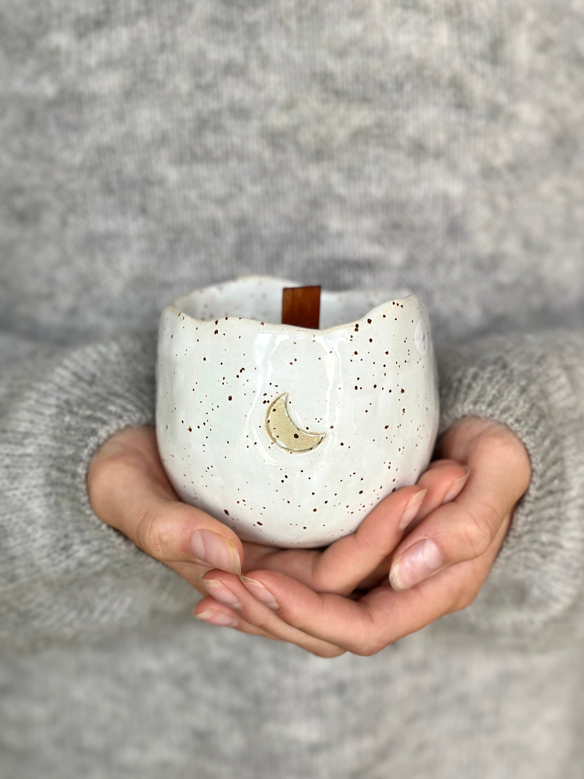 Skål/mugg i prickigstengodslera med vit glasyr. Dekorerad med en måne på sidan.