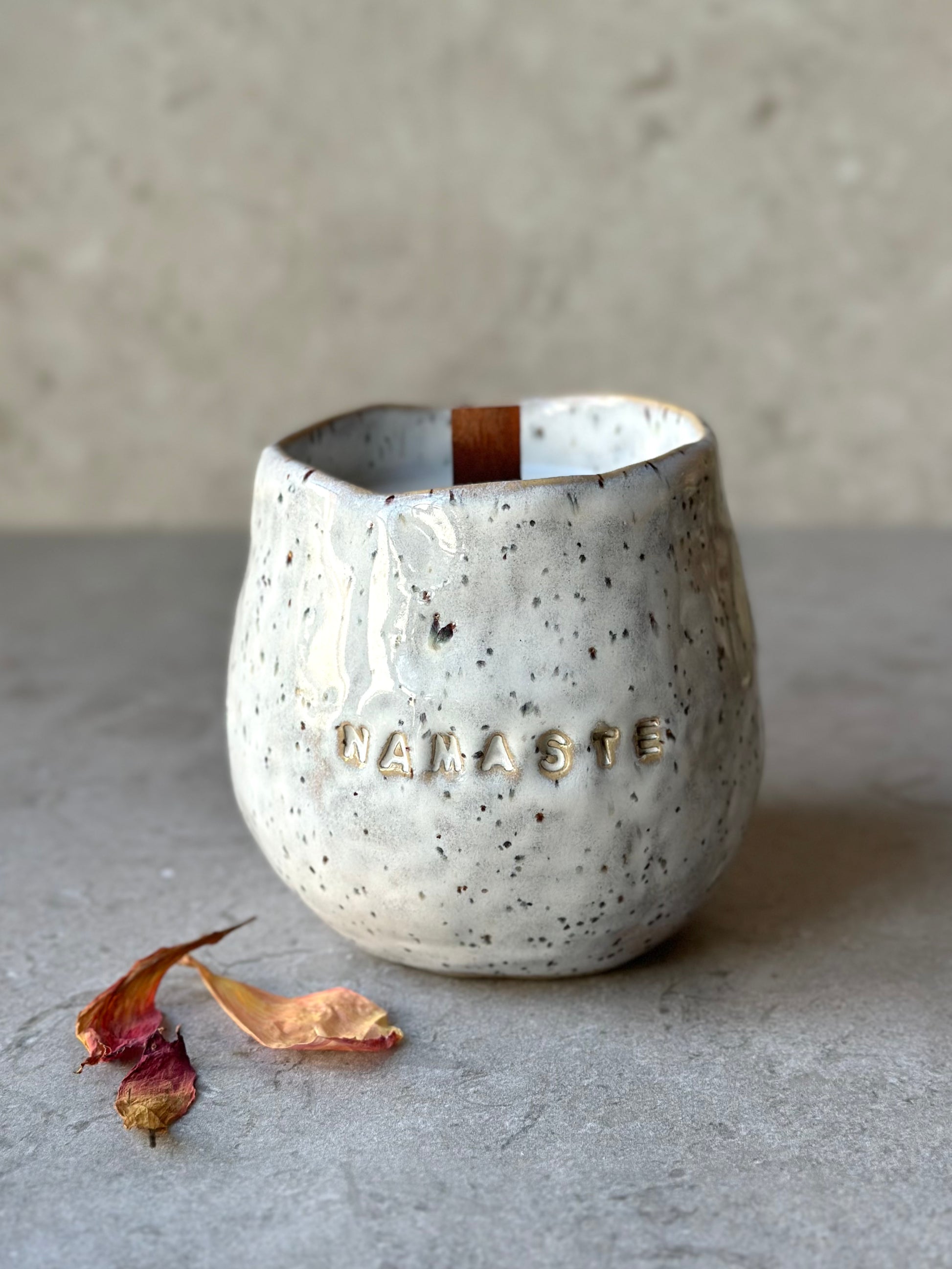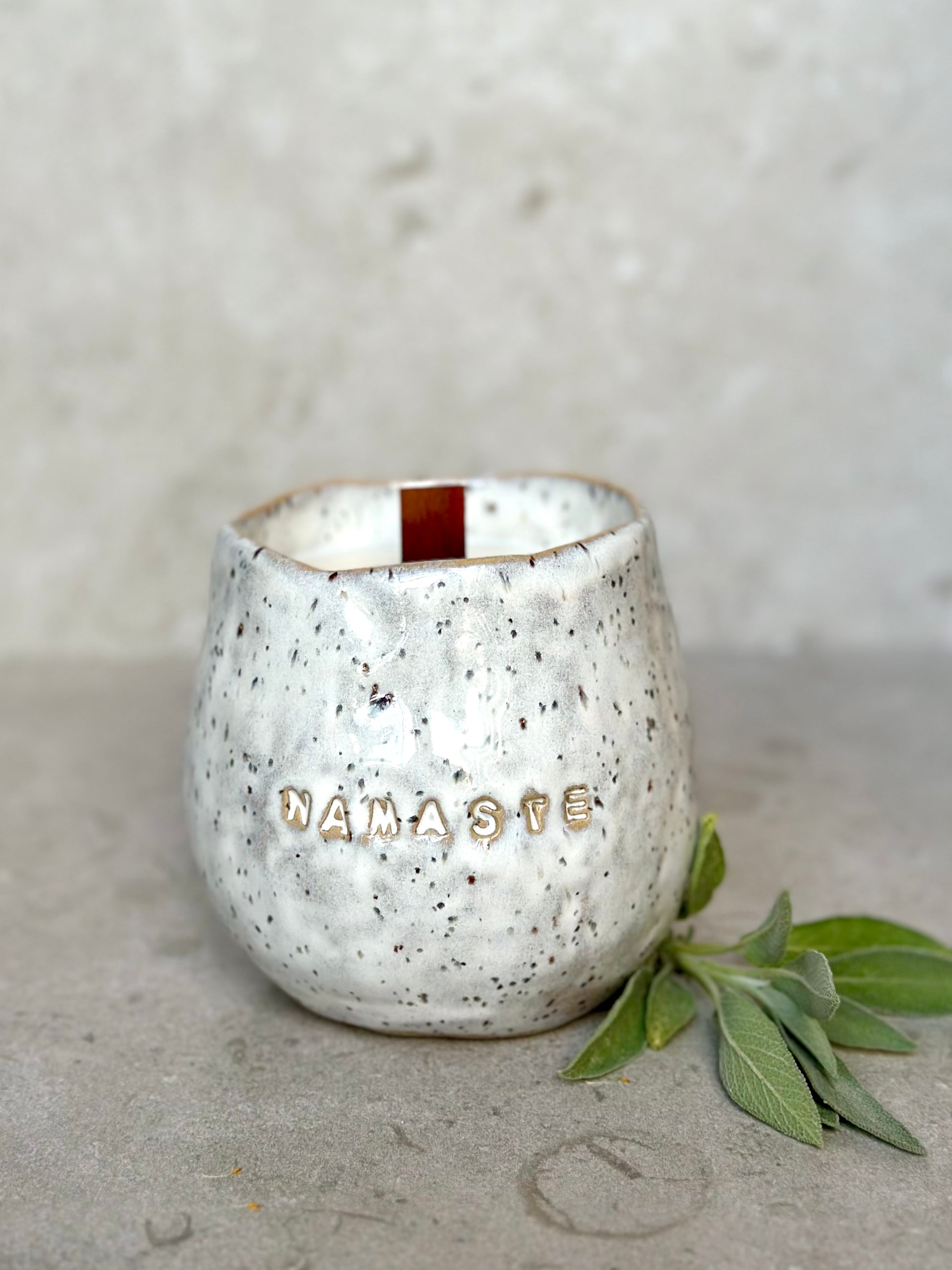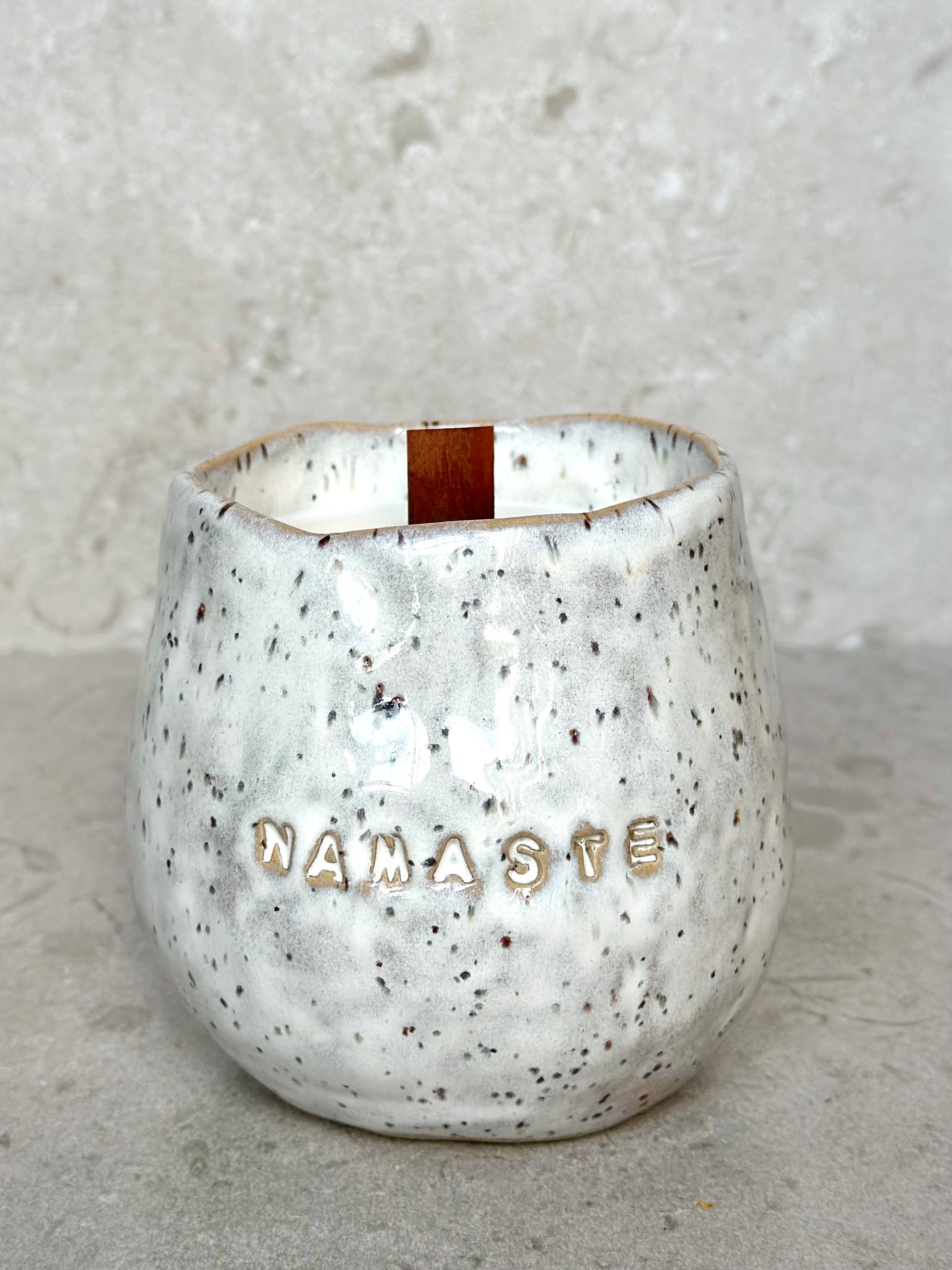 Skål i prickig stengodslera med cremevit glasyr, dekorerad med ordet NAMASTE på sidan.
