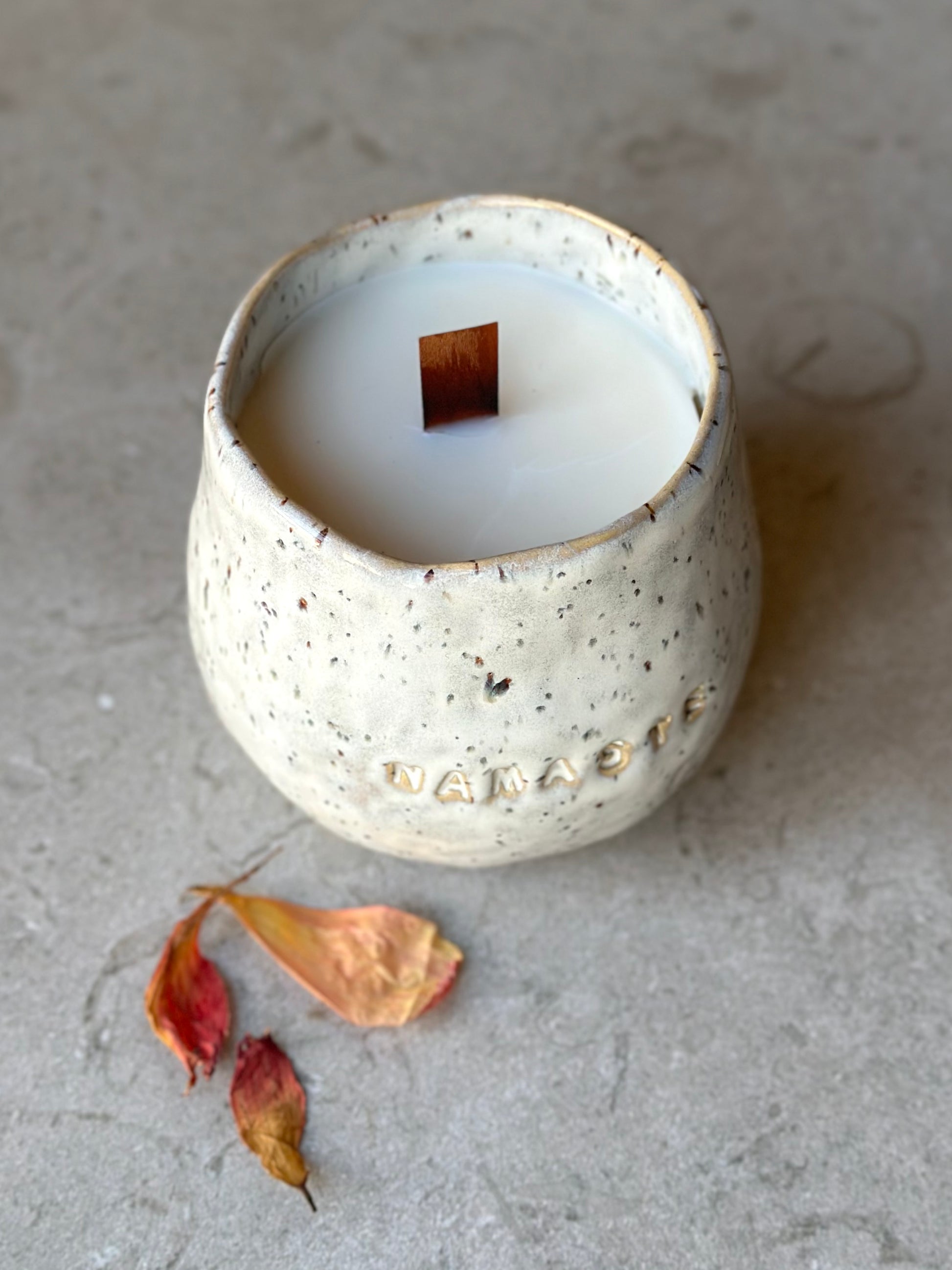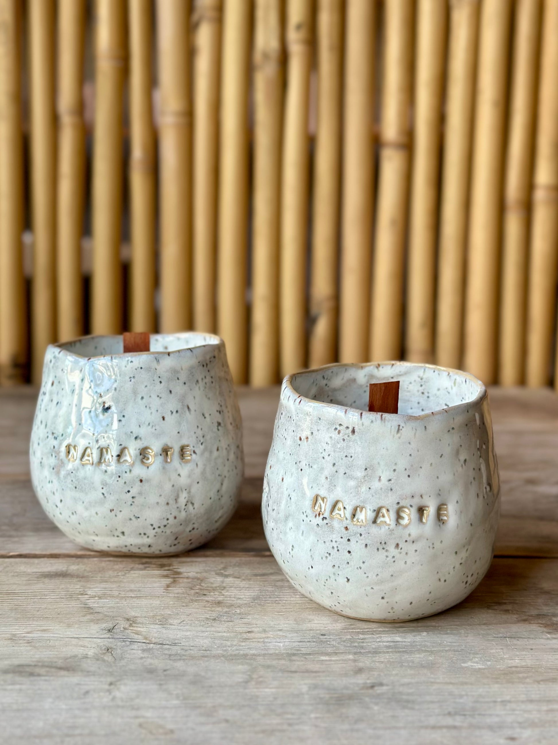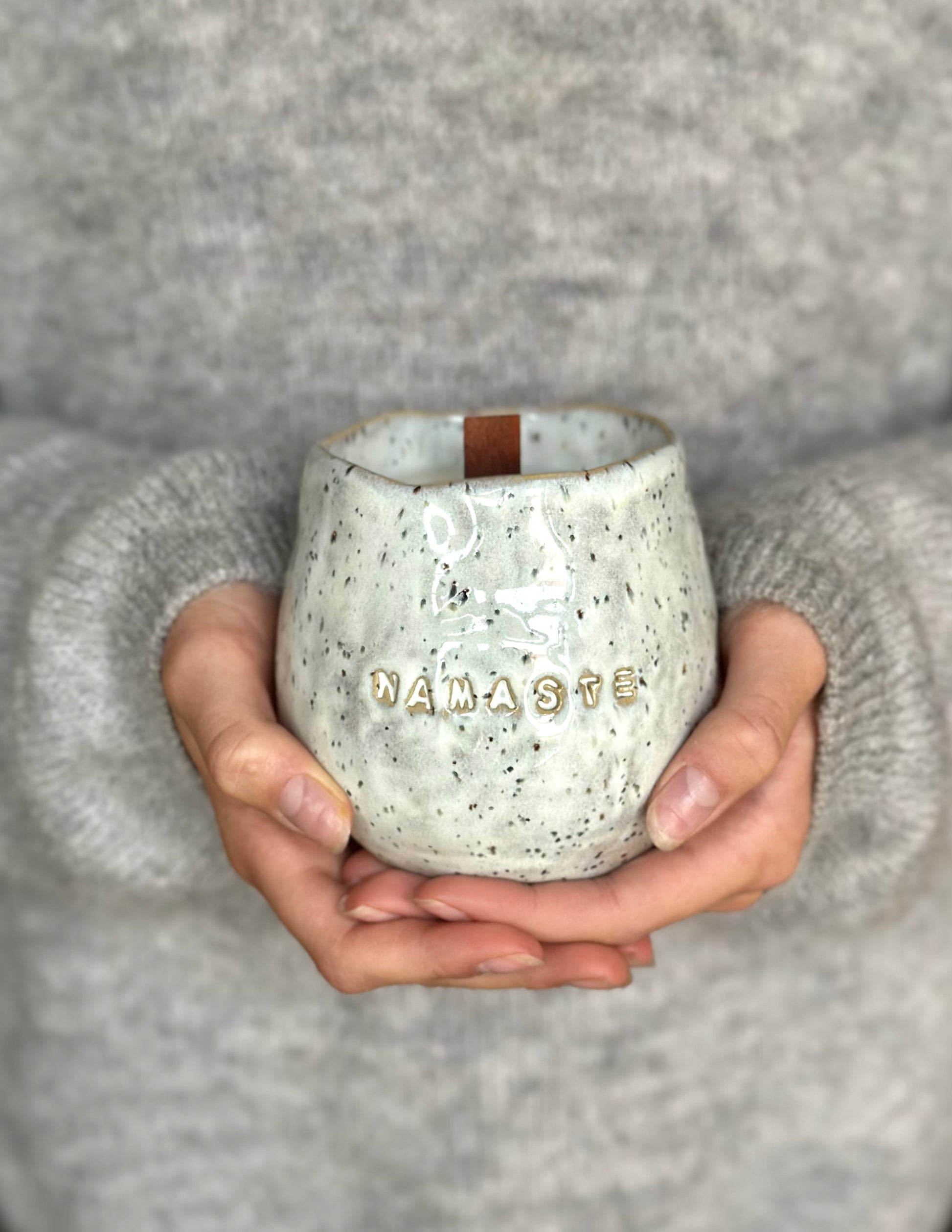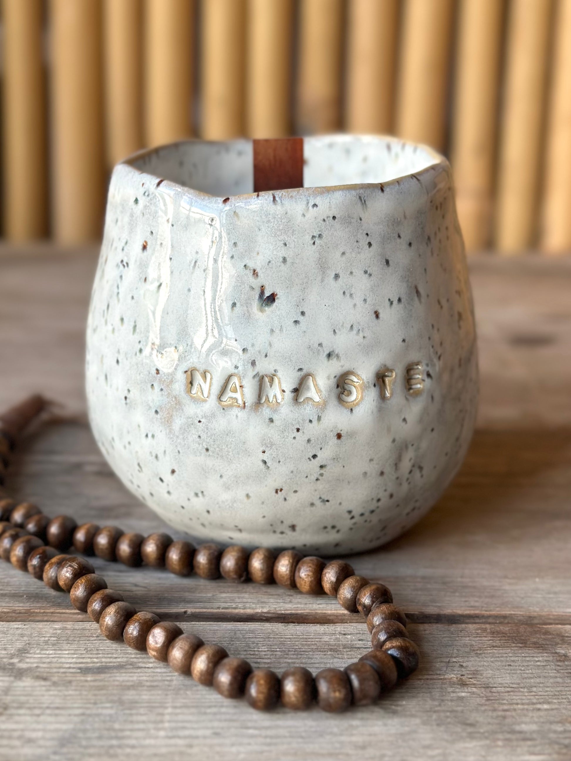 Skål i prickig stengodslera med cremevit glasyr, dekorerad med ordet NAMASTE på sidan.