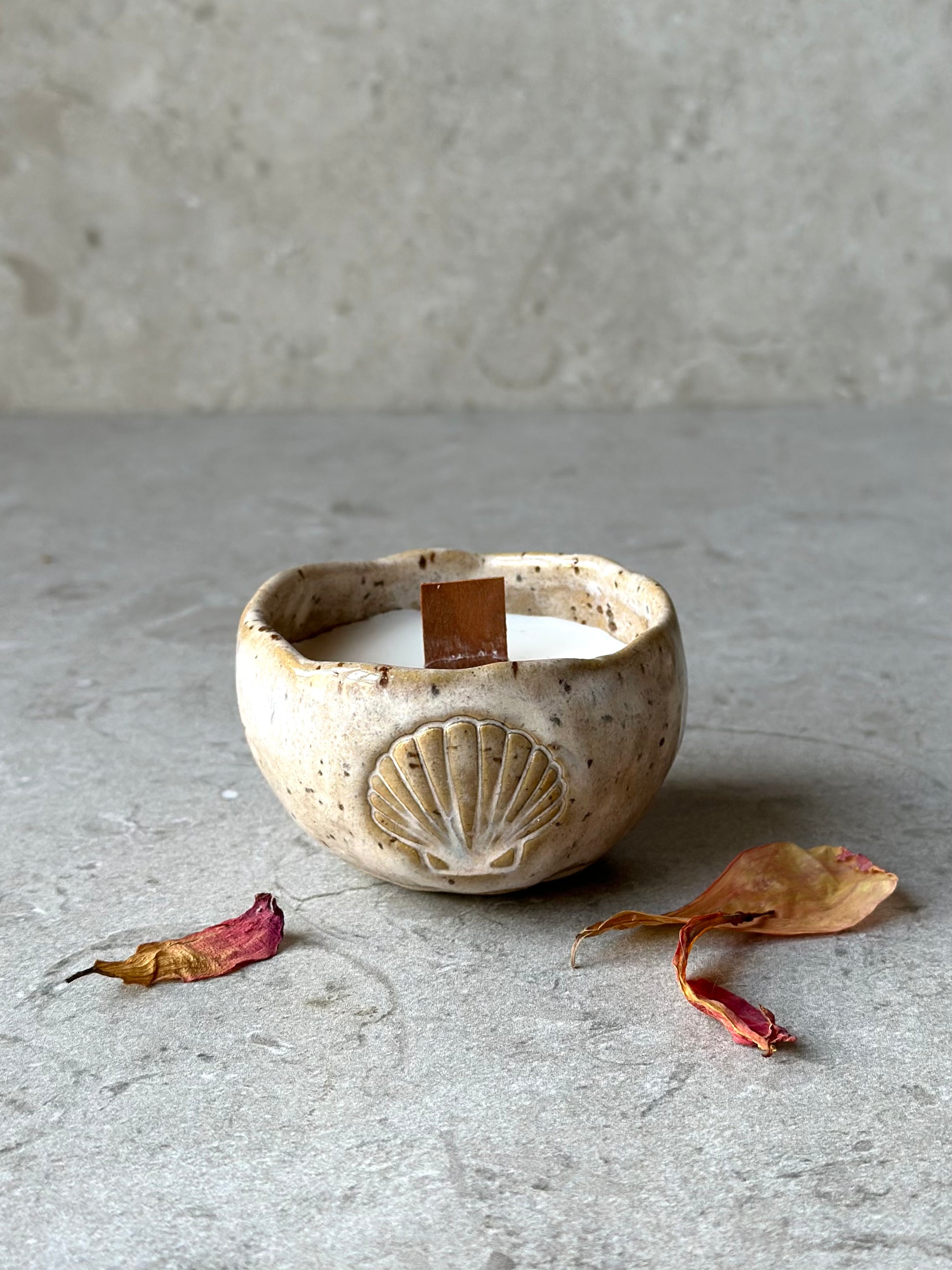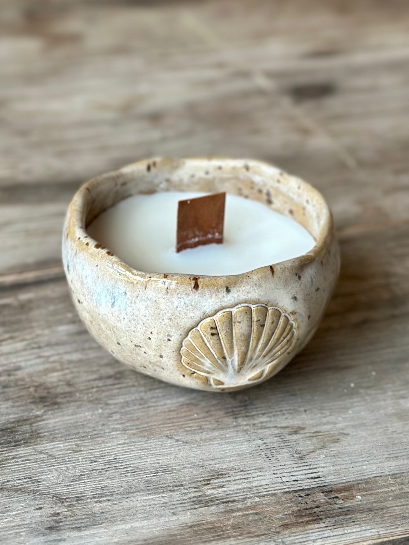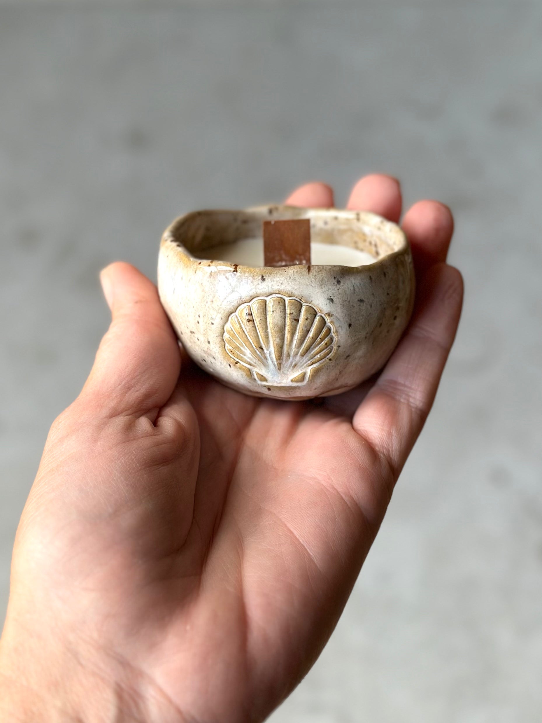 Skål i prickig stengodslera med cremevit/beige glasyr, dekorerad med en snäcka på sidan.