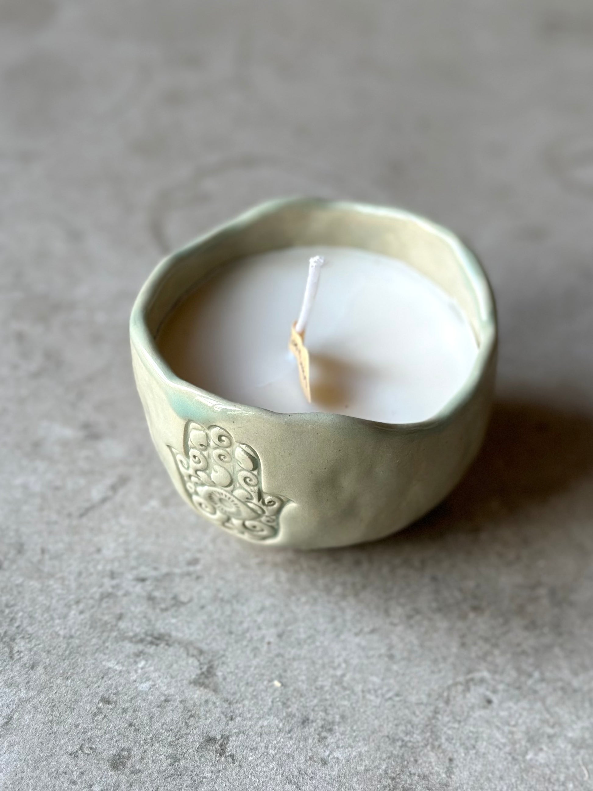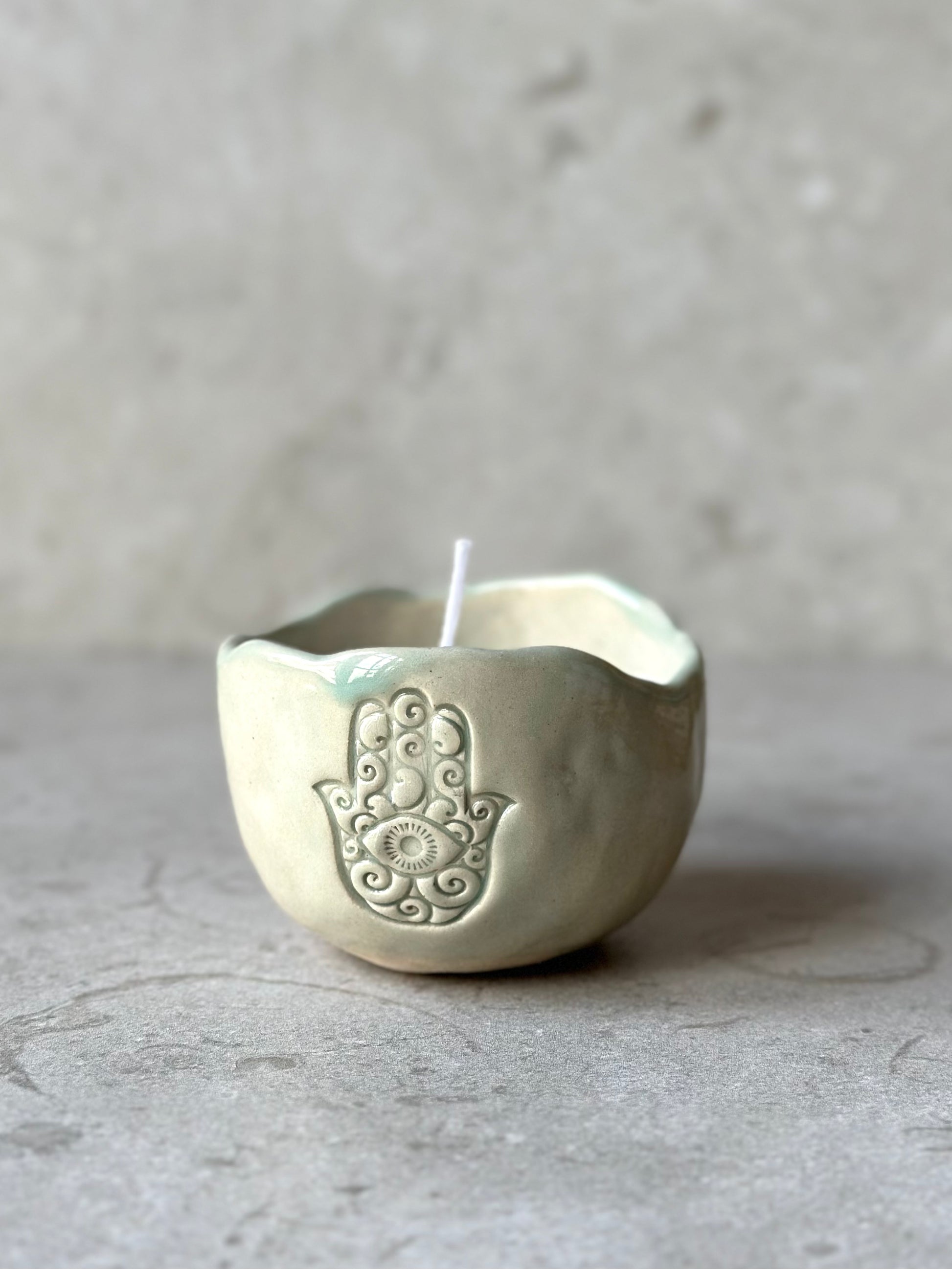 Skål av stengods med ljus mintgrön glasyr dekorerad med en hamsa-hand på sidan.