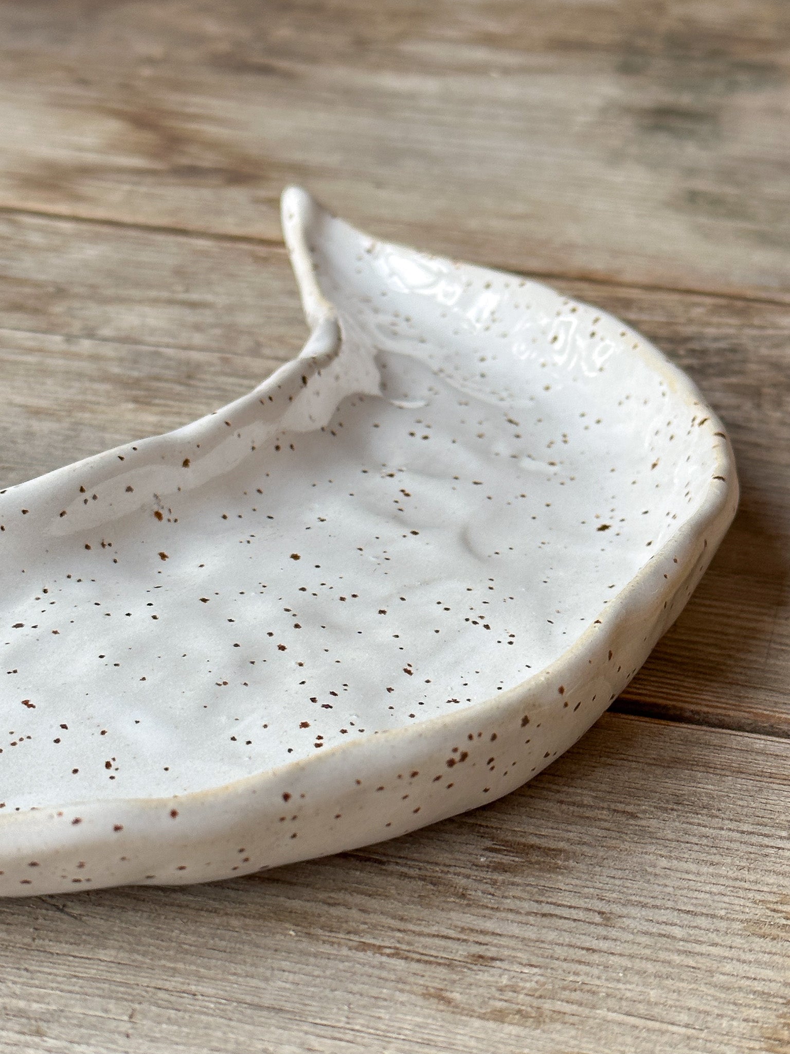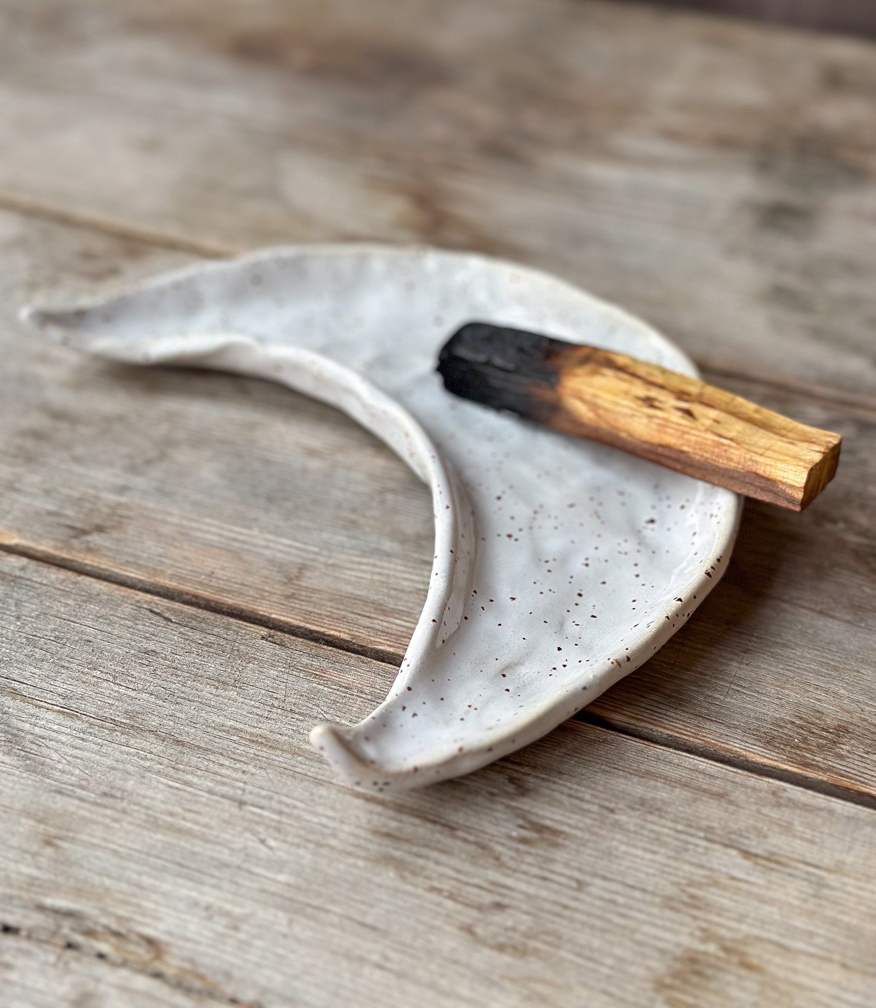 Dekorativt fat i form av en måne, perfekt för din Palo santo, dina smycken eller kristaller. Tillverkat i en prickig stengodslera och glaserat i en vit glasyr.