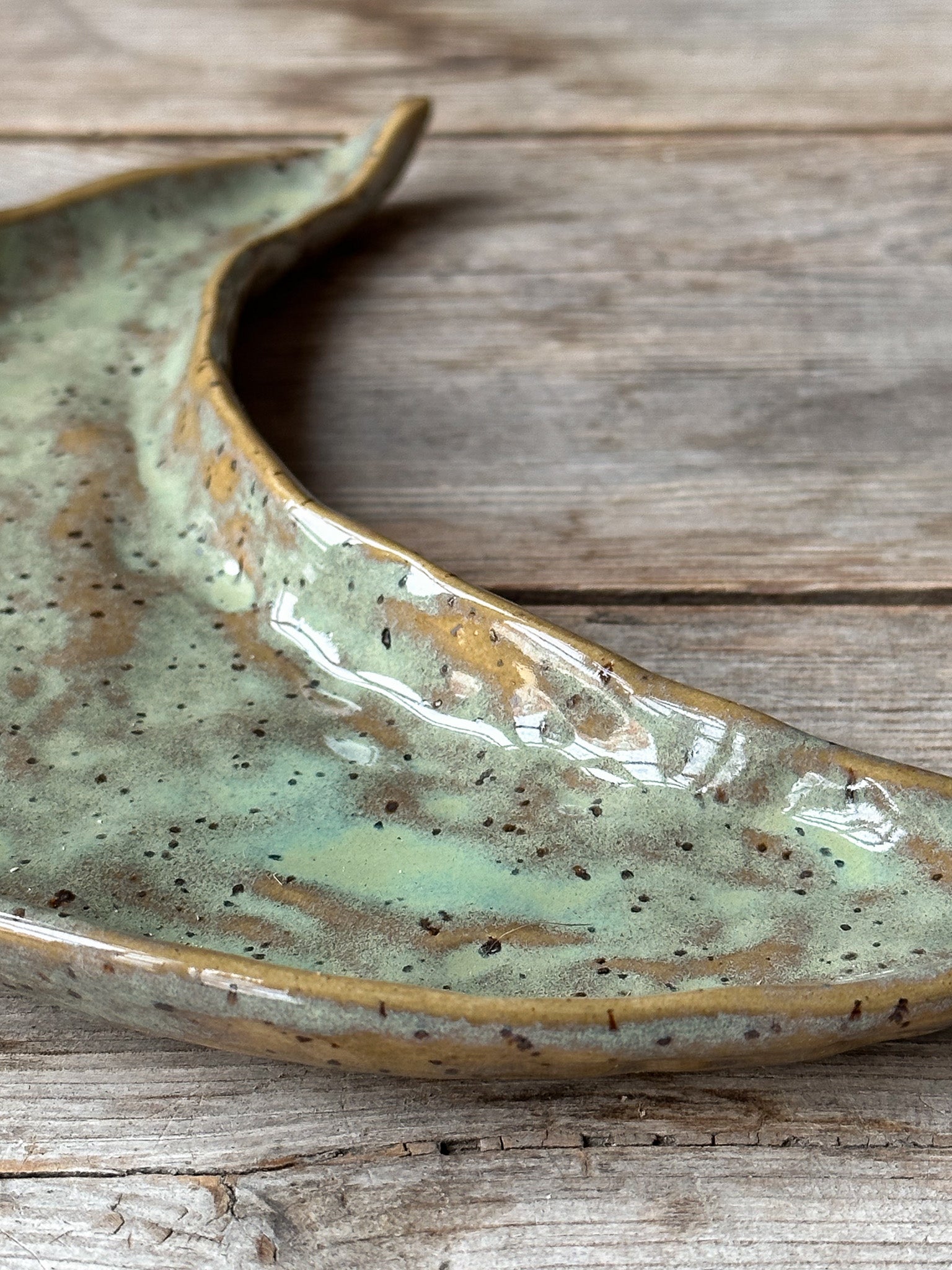 Dekorativt fat i form av en måne, perfekt för din Palo santo, dina smycken eller kristaller. Glaserat i en havsgrön glasyr.