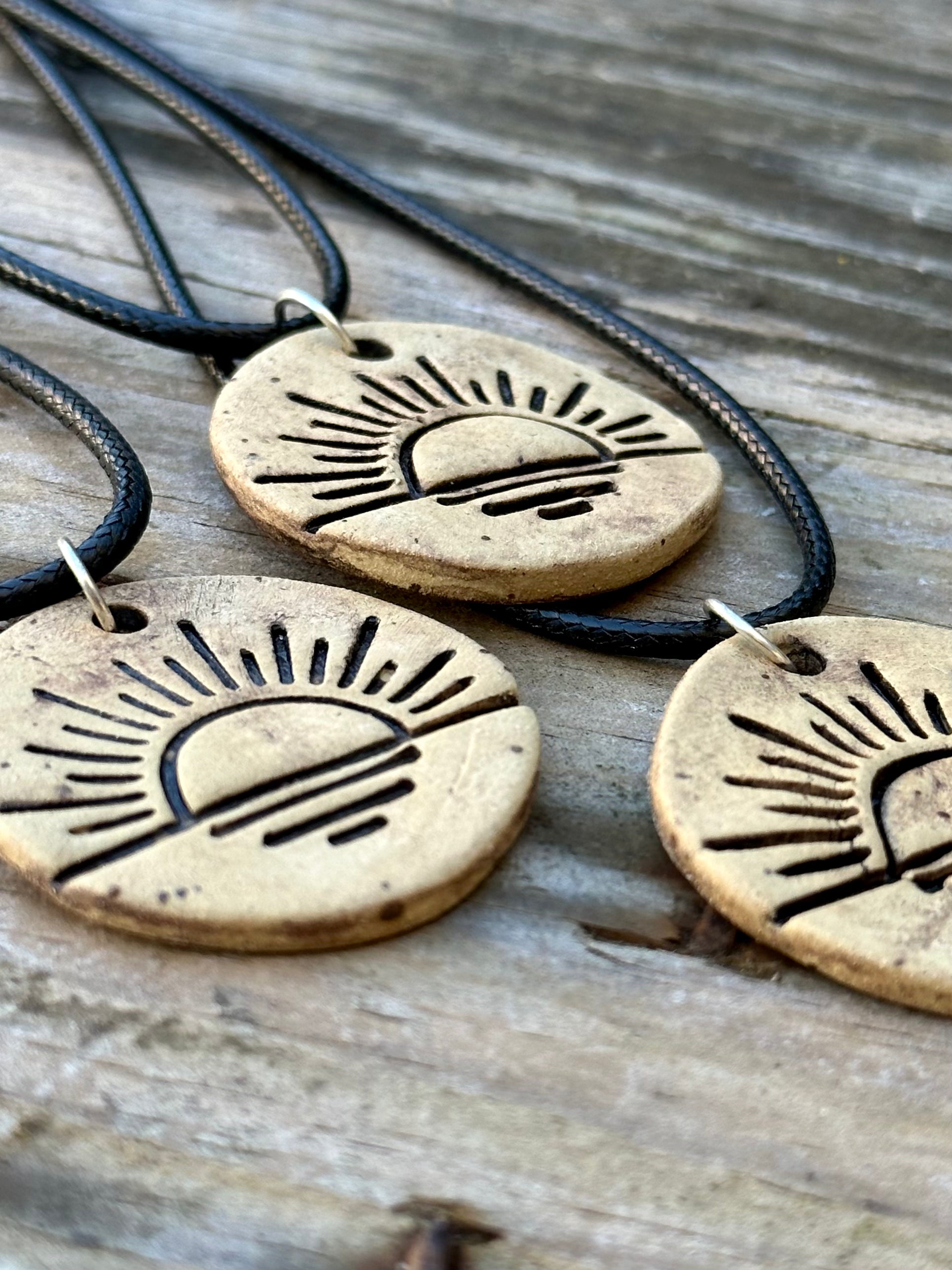 Ett lite kortare halsband i keramik som ligger nära halsen. Den råbrända runda brickan är stämplad med en solnedgång (eller soluppgång om man så önskar) och hänger på ett svart, vaxat snöre med ett spänne i silver.