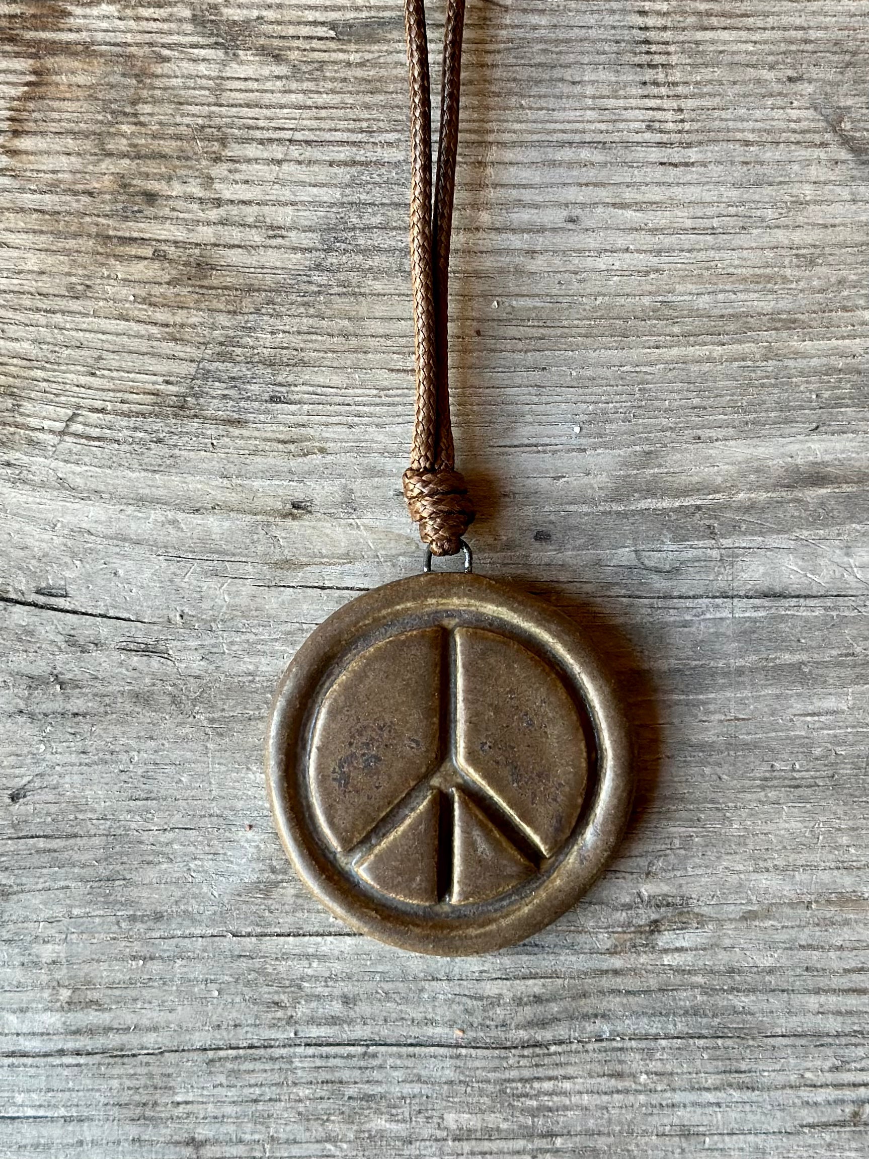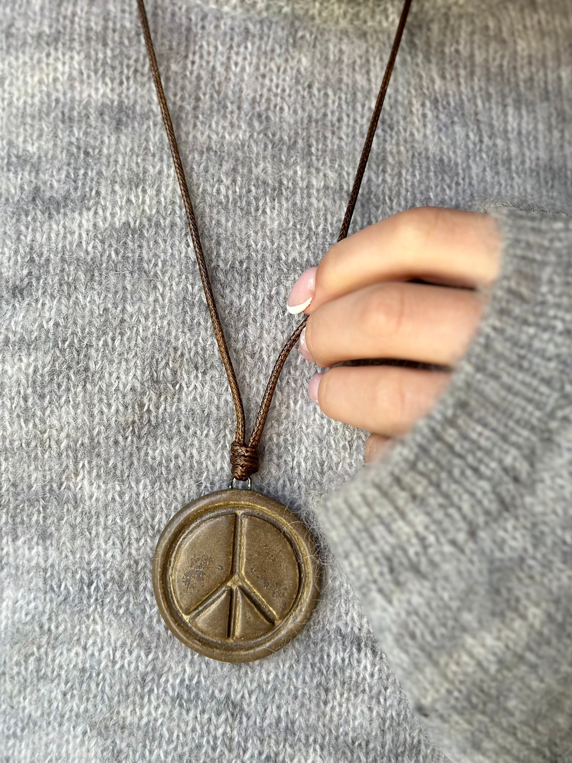 Ett lite längre halsband med ett peace-tecken i stengodskeramik med matt brun glasyr. Det bruna vaxade snöret är justerbart, så att du kan bära smycket precis som du vill. En påminnelse om fred, harmoni och naturens skönhet.