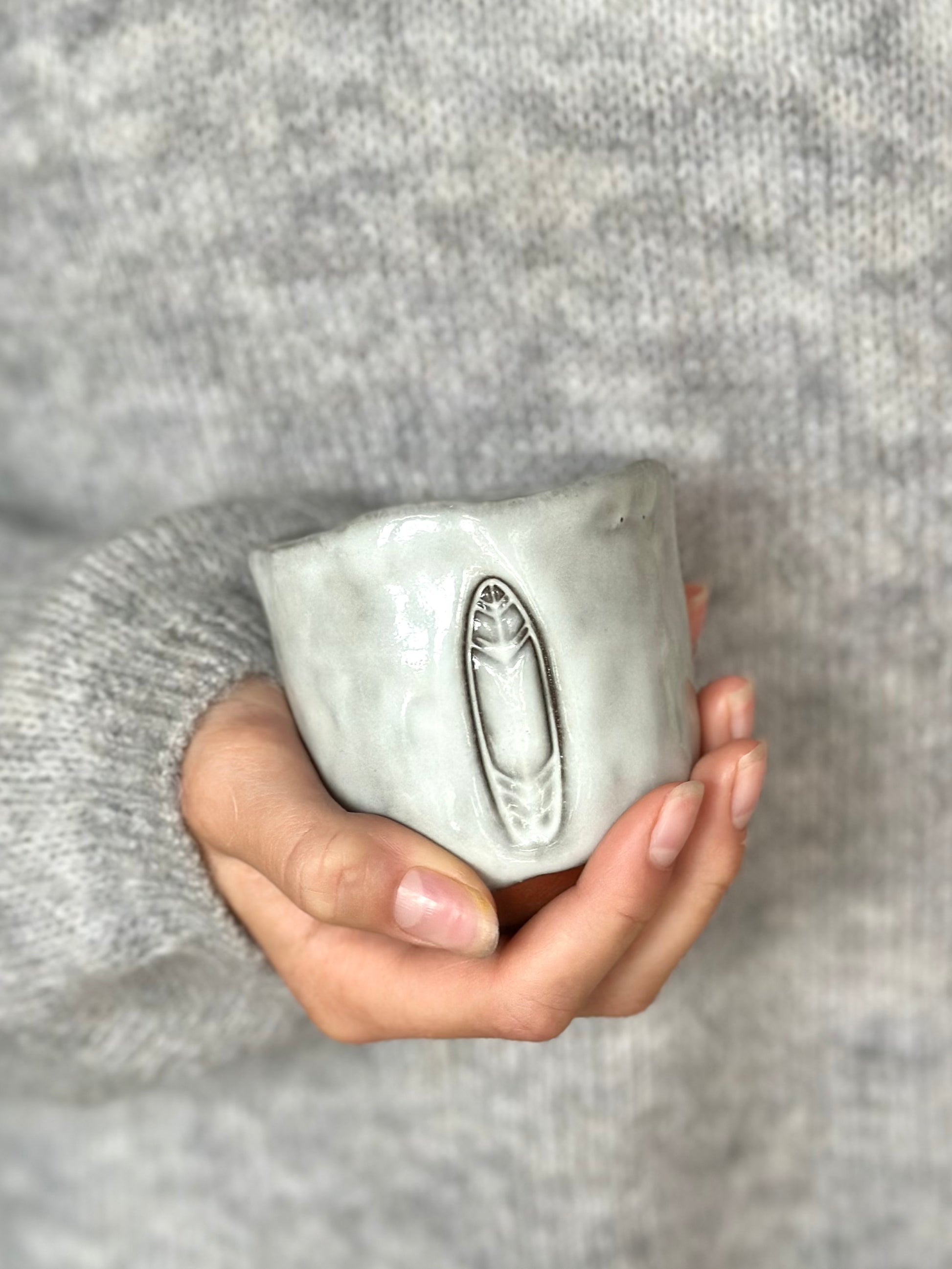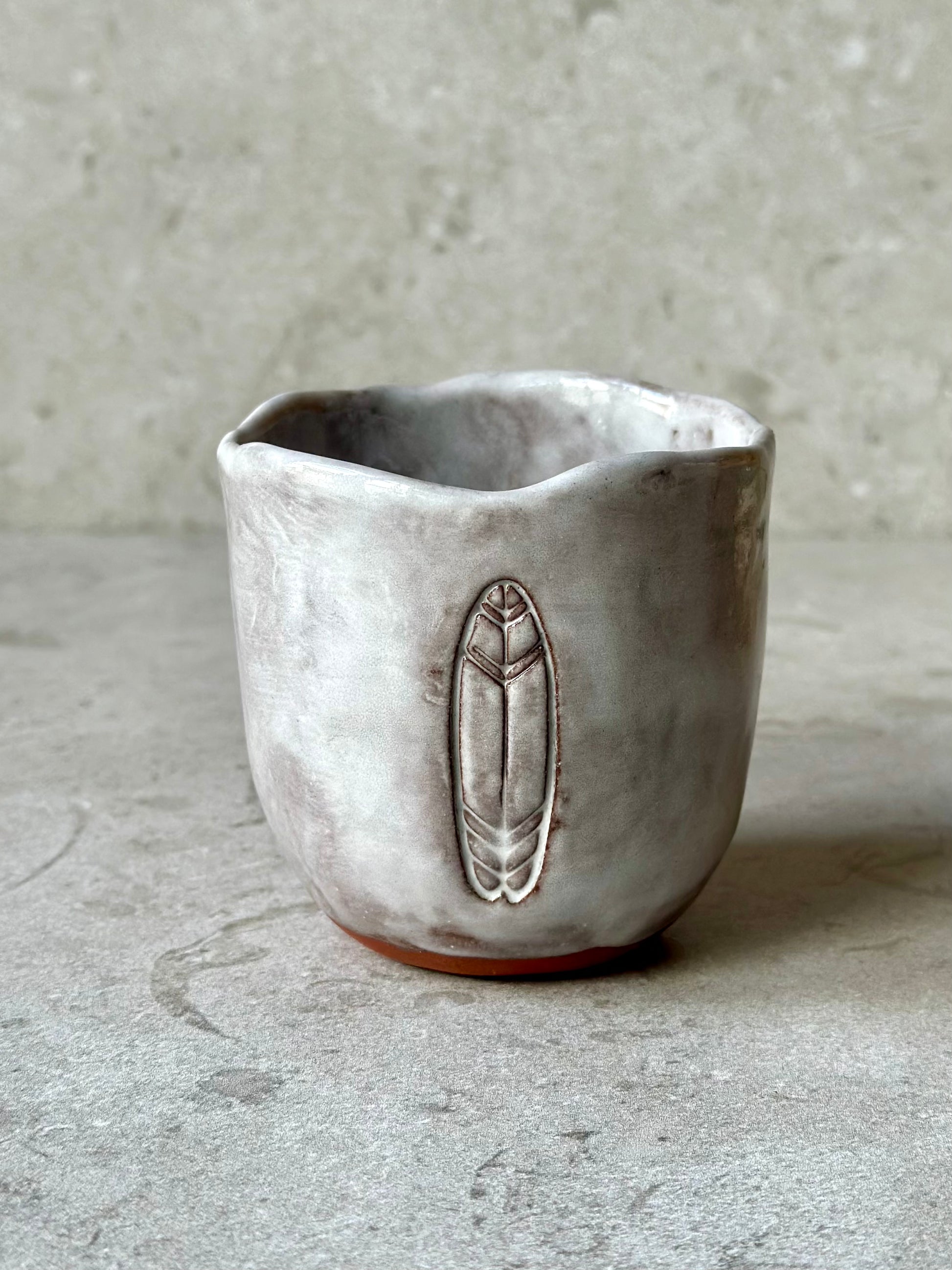 Tummad mugg i brunröd stengodslera med en gråvit glasyr. Dekorerad med en surfbräda på sidan.