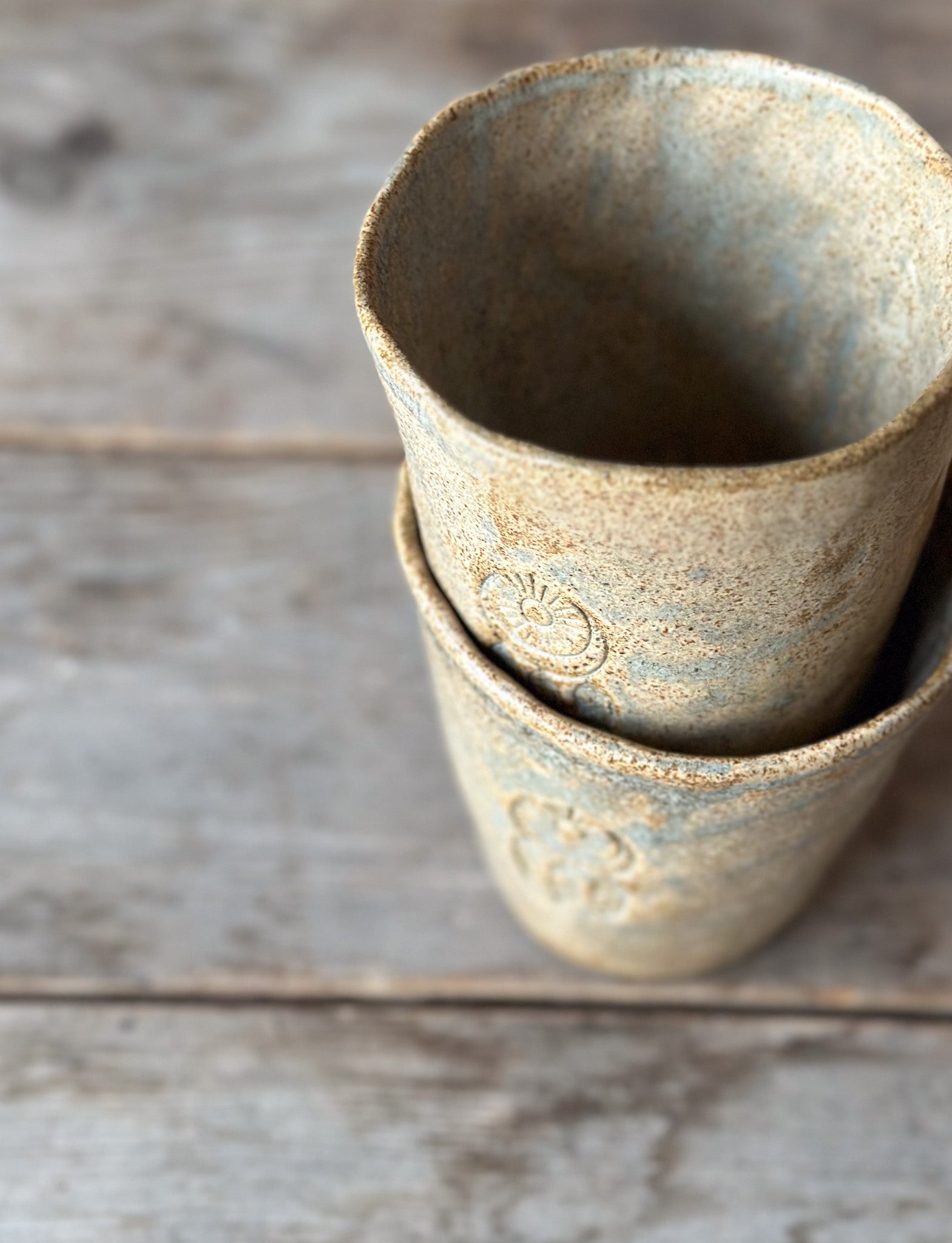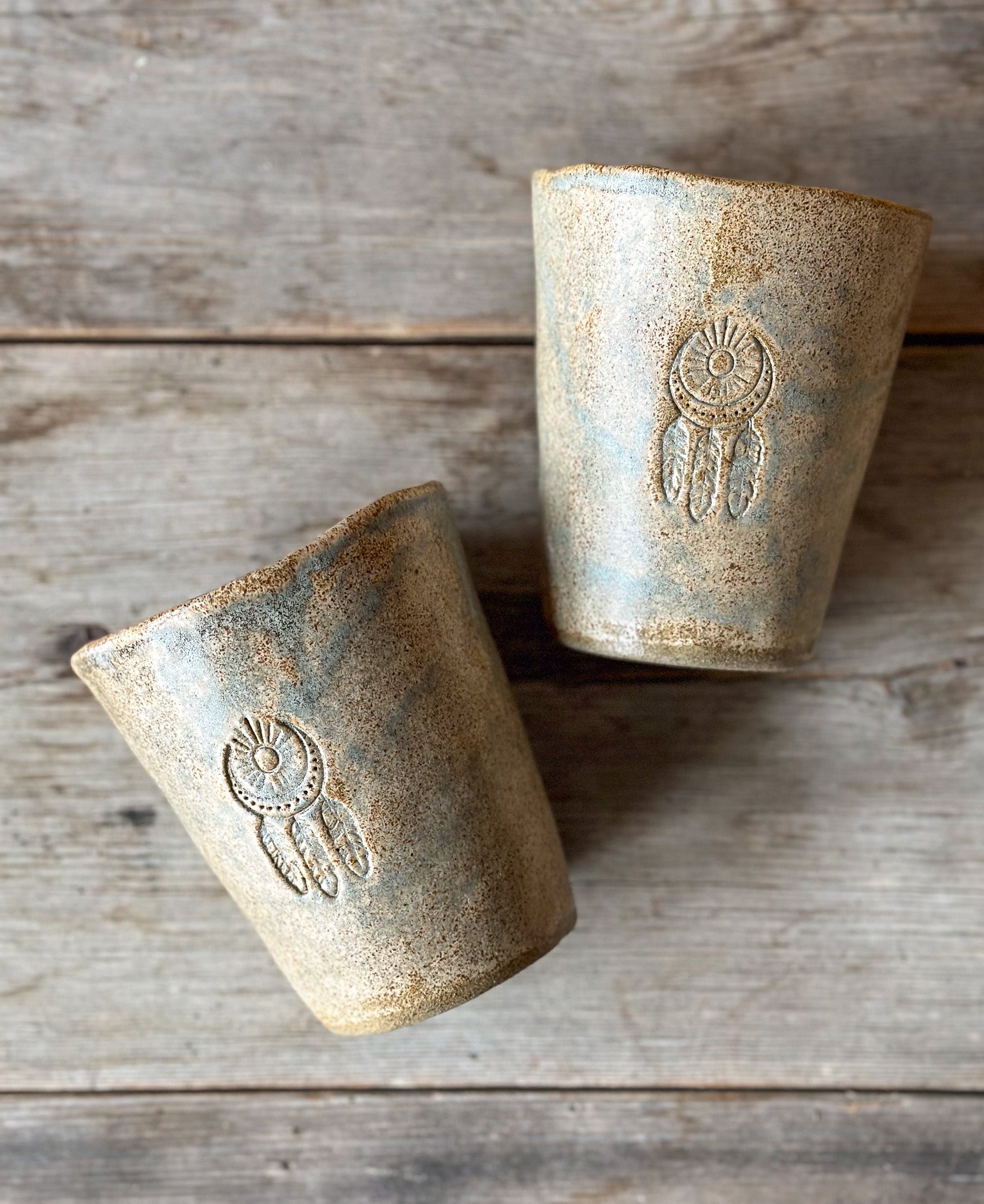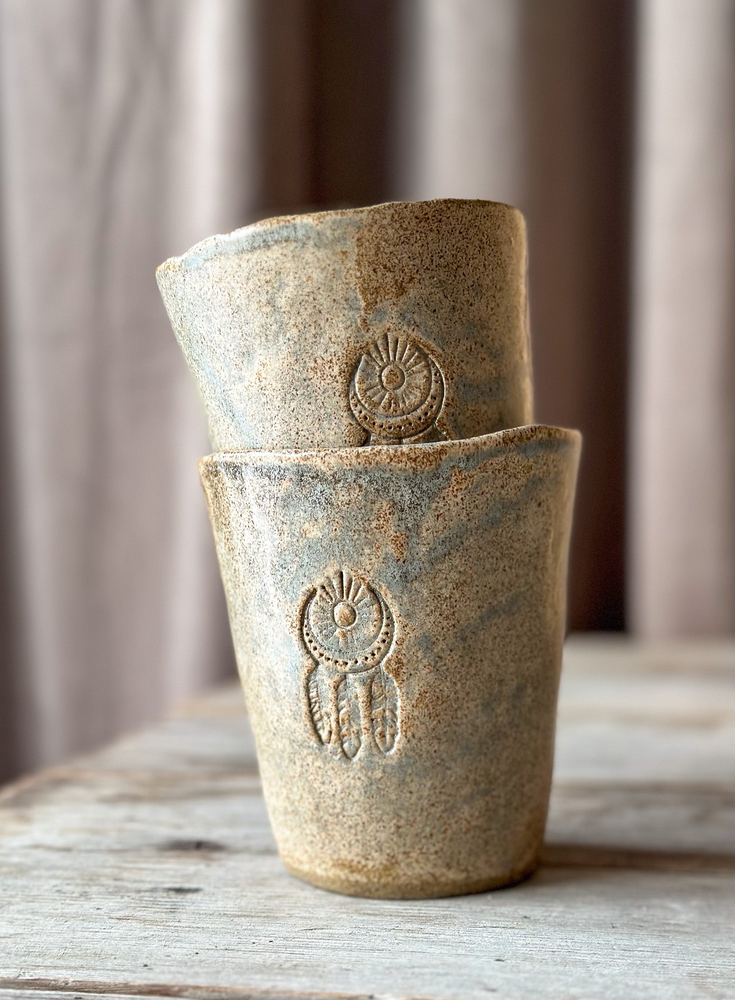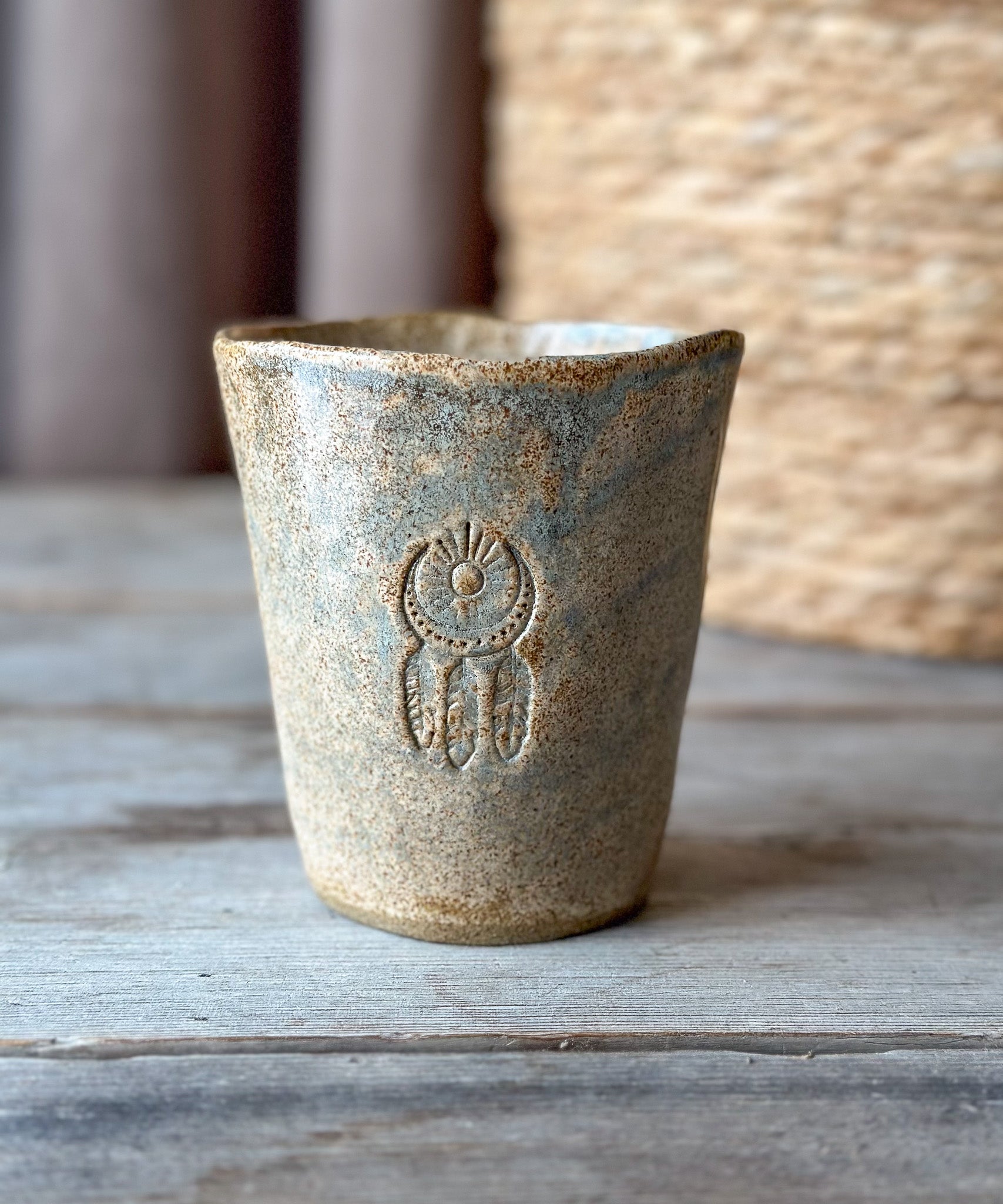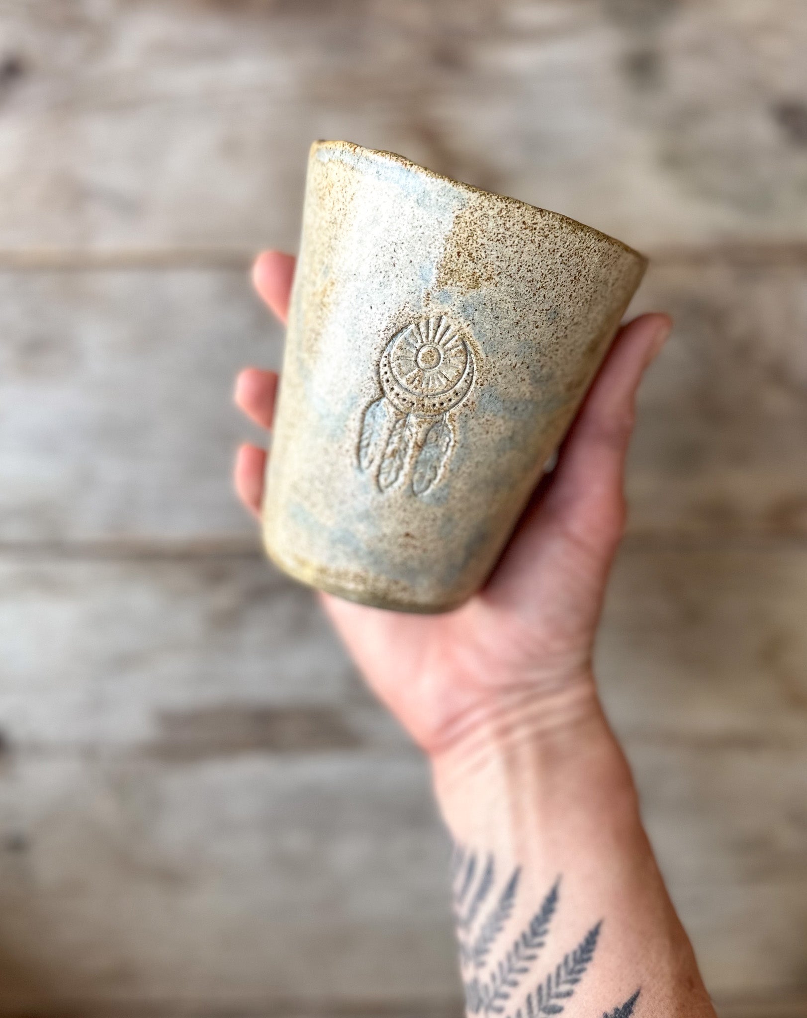 Handgjord mugg i mörk stengodslera, dekorerad med en drömfångare. Glaserad i en beige matt glasyr.