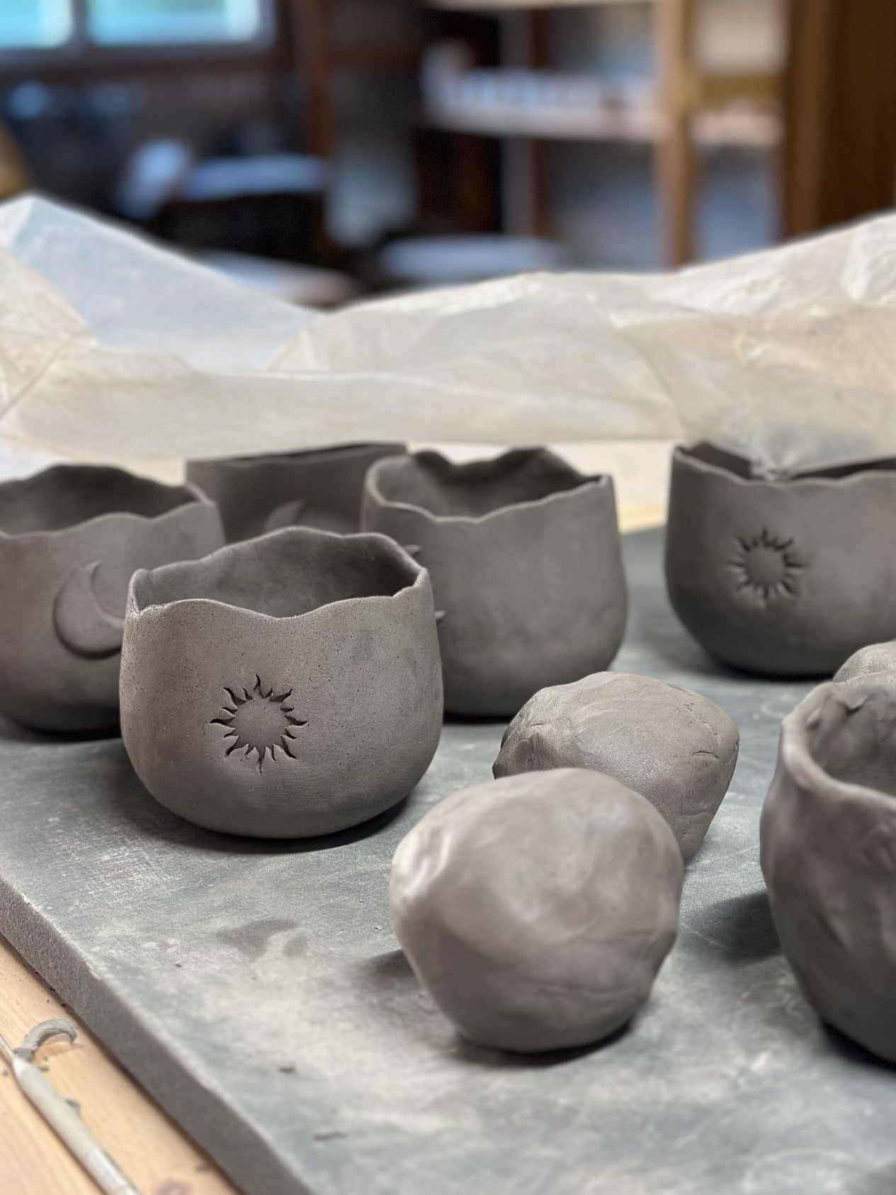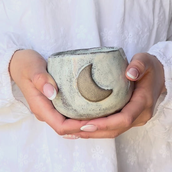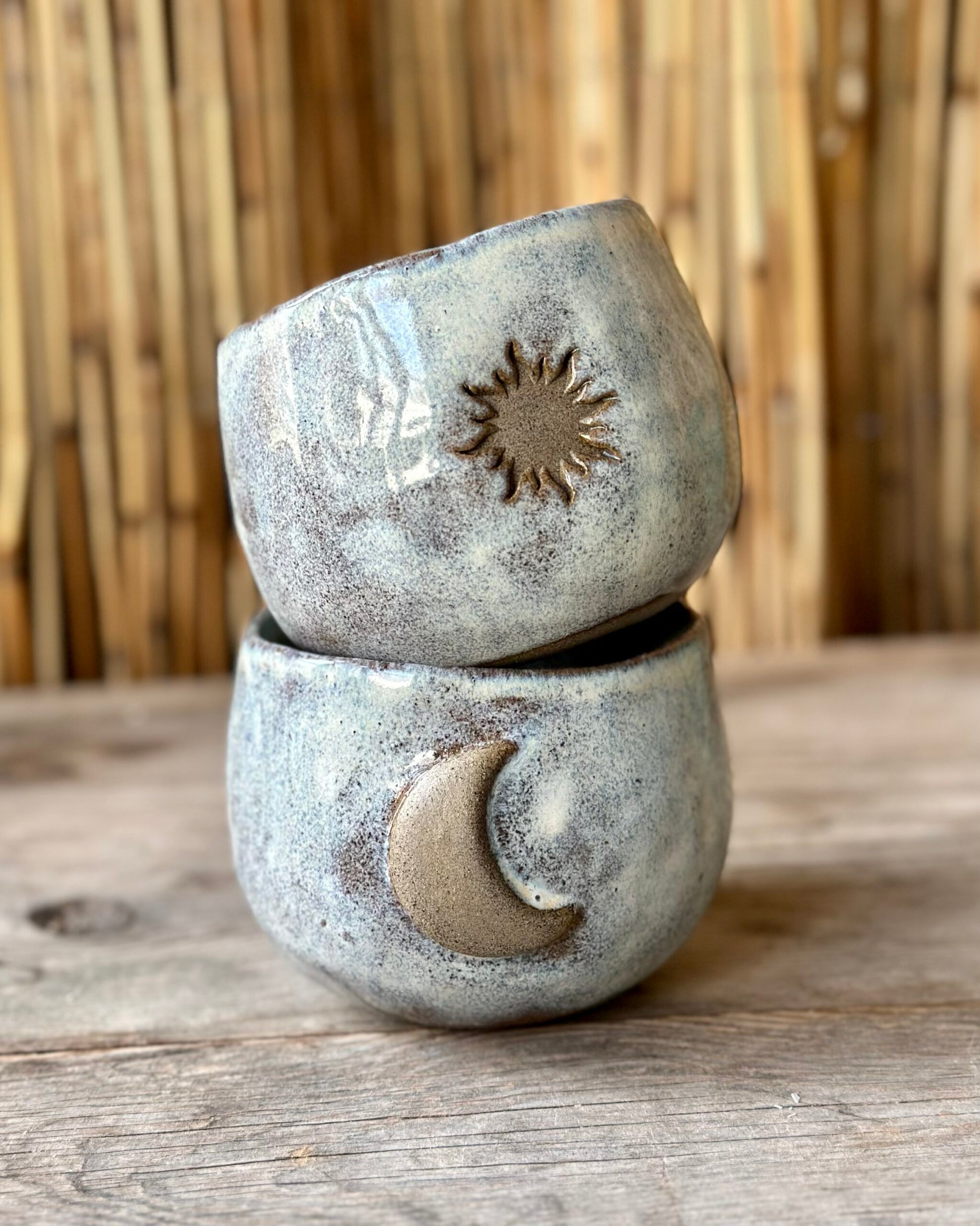 Handgjord tummad mugg i mörkgrå lera i en mjukt rundad form. Dekorerad med en sol på ena sidan och en måne på den andra – en påminnelse om balansen mellan ljus och mörker, dag och natt. Den cremevita glasyren ger en mjuk, harmonisk känsla, perfekt för din kakao-ceremoni eller en stilla stund med te.