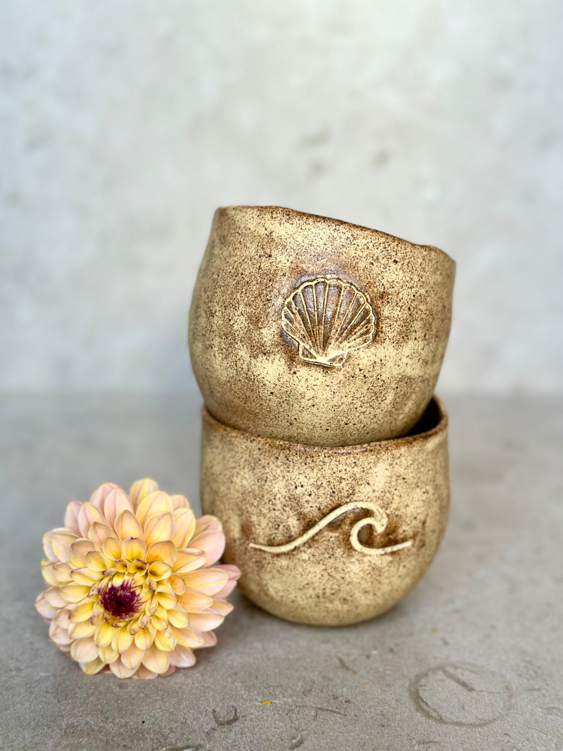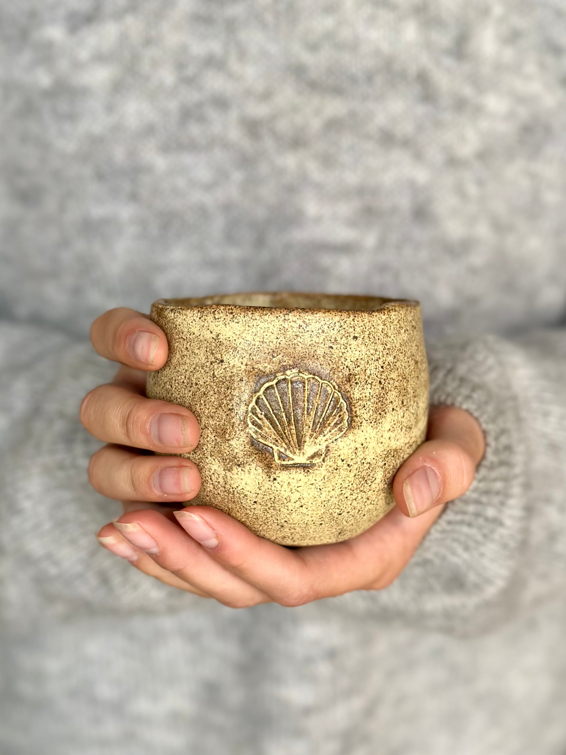 Tummad mugg mörkgrå stengodslera glaserad med en matt sandinspirerad glasyr i beige med bruna inslag. Dekorerad med ett motiv på sidan. Välj mellan Wave eller Seashell.