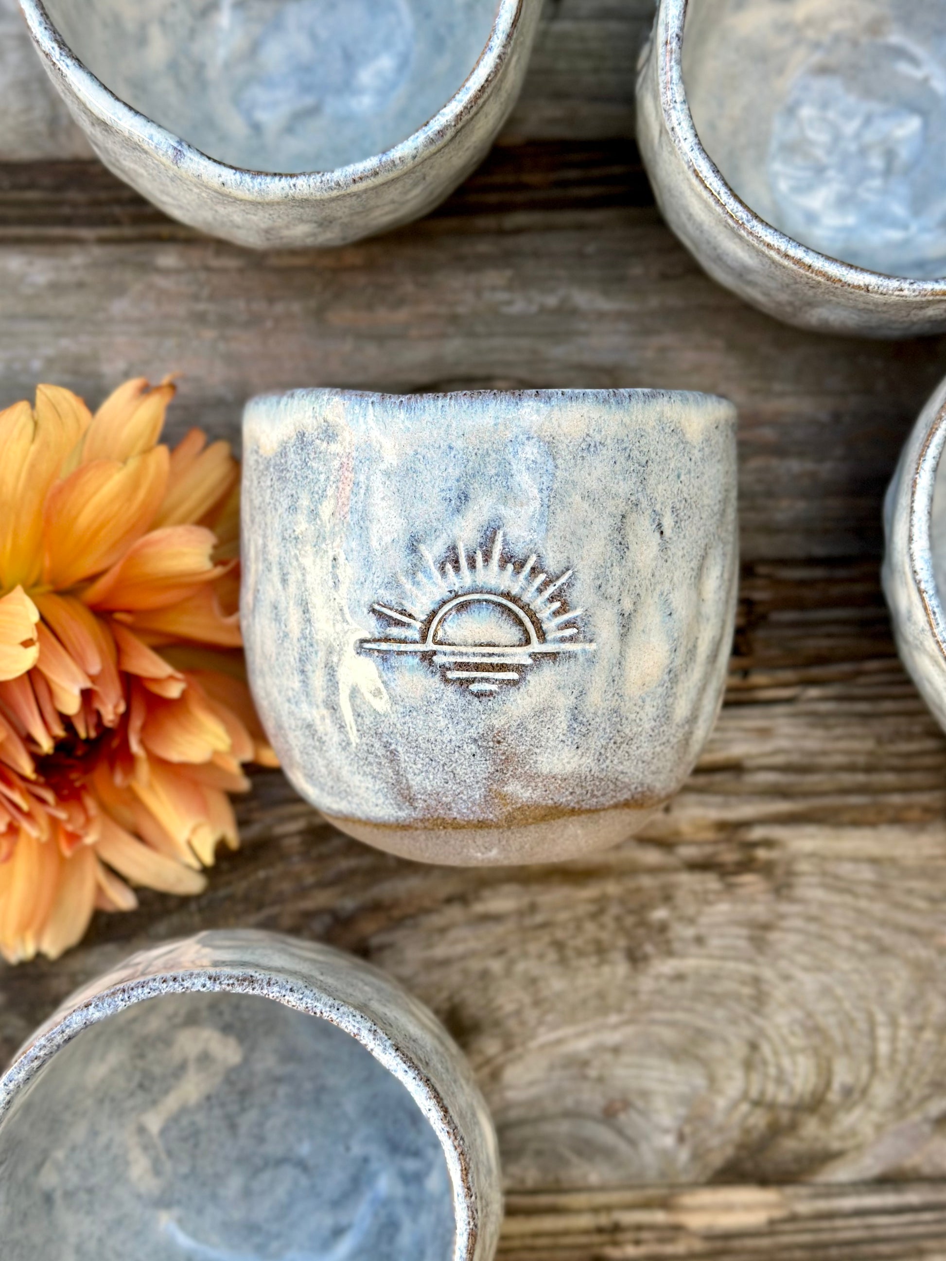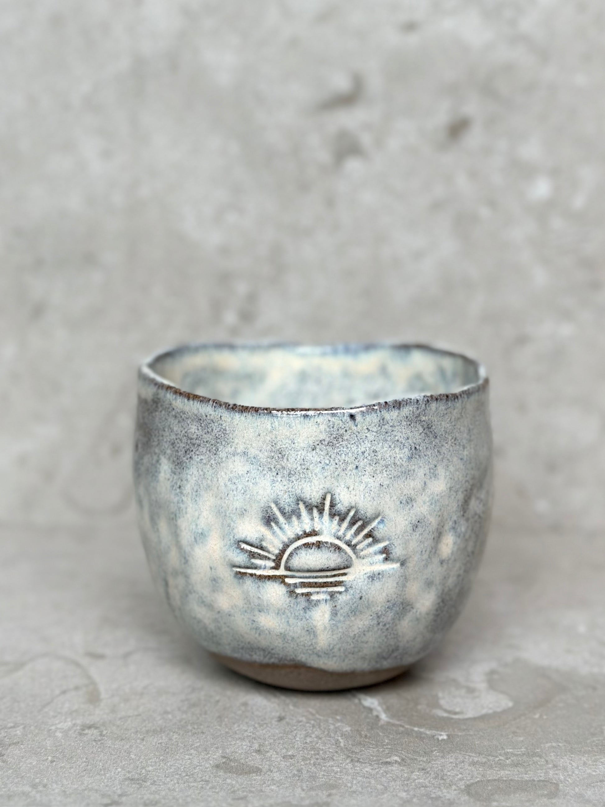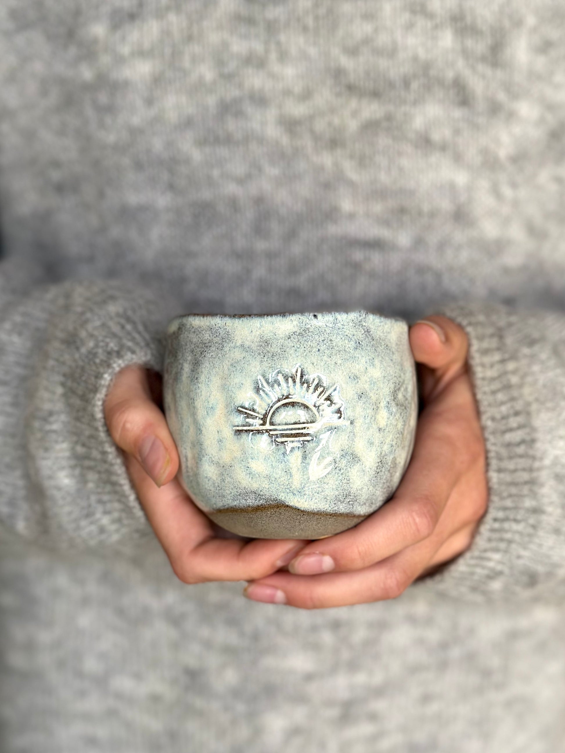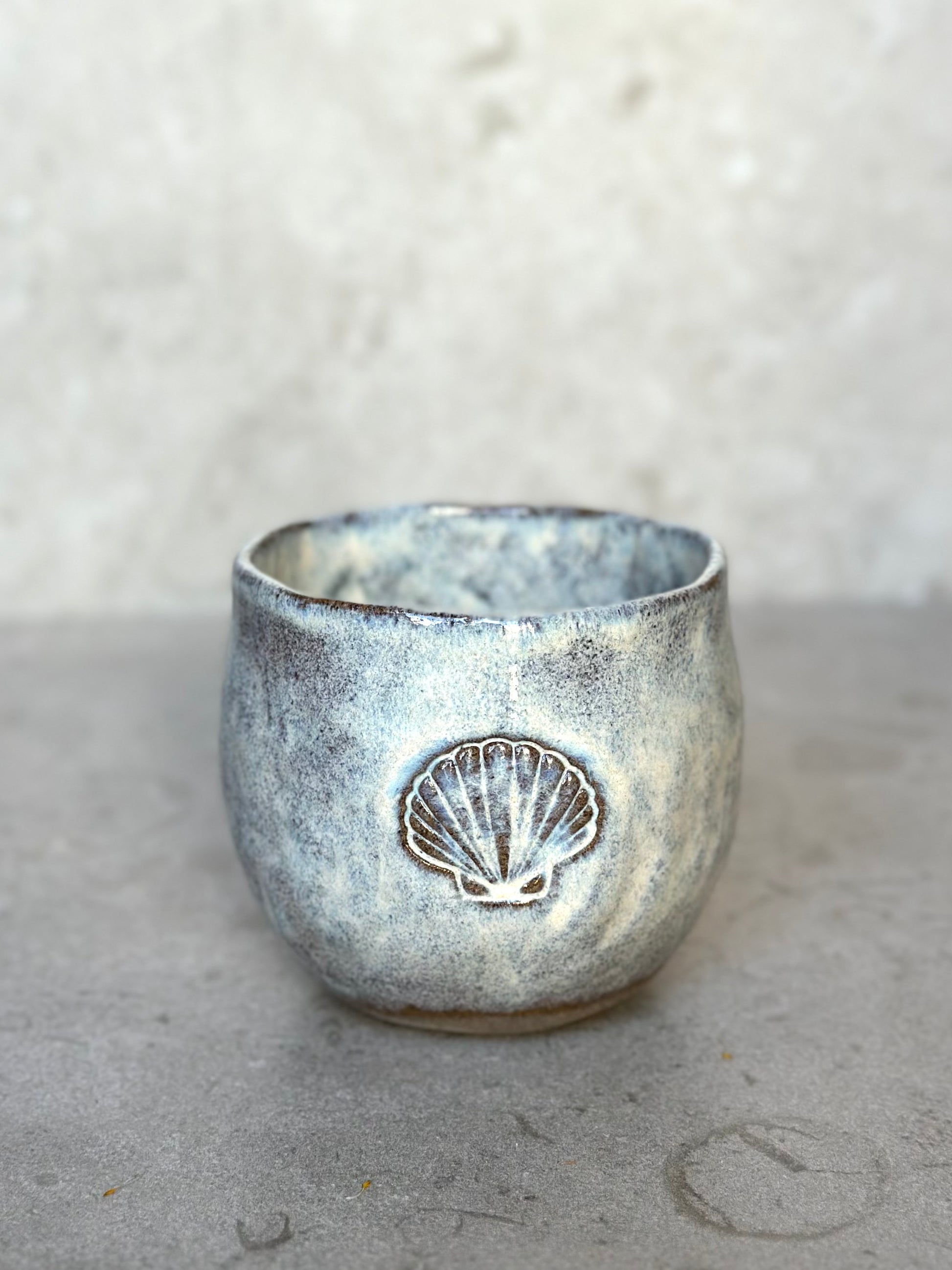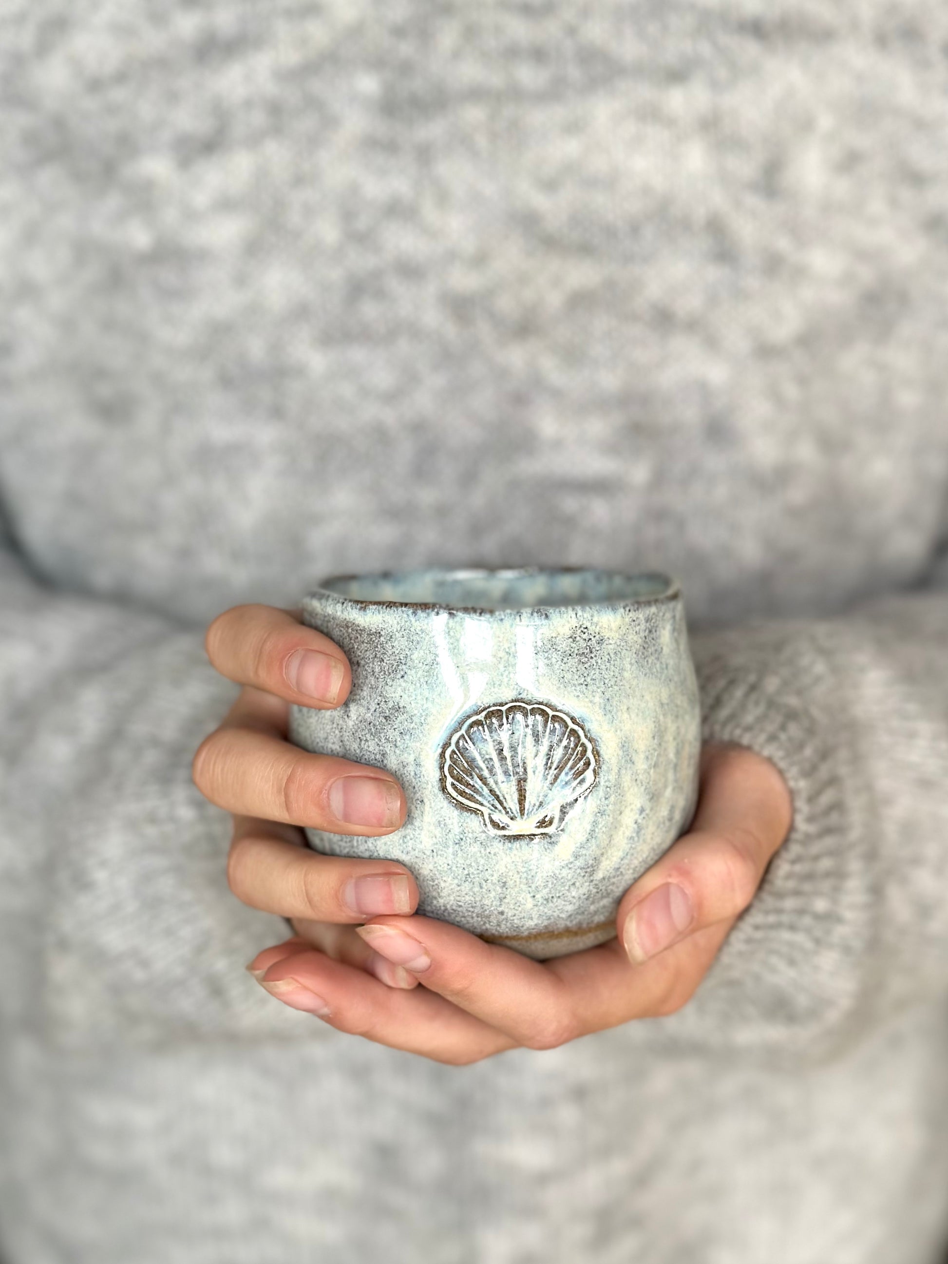 Tummad mugg mörkgrå stengodslera glaserad med en cremevit, flammig glasyr som ger en levande yta. Dekorerad med ett motiv på sidan. Välj mellan Palm, Wave, Seashell eller Sunset.