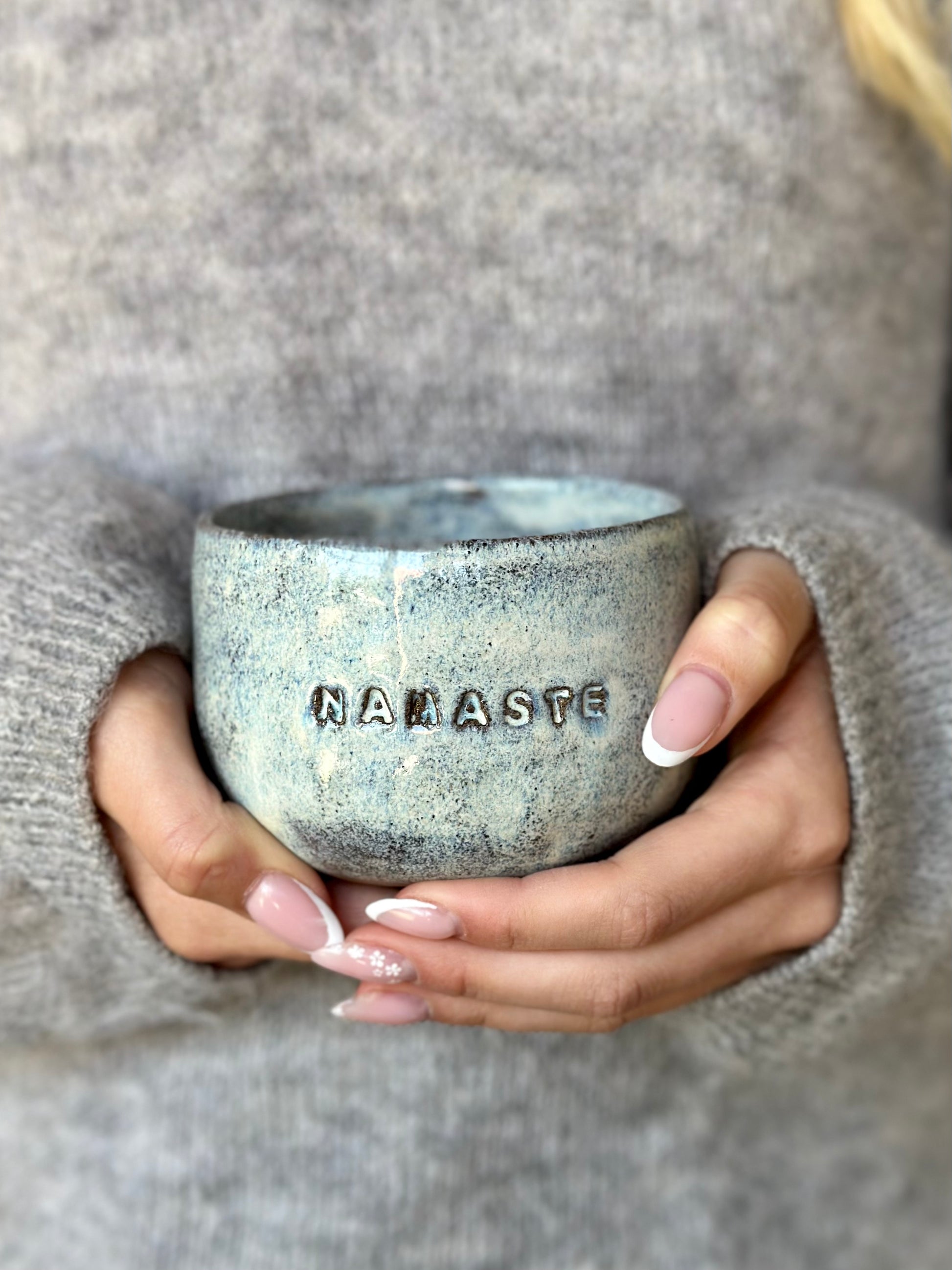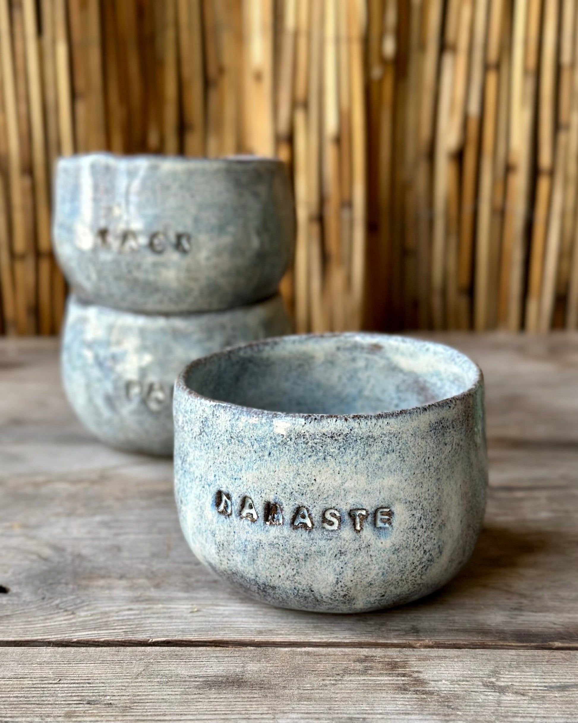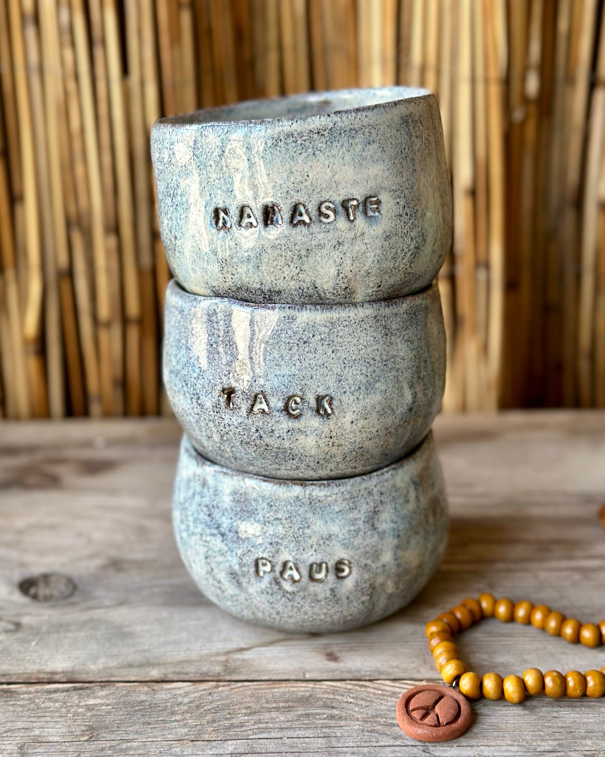 Handgjord budskapsmugg i mörkgrå lera i en mjukt rundad form. Dekorerad med ordet PAUS, TACK eller NAMASTE på sidan. En mugg som ligger fint i handen och passar perfekt för din kakao-ceremoni eller en stilla stund med te eller matcha.