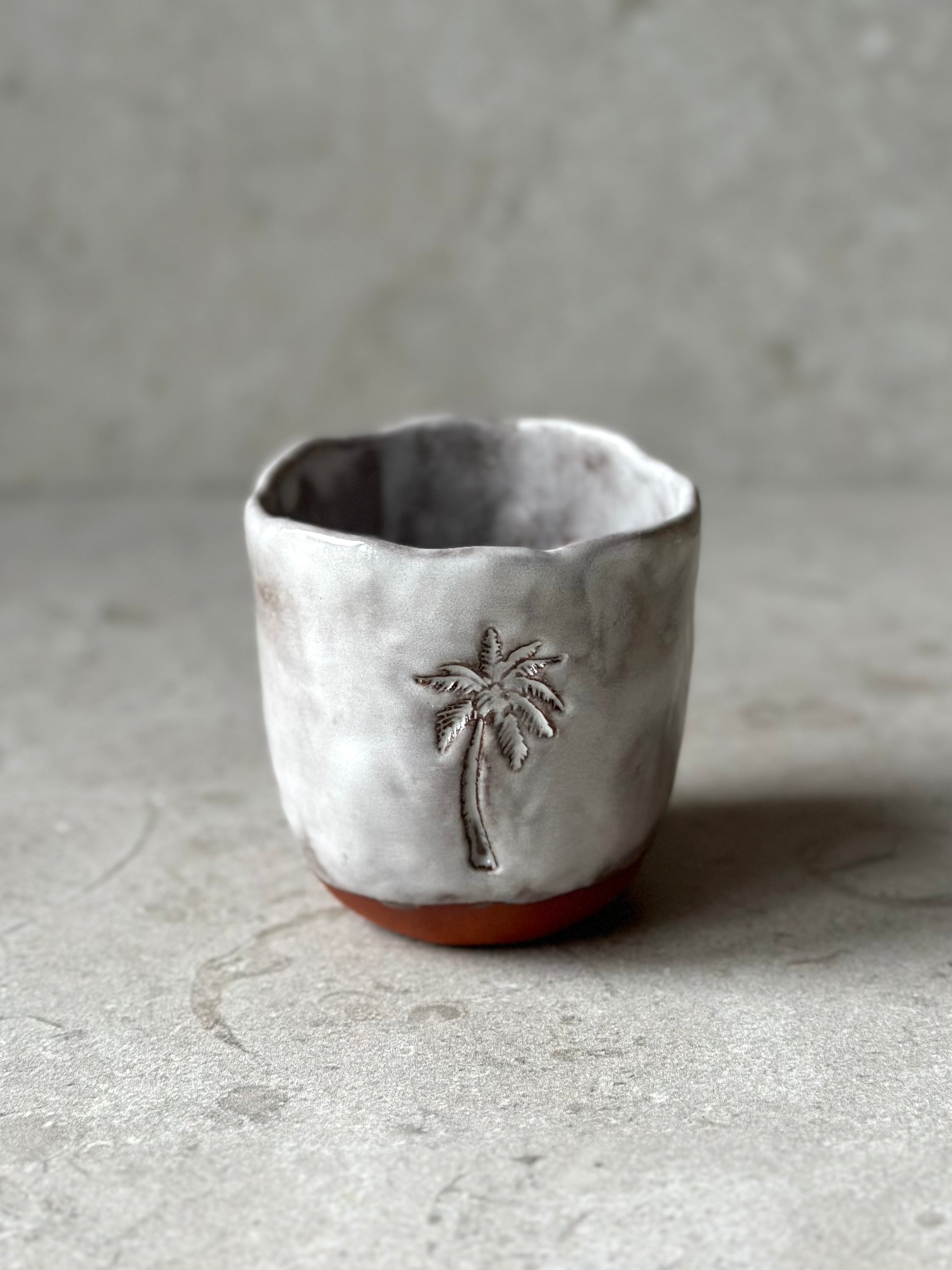 Tummad mugg i brunröd stengodslera med en gråvit glasyr. Dekorerad med en palm på sidan.