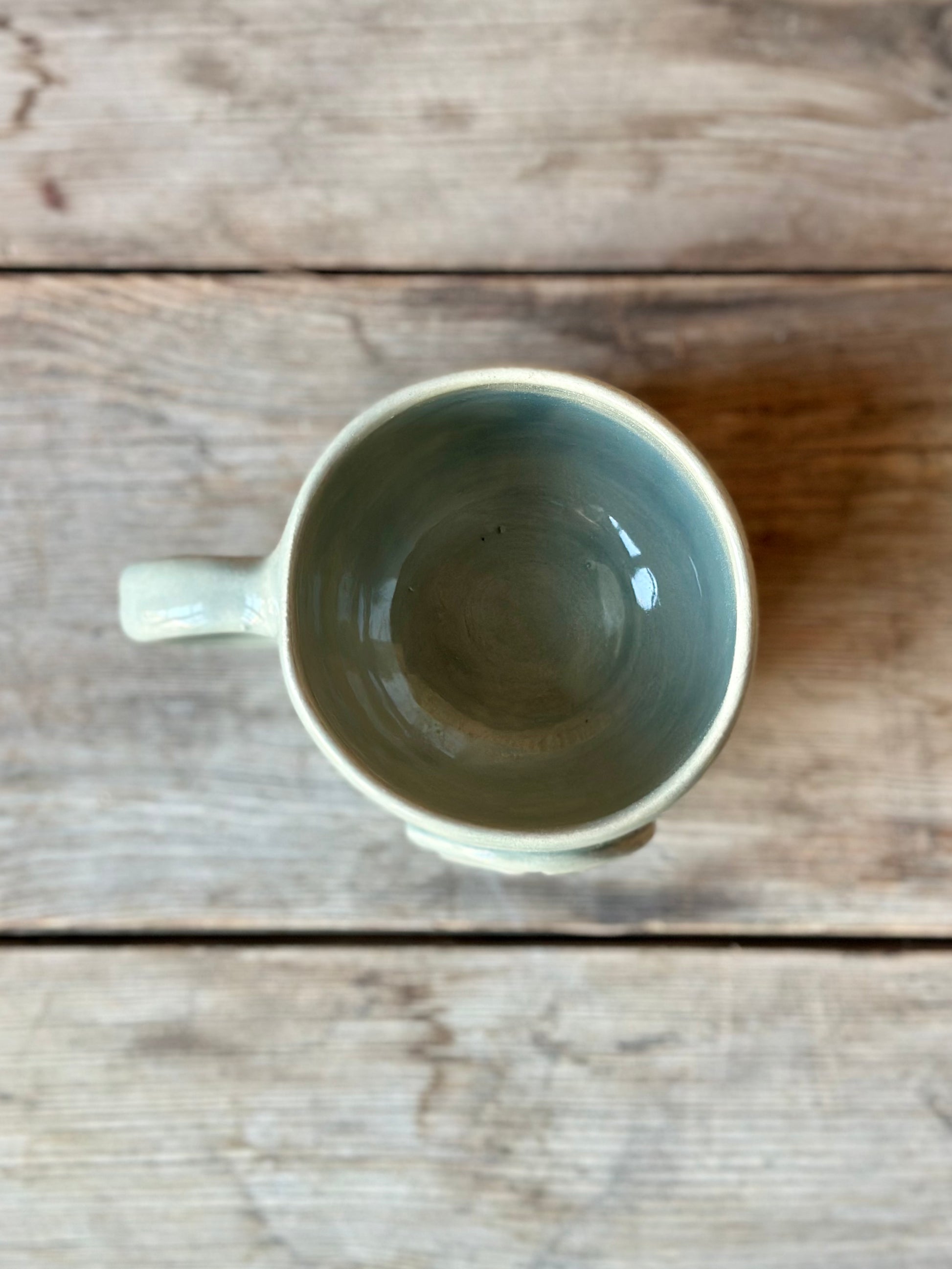 Handgjord mugg med öra i ljus stengodslera, dekorerad med ett peacetecken på sidan - en symbol för hopp i oroliga tider. Glaserad i en gråblå glasyr.