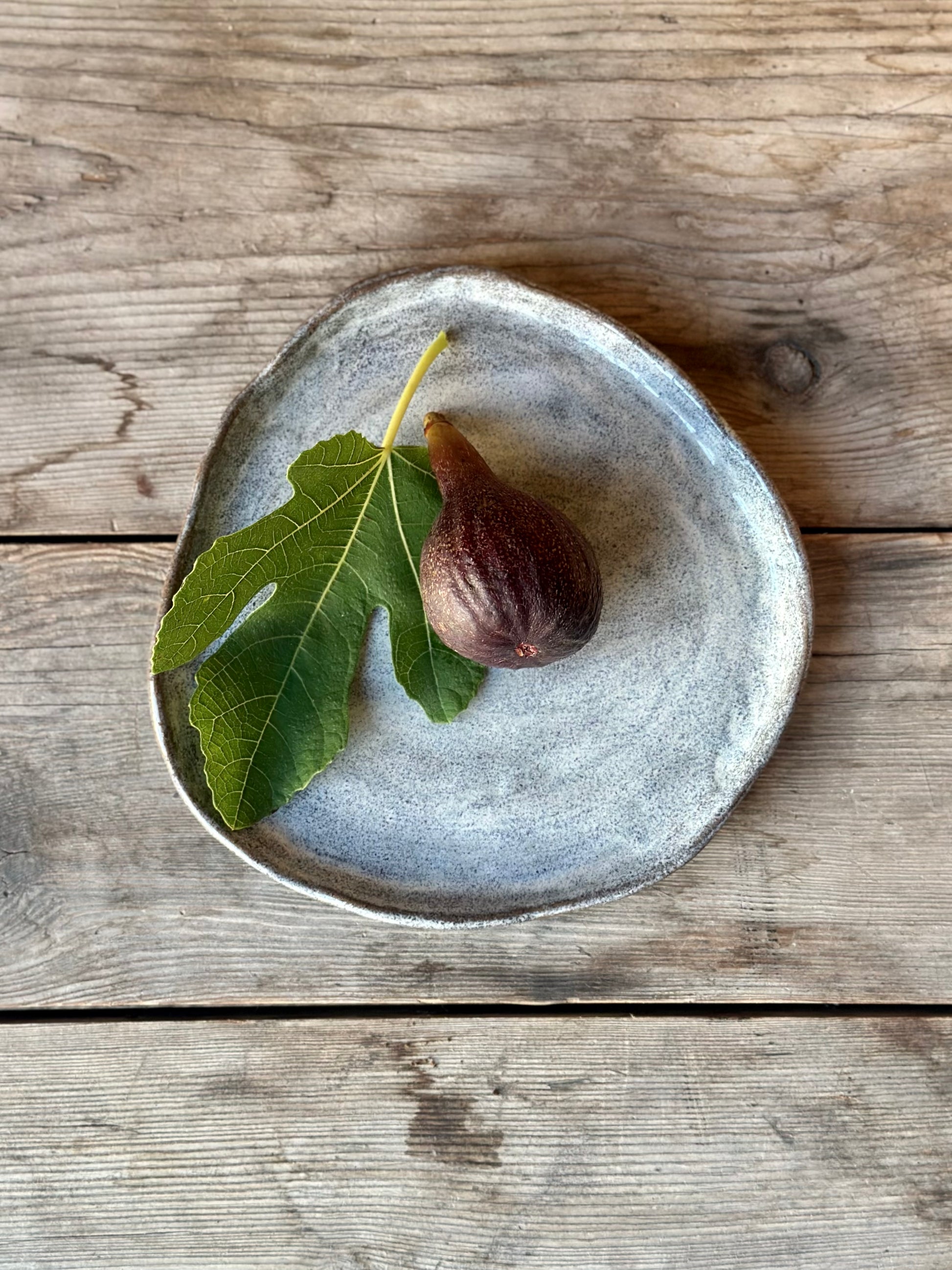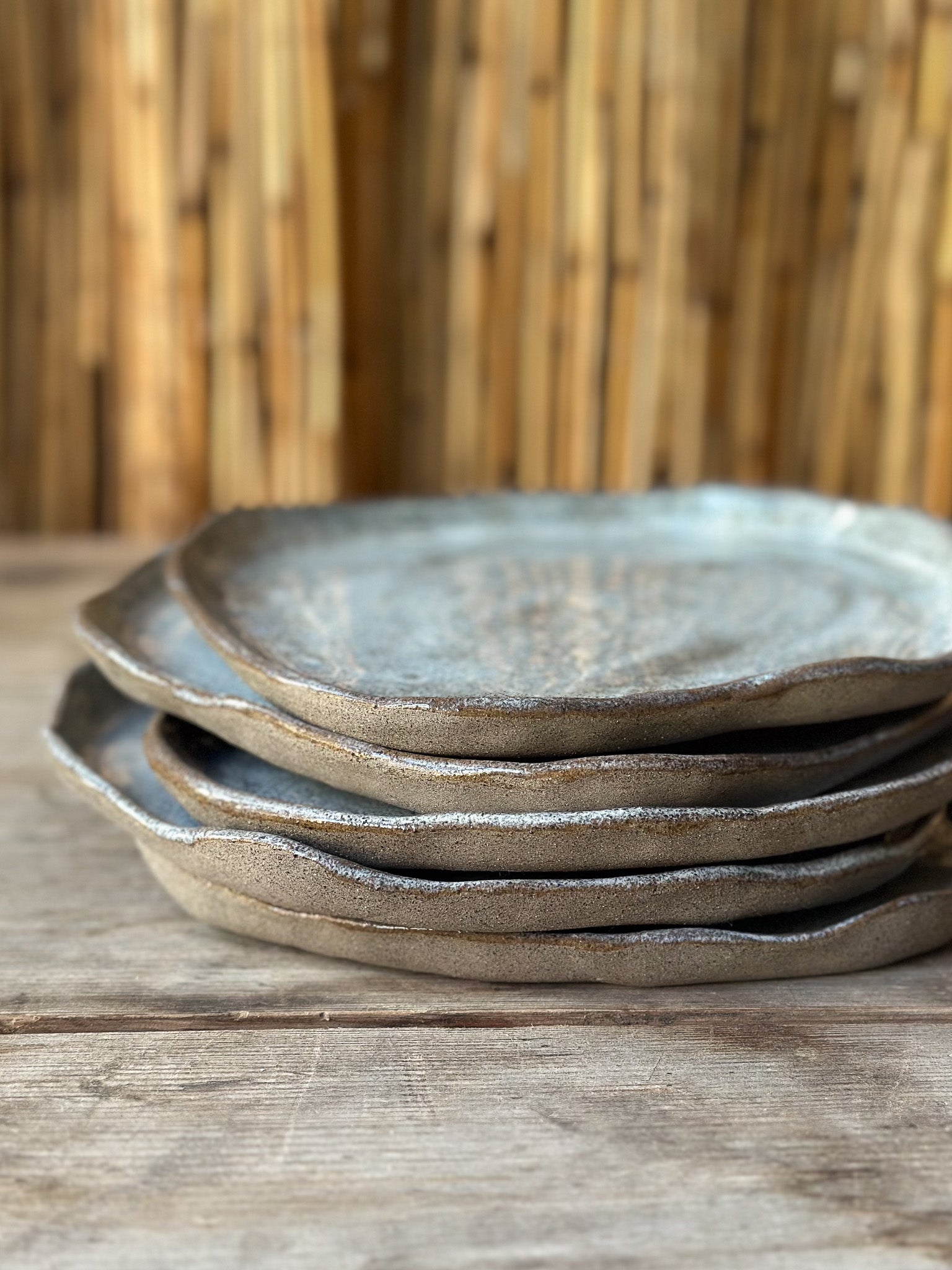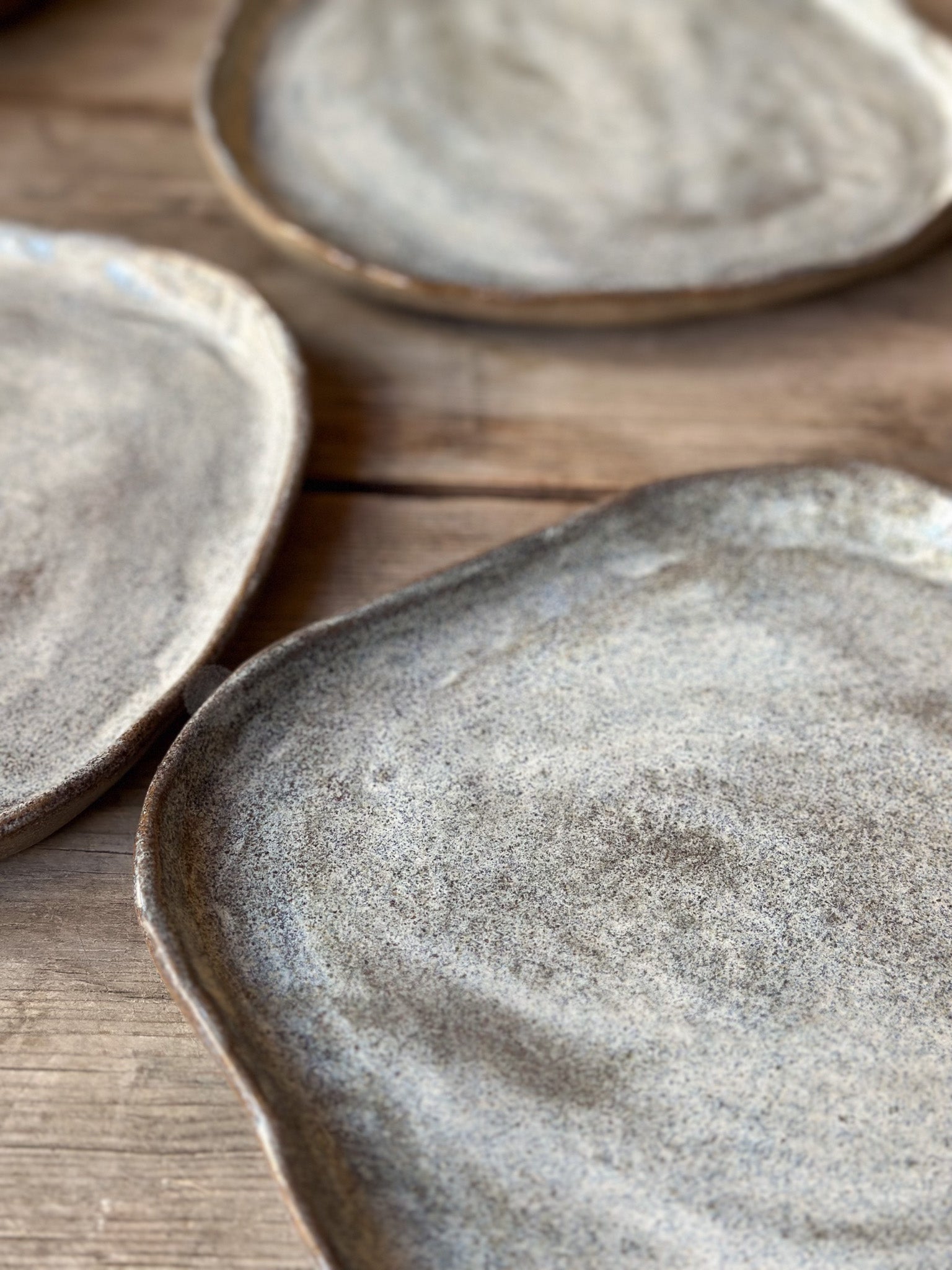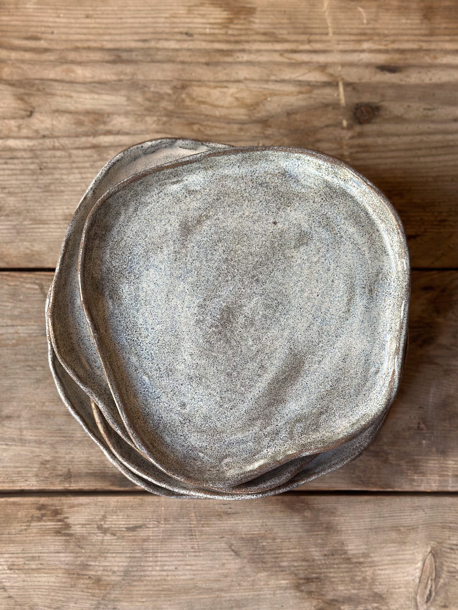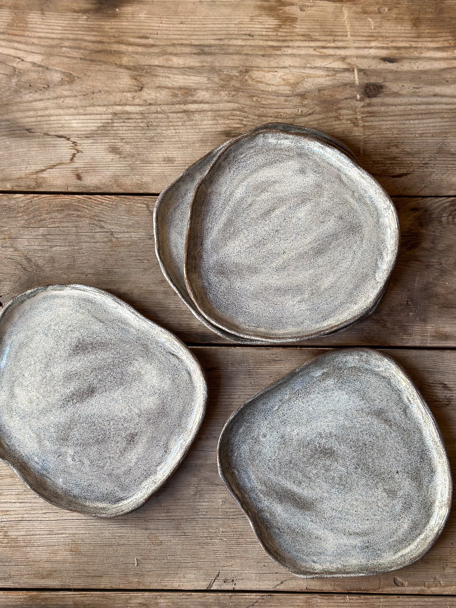 Assiett i organisk, oregelbunden form med liten kant. Mörkgrå stengodslera med cremevit glasyr.