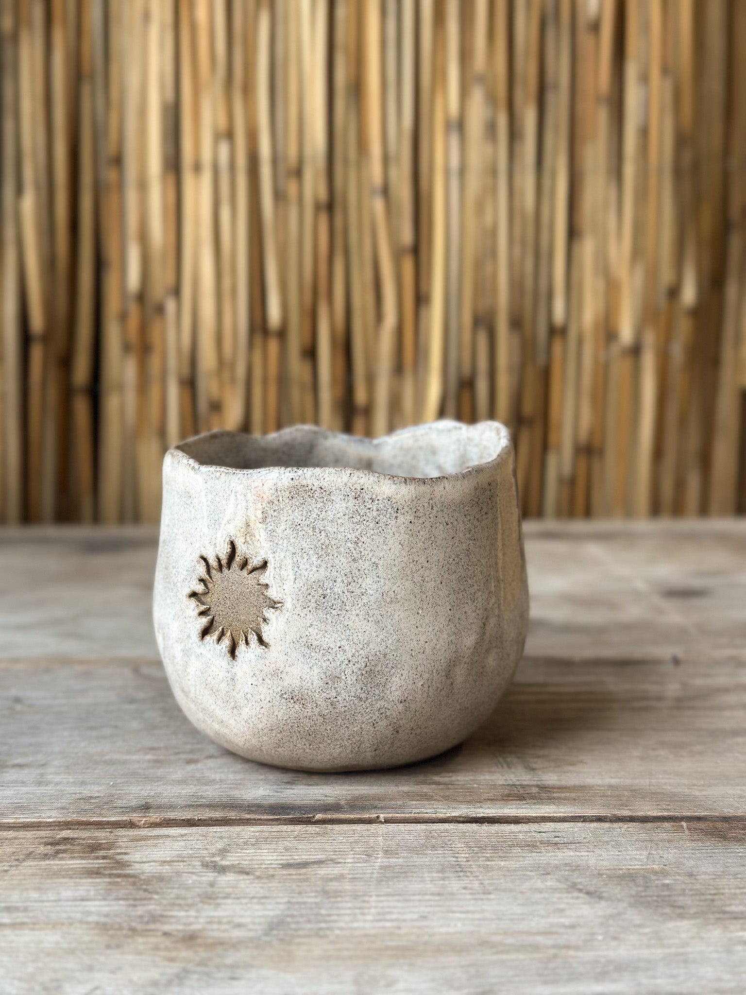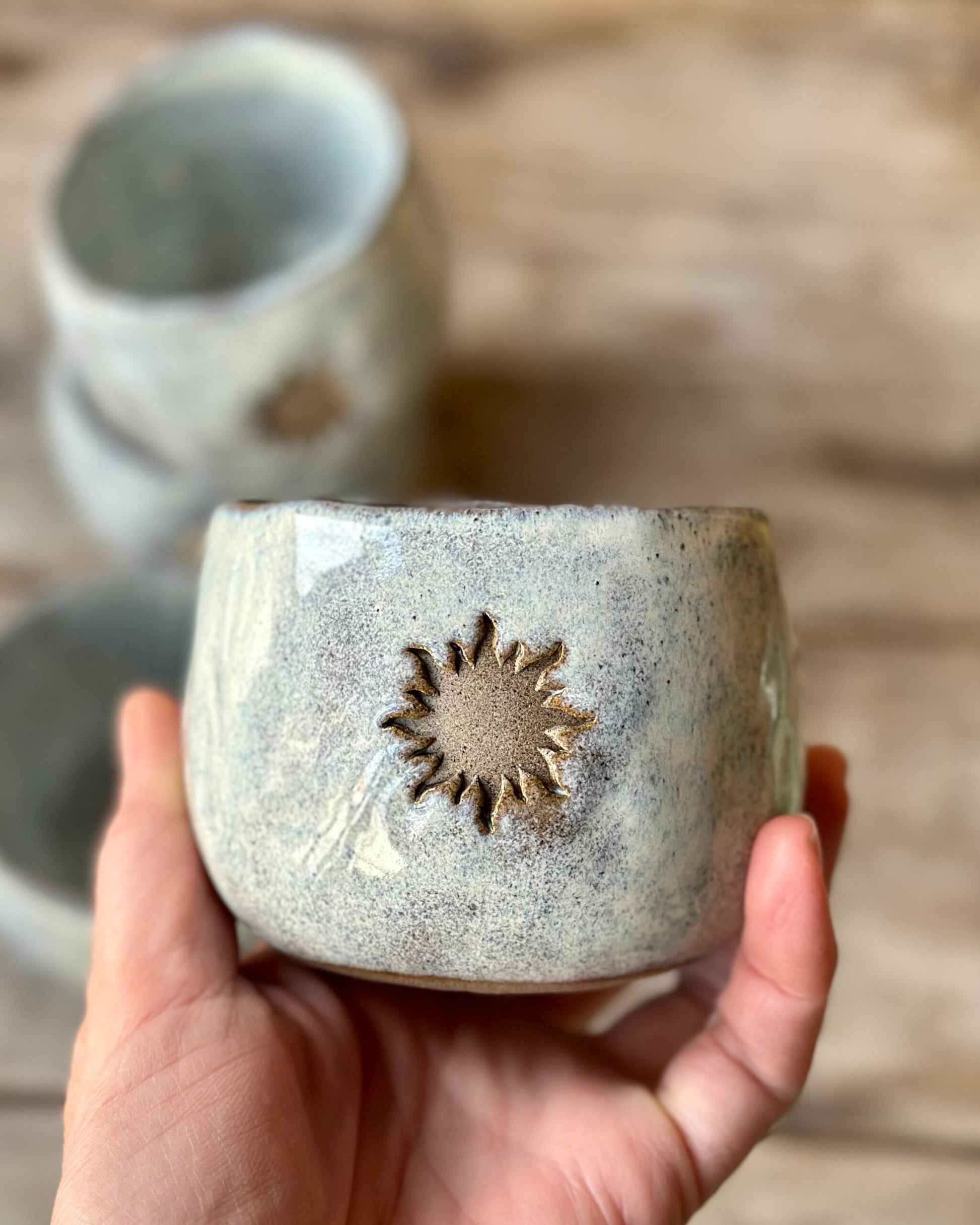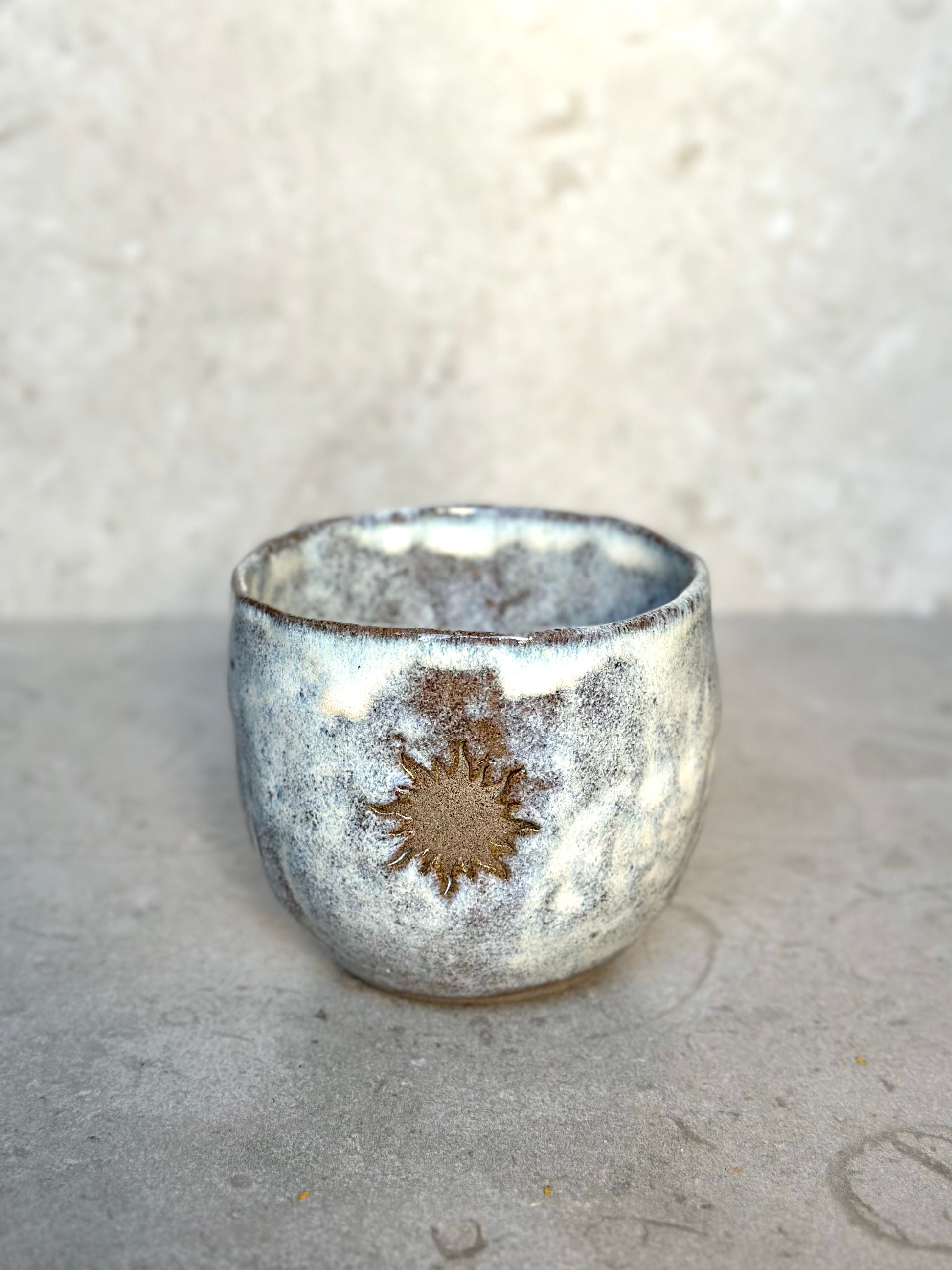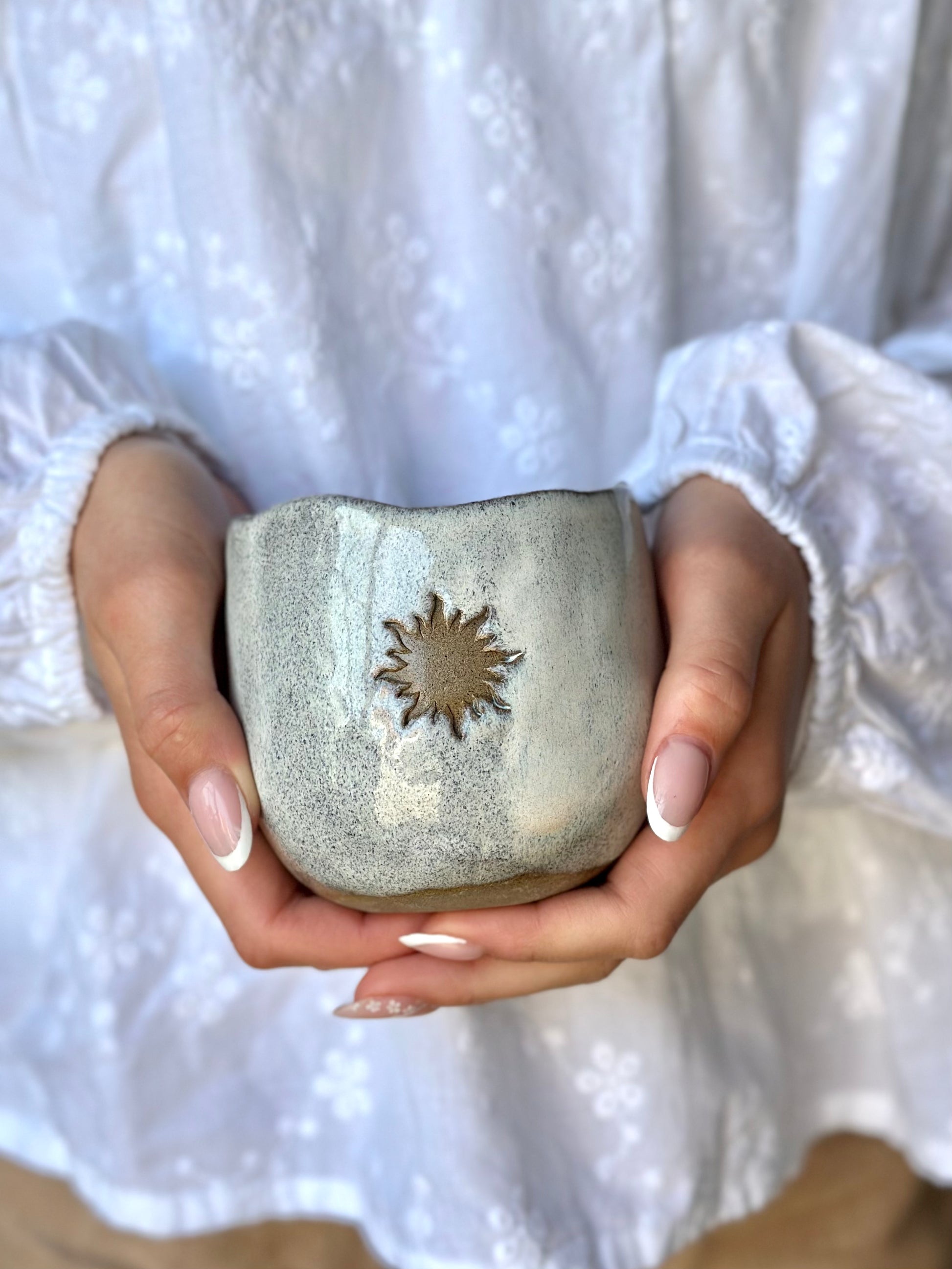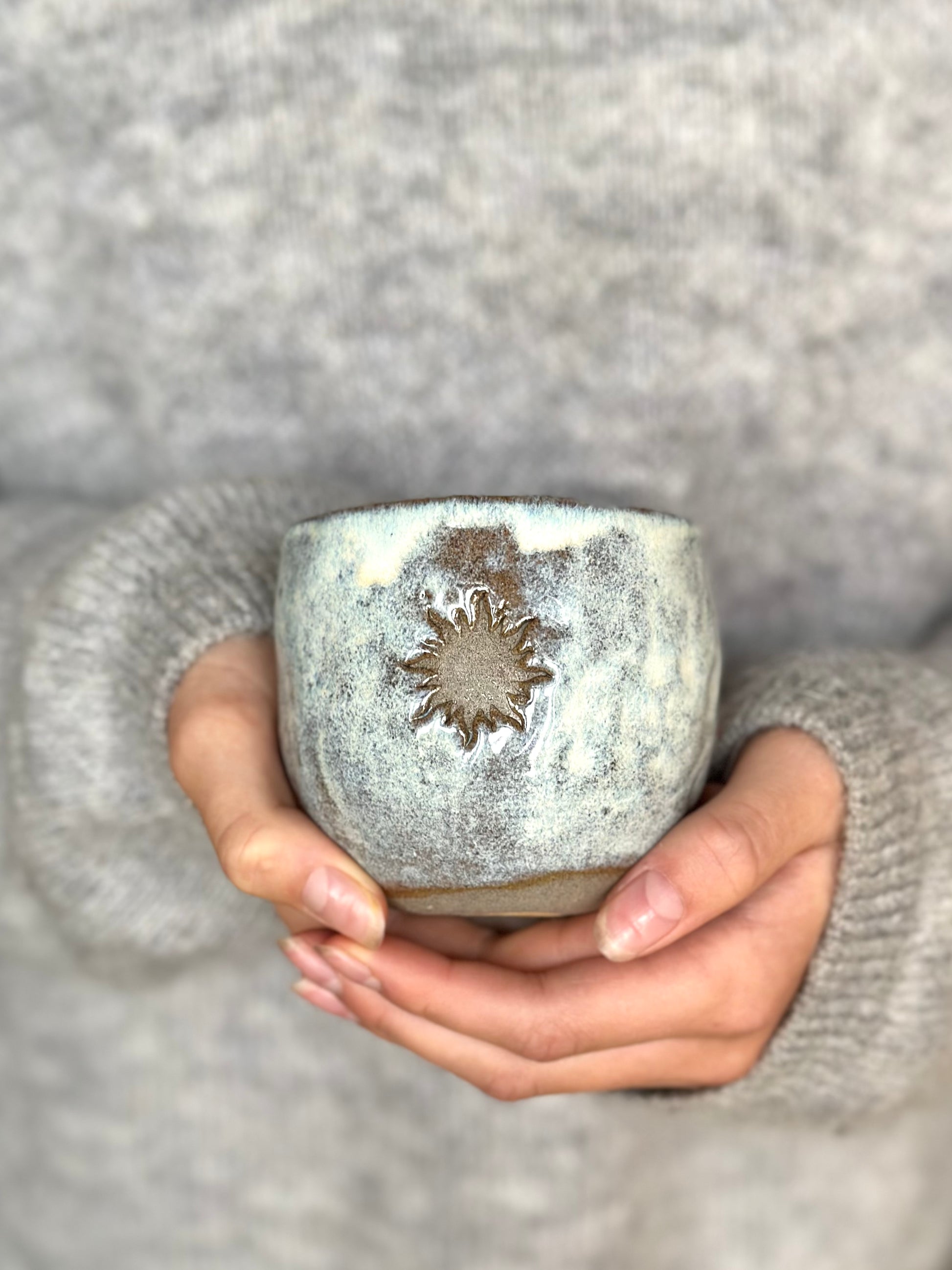 Handgjord tummad mugg i mörkgrå lera i en mjukt rundad form. Dekorerad med en sol på sidan. Den cremevita glasyren ger en mjuk, harmonisk känsla, perfekt för din kakao-ceremoni eller en stilla stund med te.