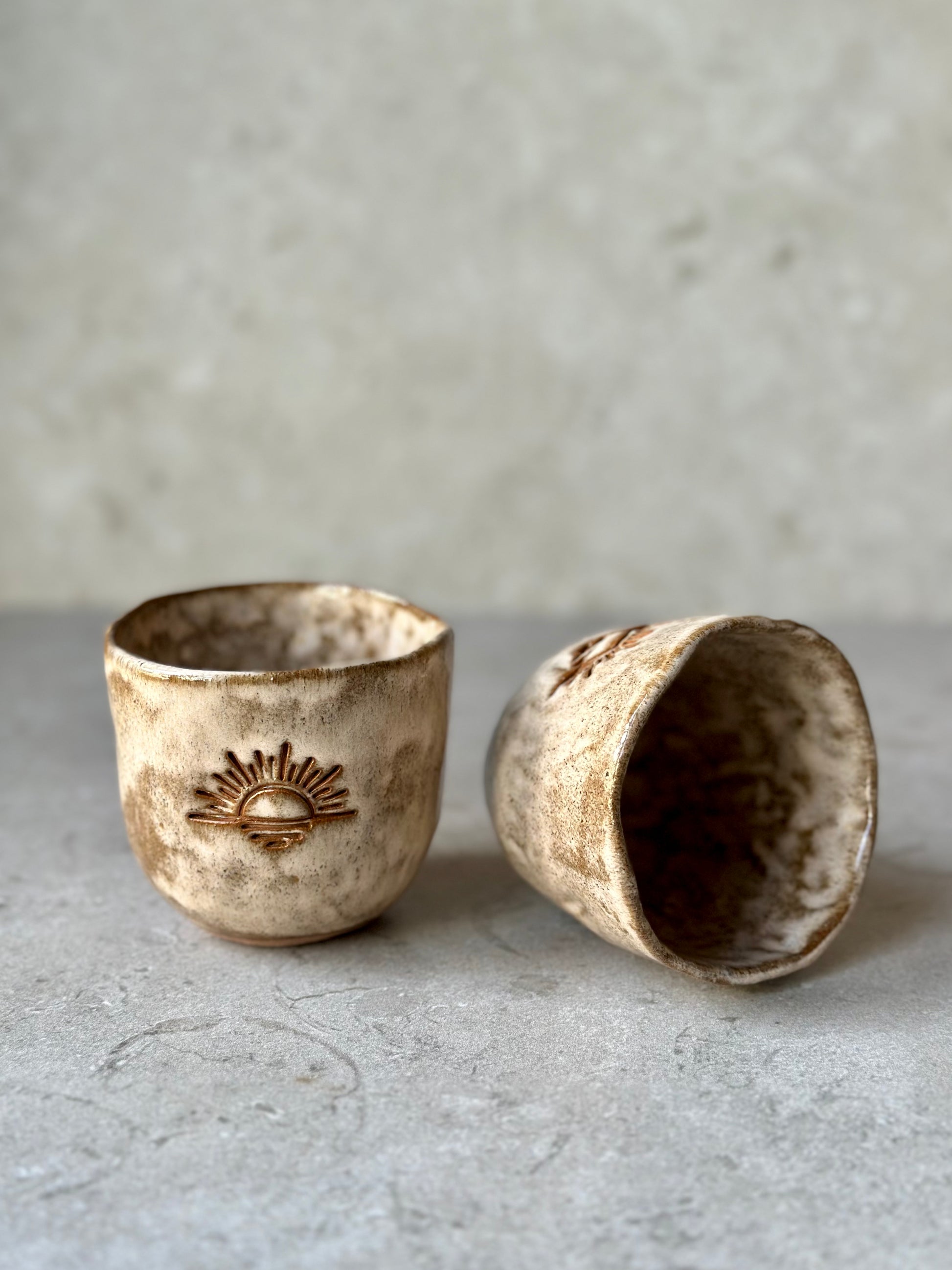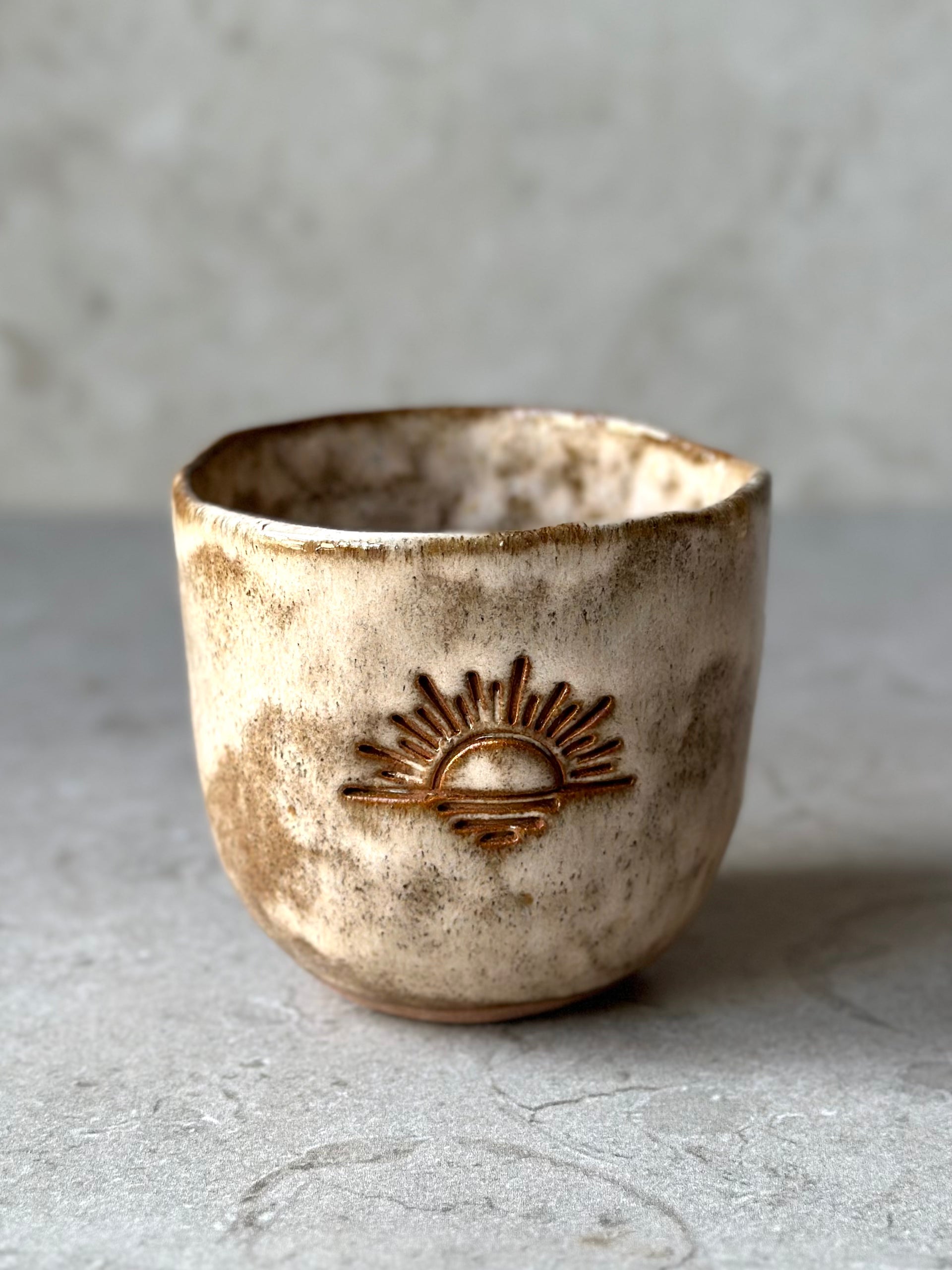 Tummad mugg i mörk stengodslera med en cremevit glasyr som drar mot rosa och skiftar i brunt. Dekorerad med en solnedgång på sidan.