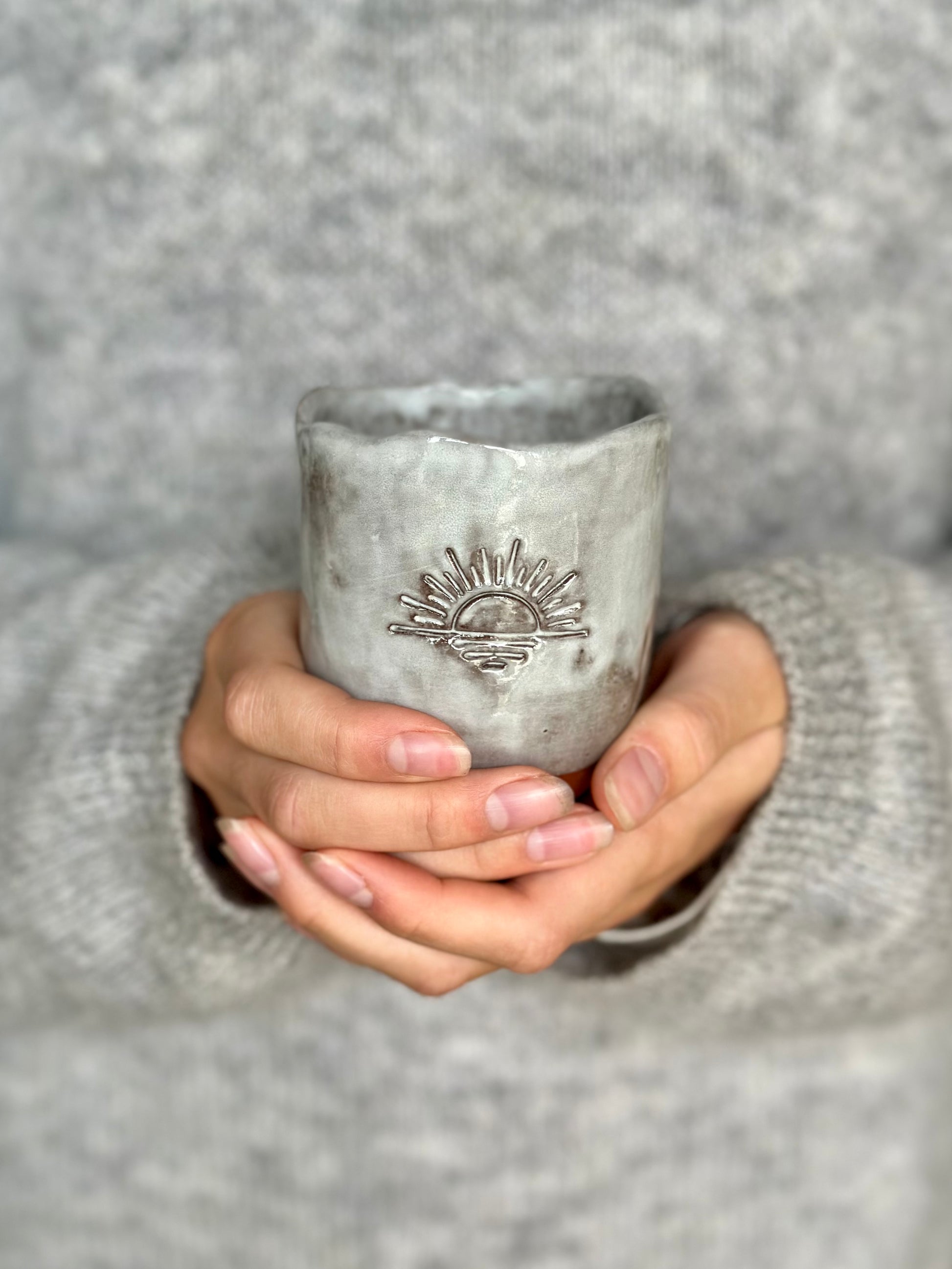 Tummad mugg i brunröd stengodslera med en gråvit glasyr. Dekorerad med en solnedgång på sidan.