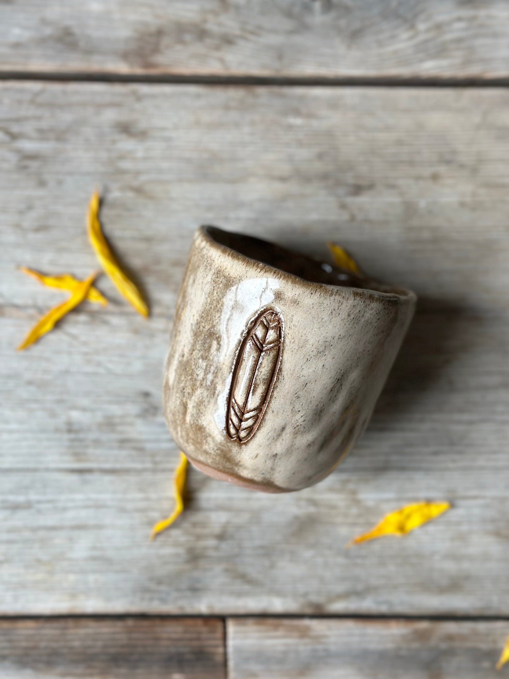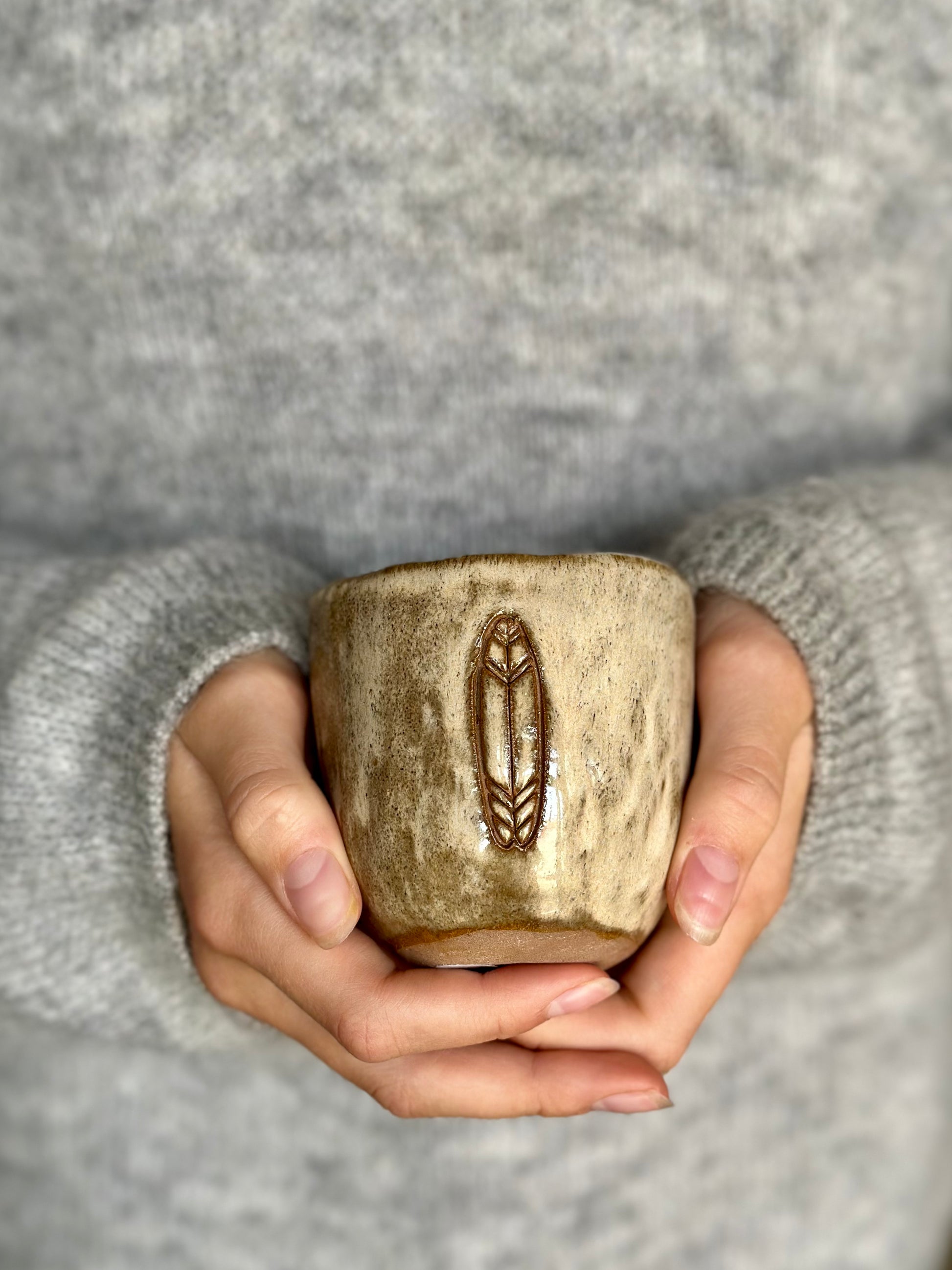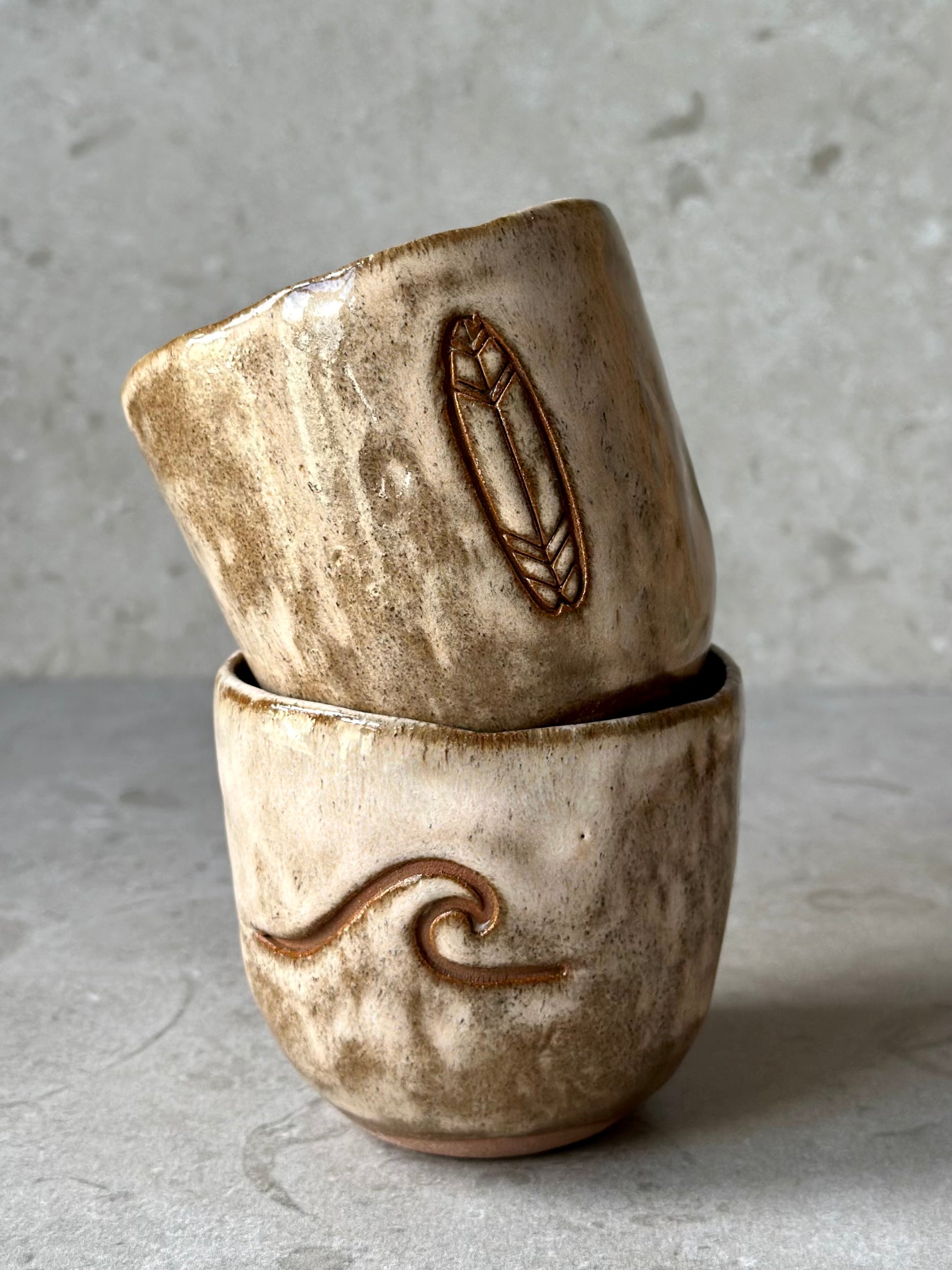 Tummad mugg i mörk stengodslera med en cremevit glasyr som drar mot rosa och skiftar i brunt. Dekorerad med en surfbräda på sidan.