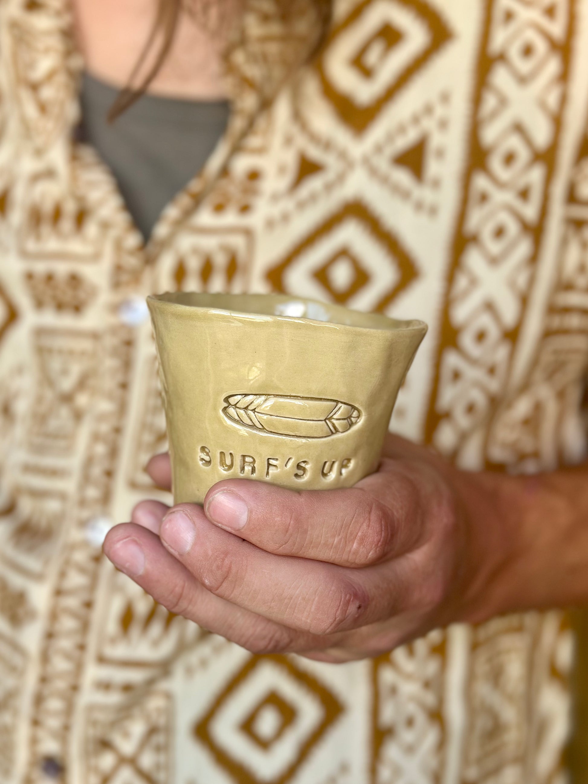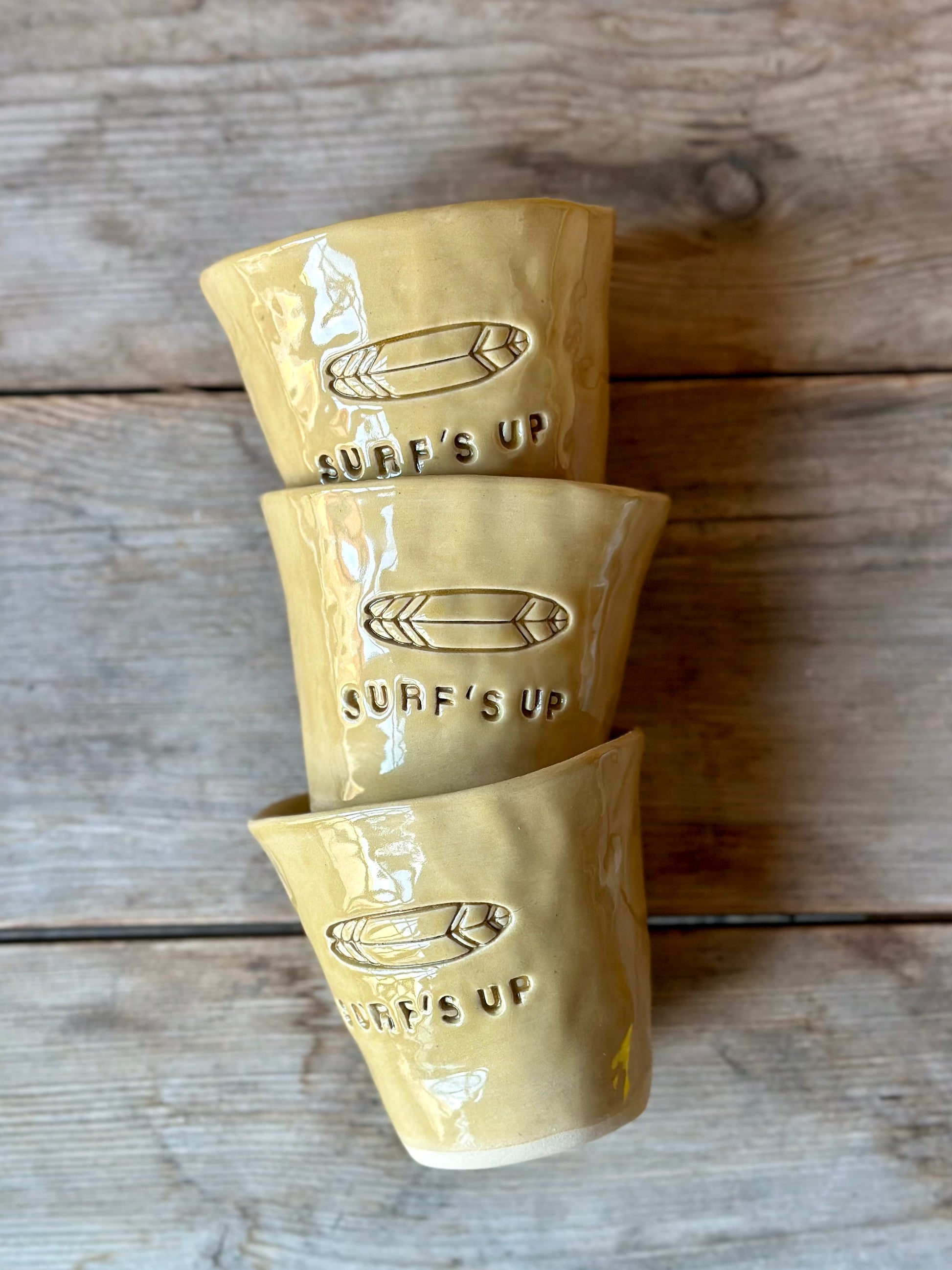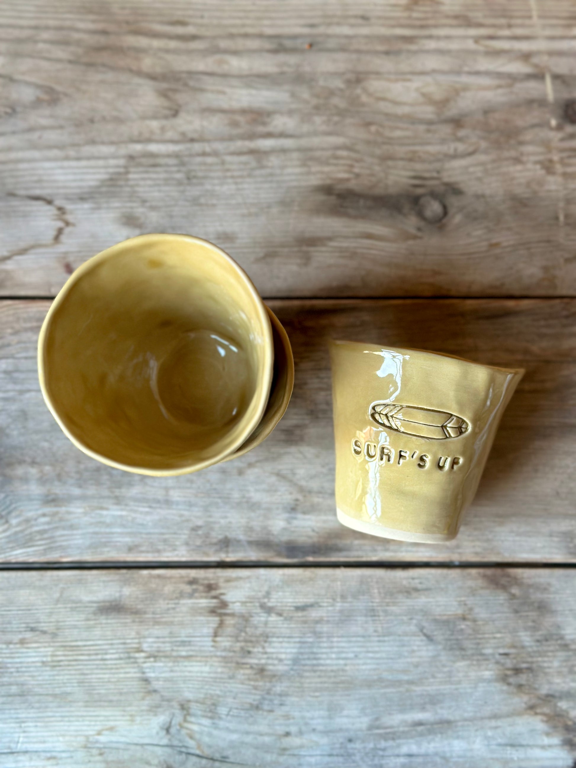 Rak mugg i stengodslera, dekorerad med en surfbräda och texten SURF'S UP. Glaserad i en senapsgul glasyr.