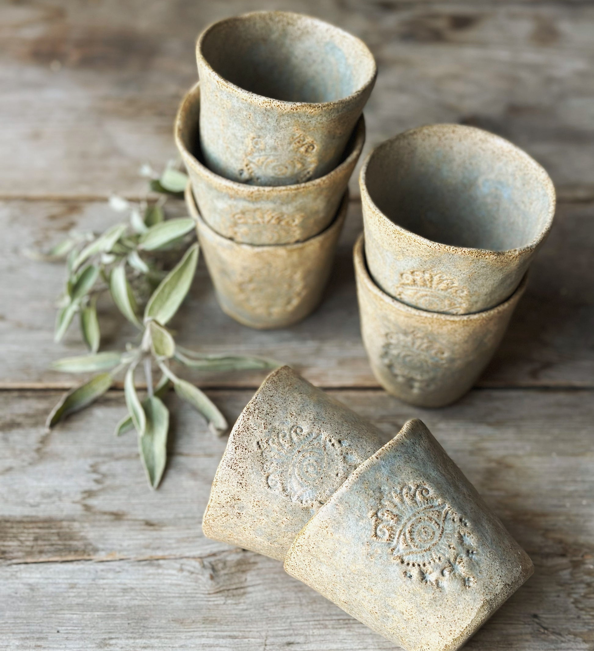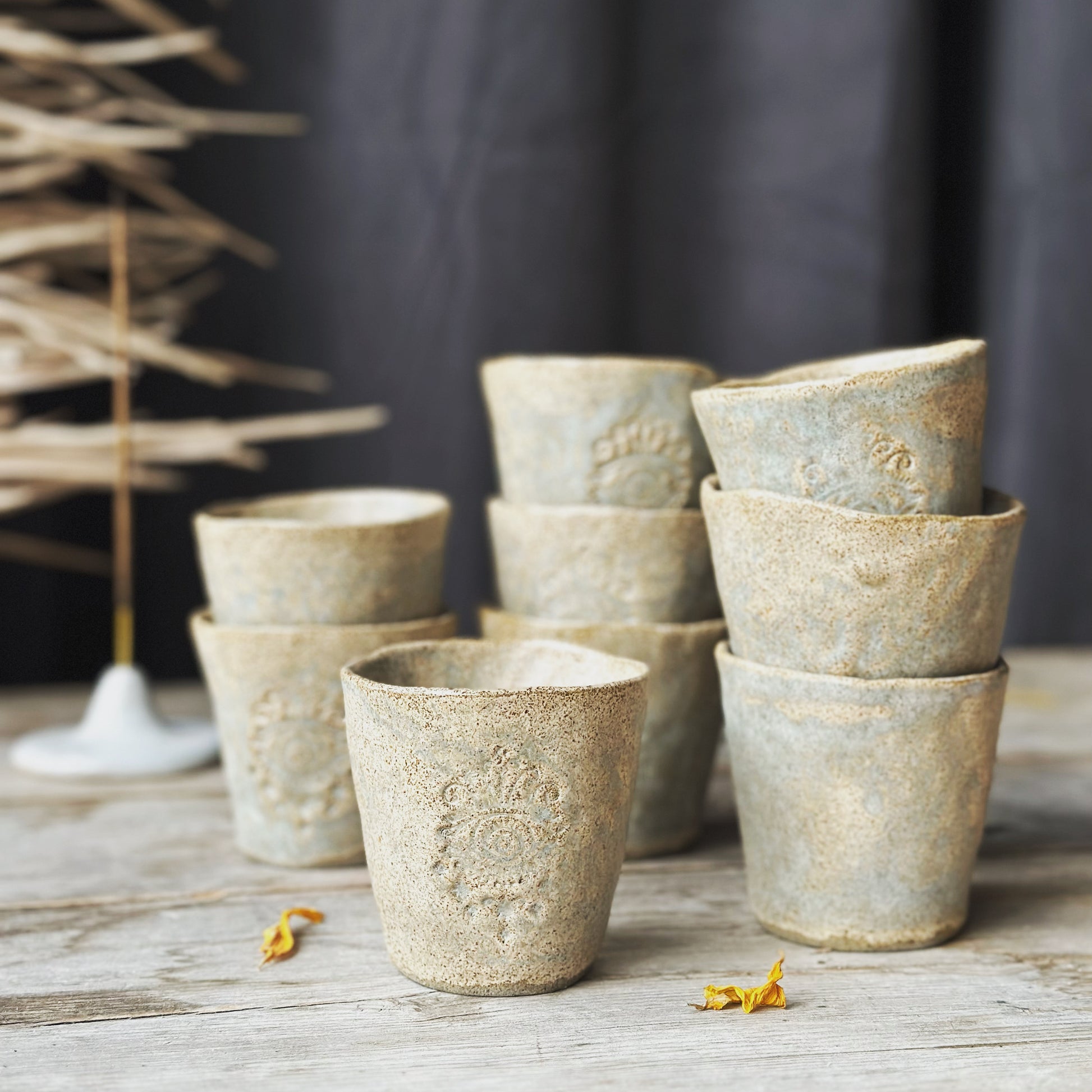 Liten mugg i grå stengodslera med beige glasyr, dekorerad med ett tredje öga.