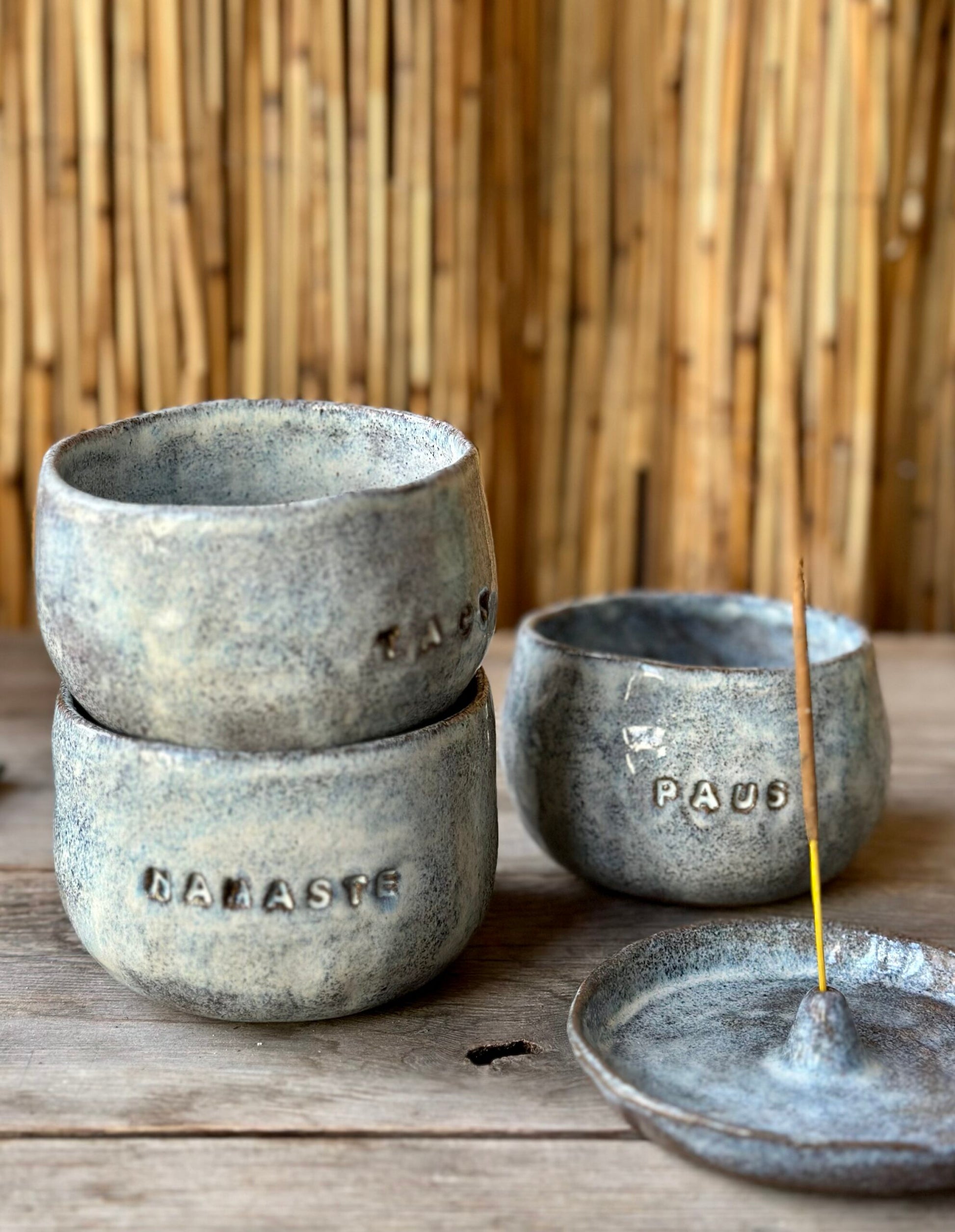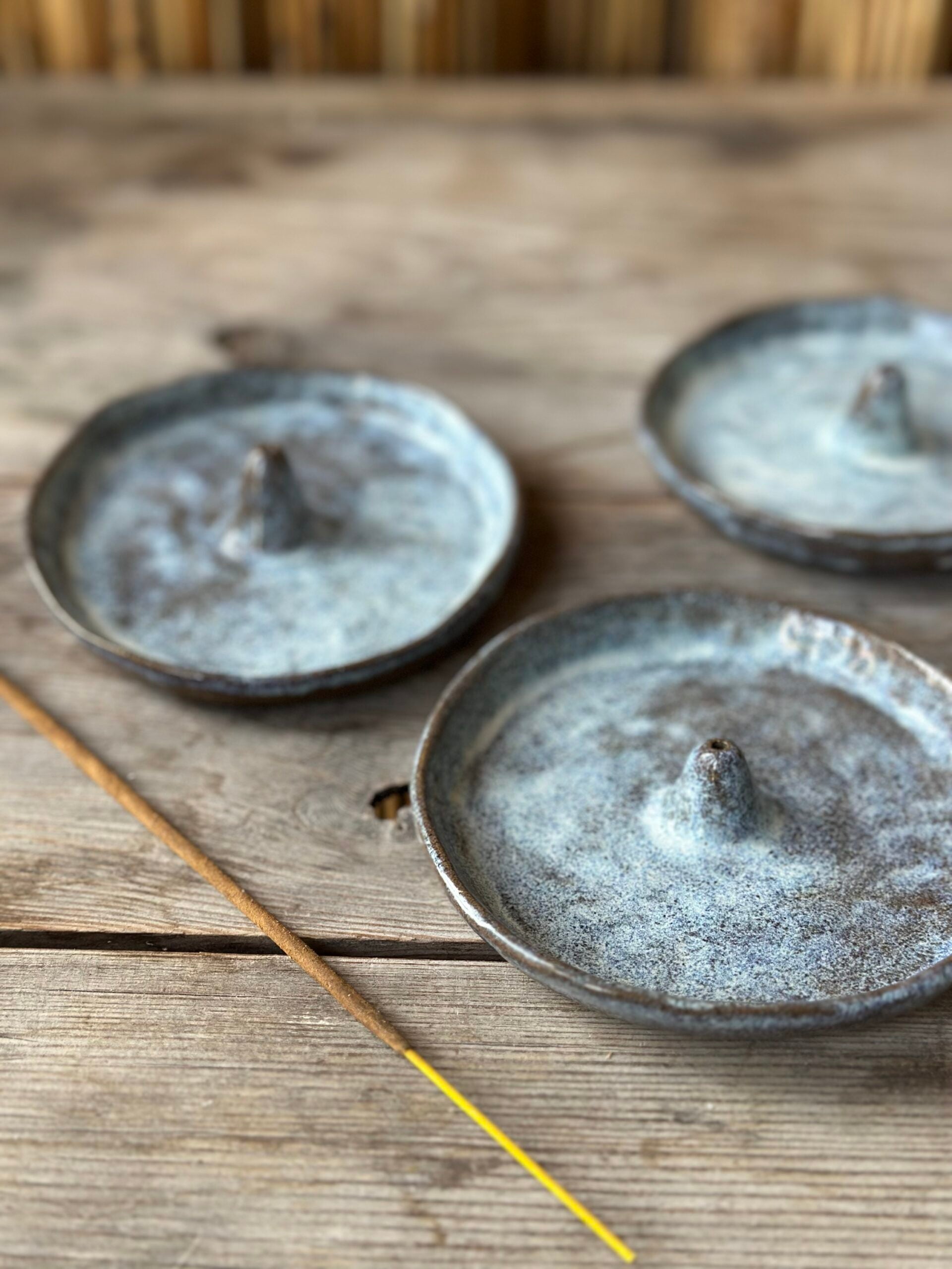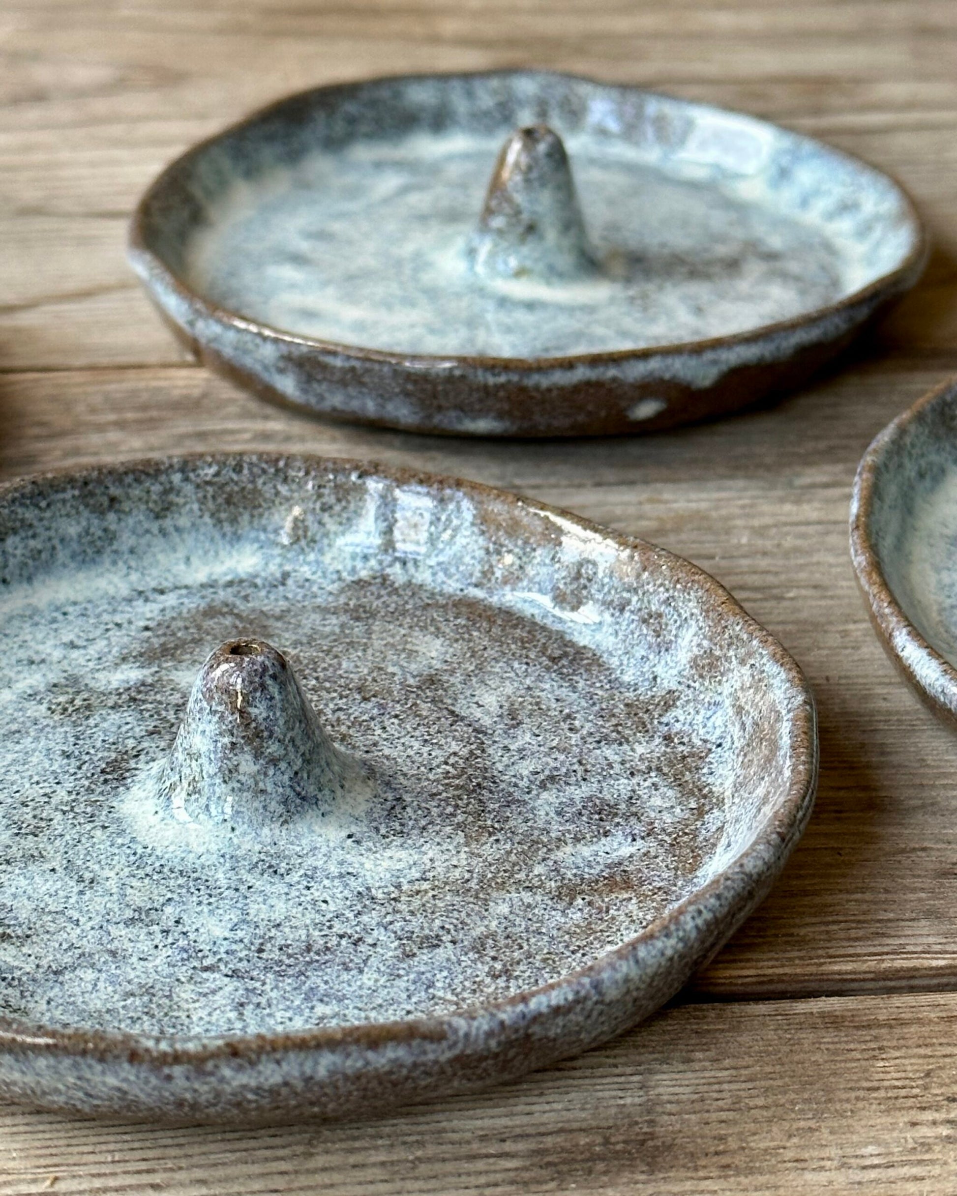 Hållare för rökelsepinnar. Formad som ett litet fat som samlar upp askan. Tillverkad i mörkgrå stengodskeramik med en cremevit glasyr.