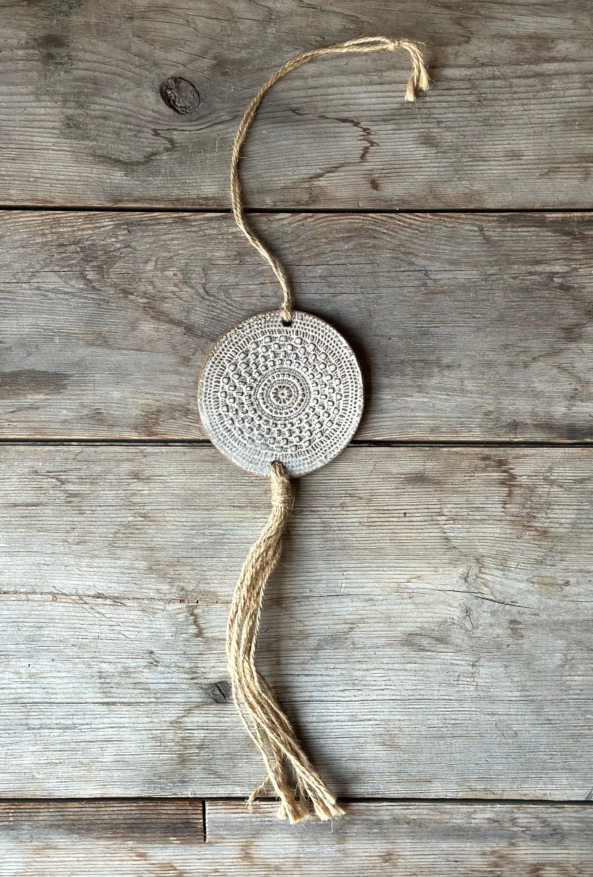 Väggdekoration i mandala-design. Skapad i mörkgrå stengodslera och glaserad i en cremevit glasyr. Snöre av hampa.