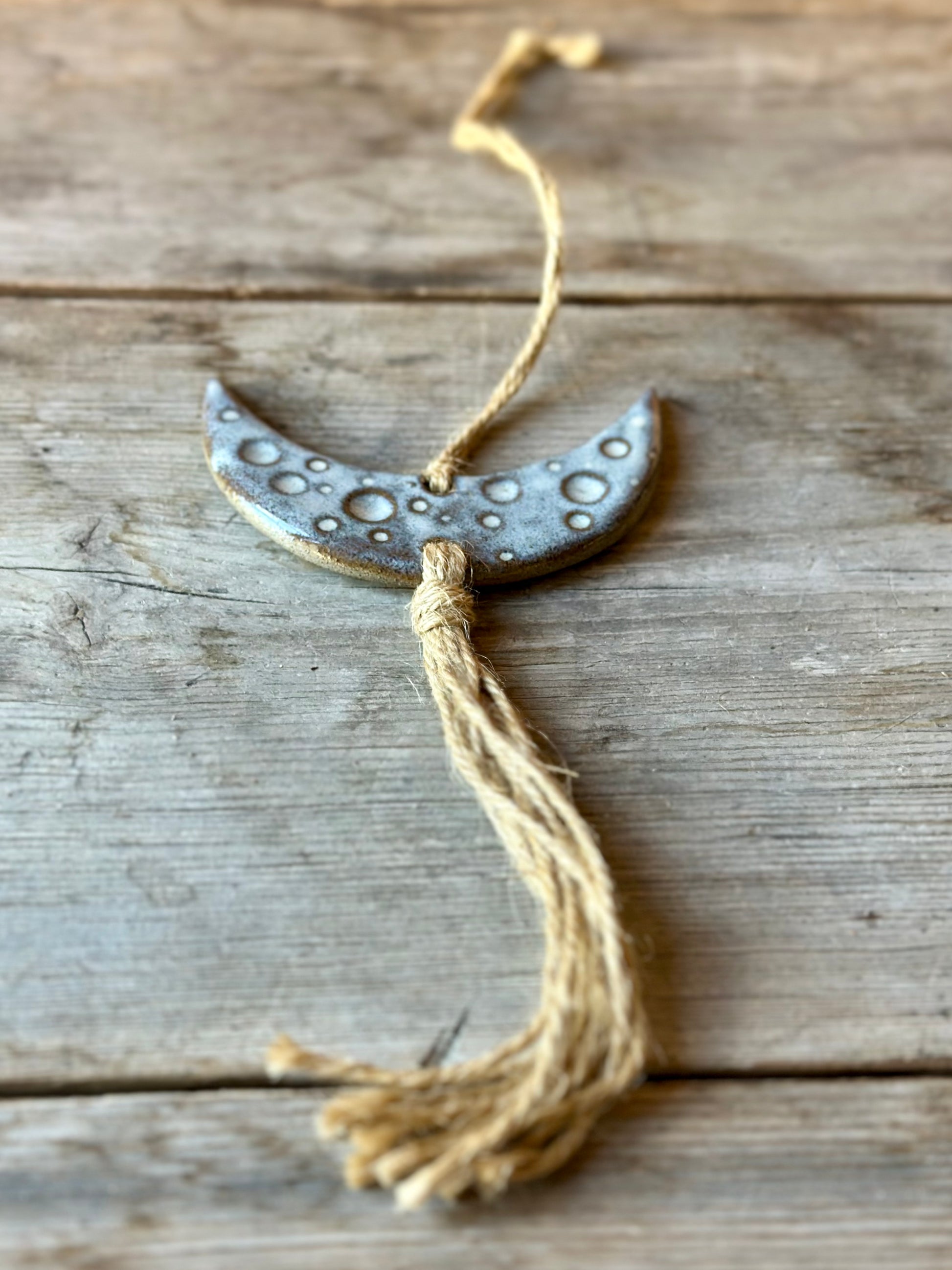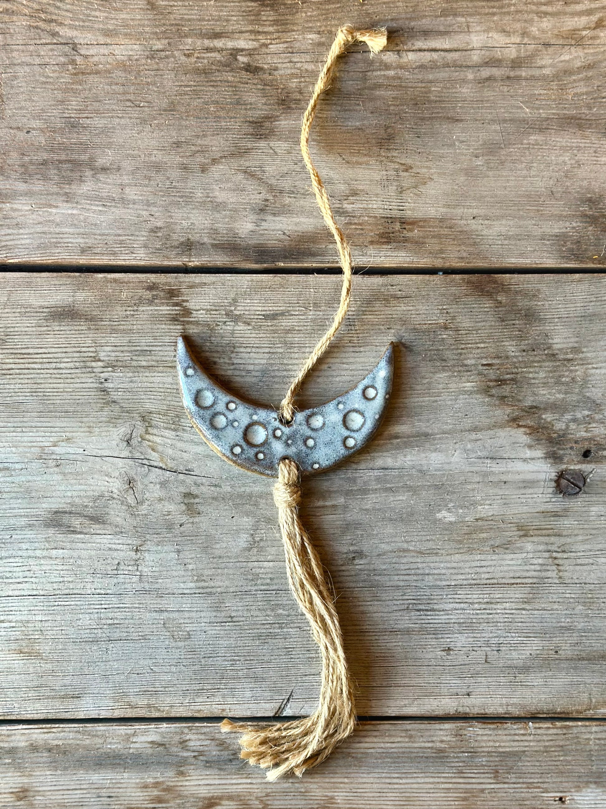 Väggdekoration i form av en måne. Skapad i mörkgrå stengodslera och glaserad i en cremevit glasyr. Snöre av hampa.