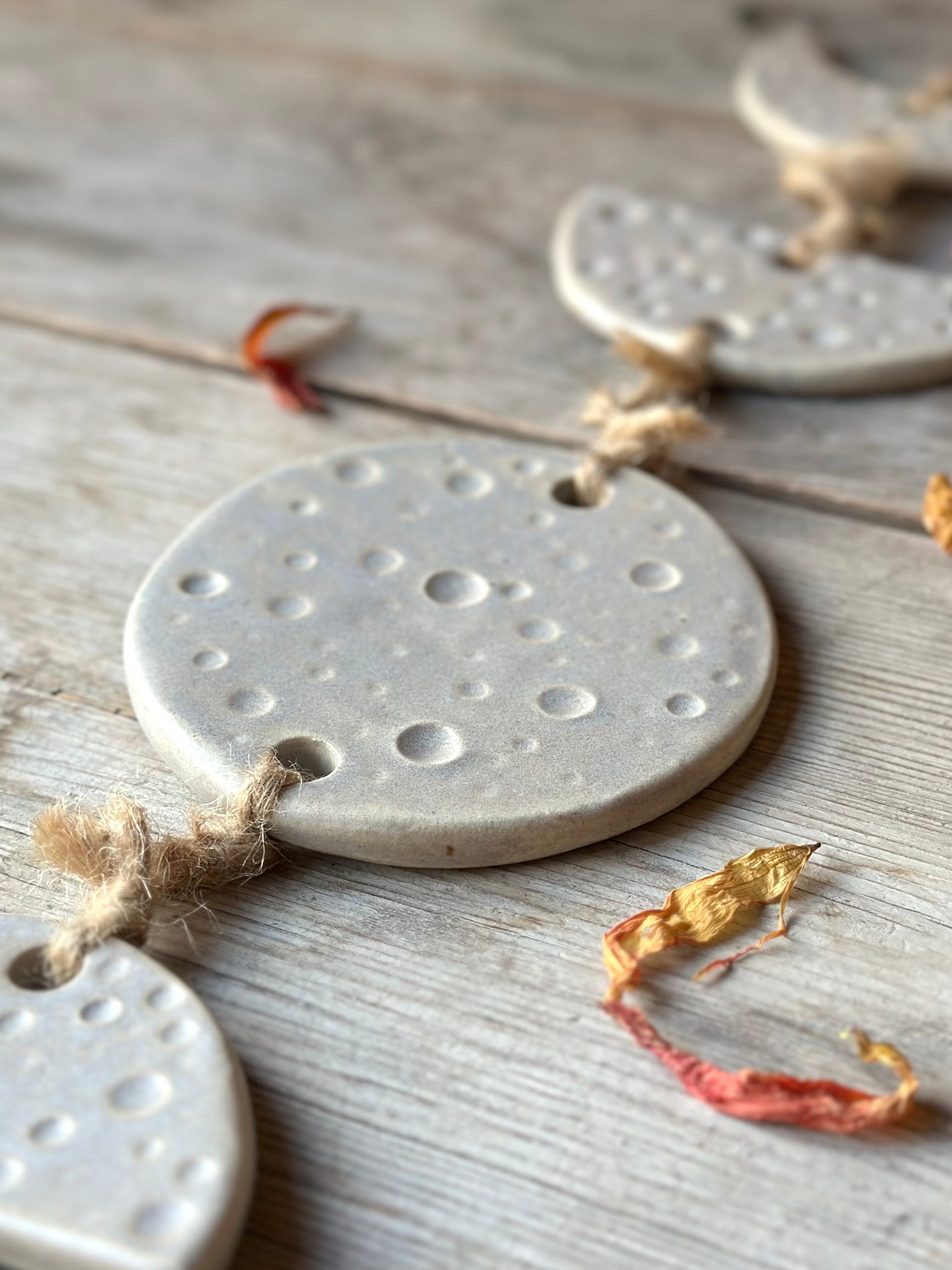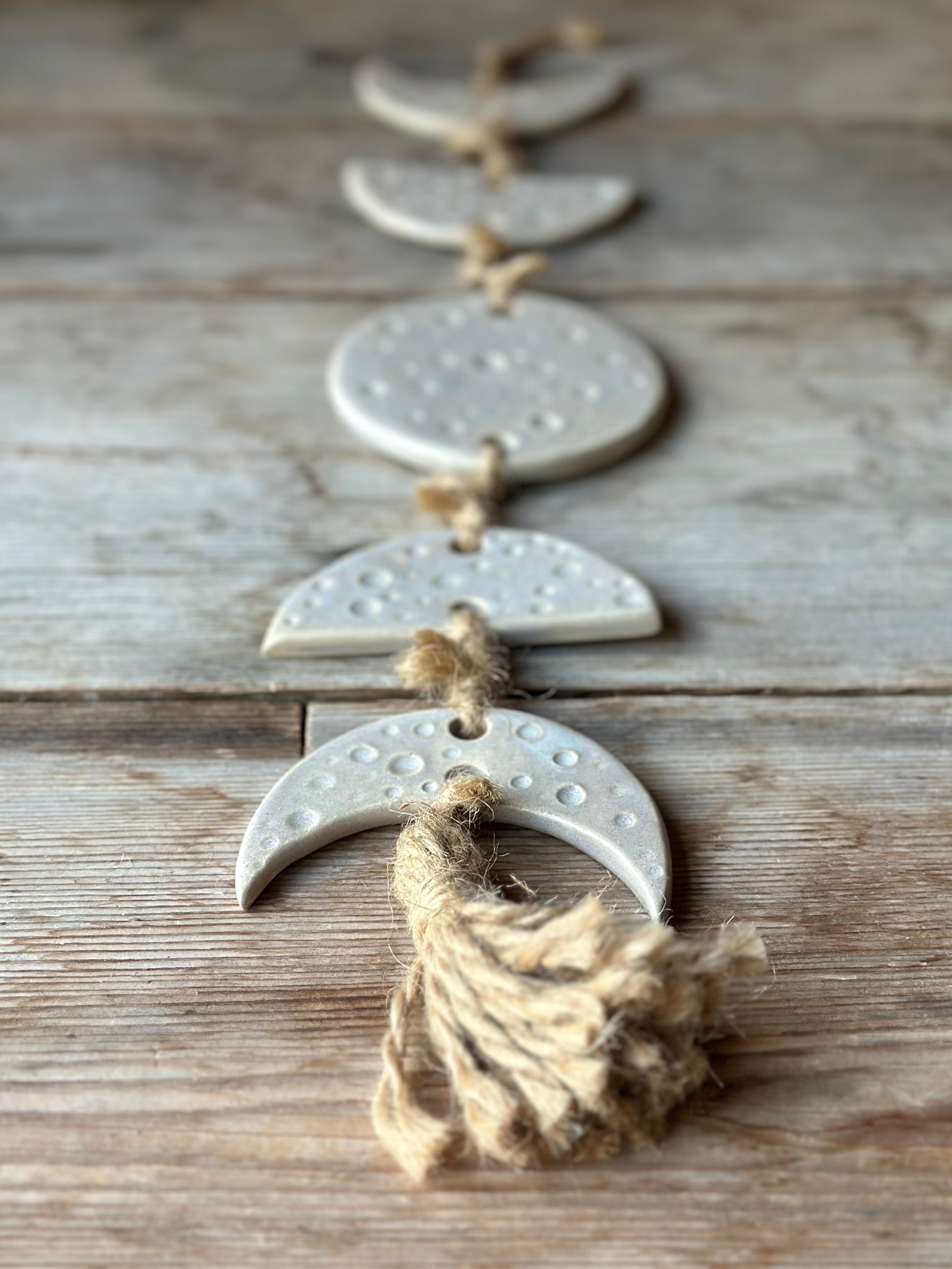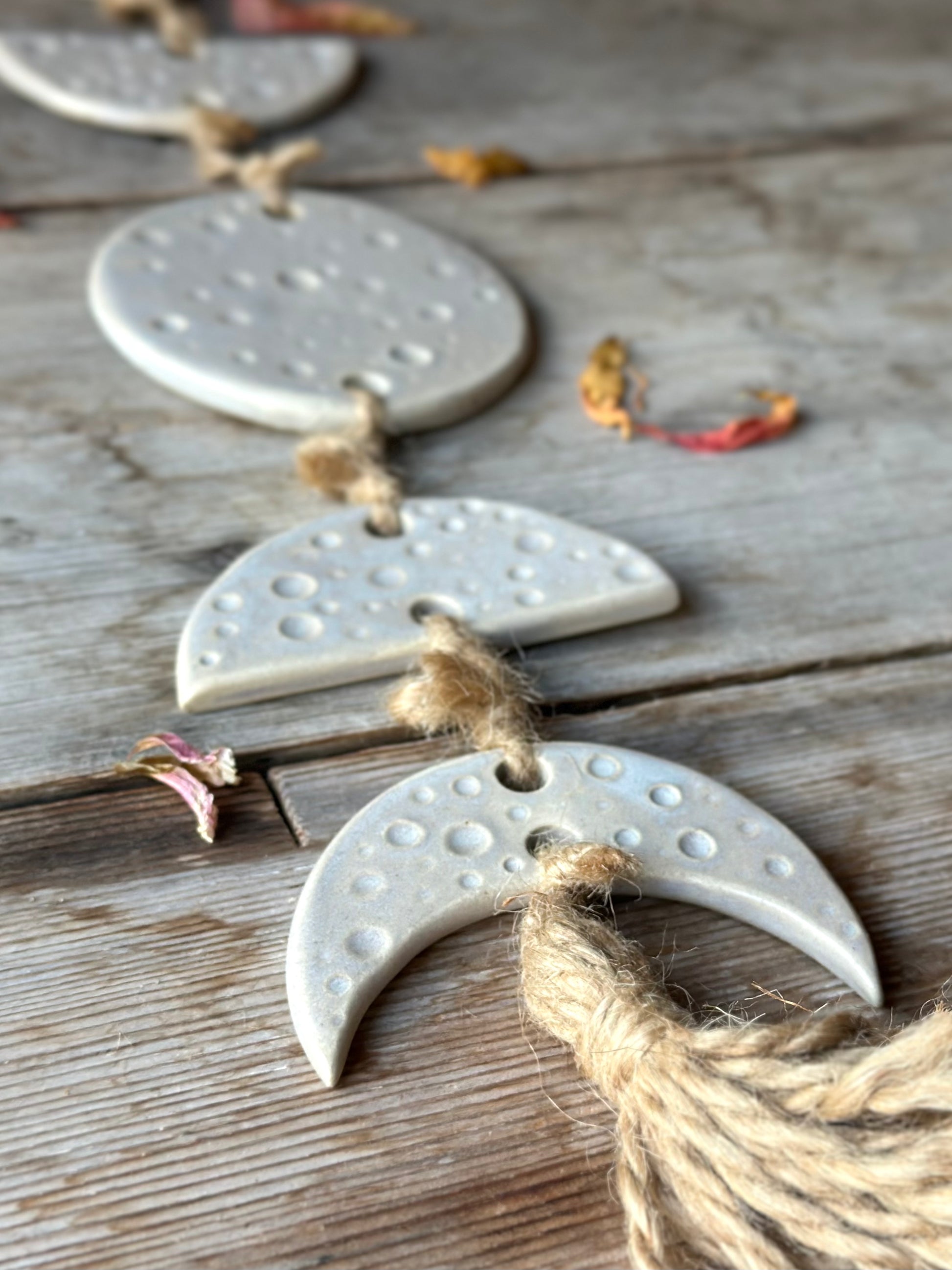 Väggdekoration / mobil med månens faser. Skapad i stengodslera, dekorerade med kratrar och glaserad i en ljusgrå matt glasyr. Snöre och tofs av hampa.