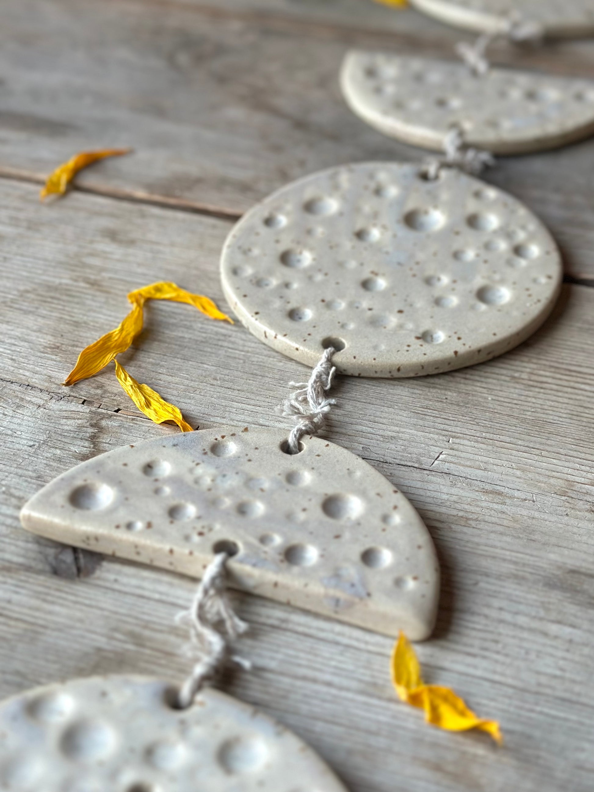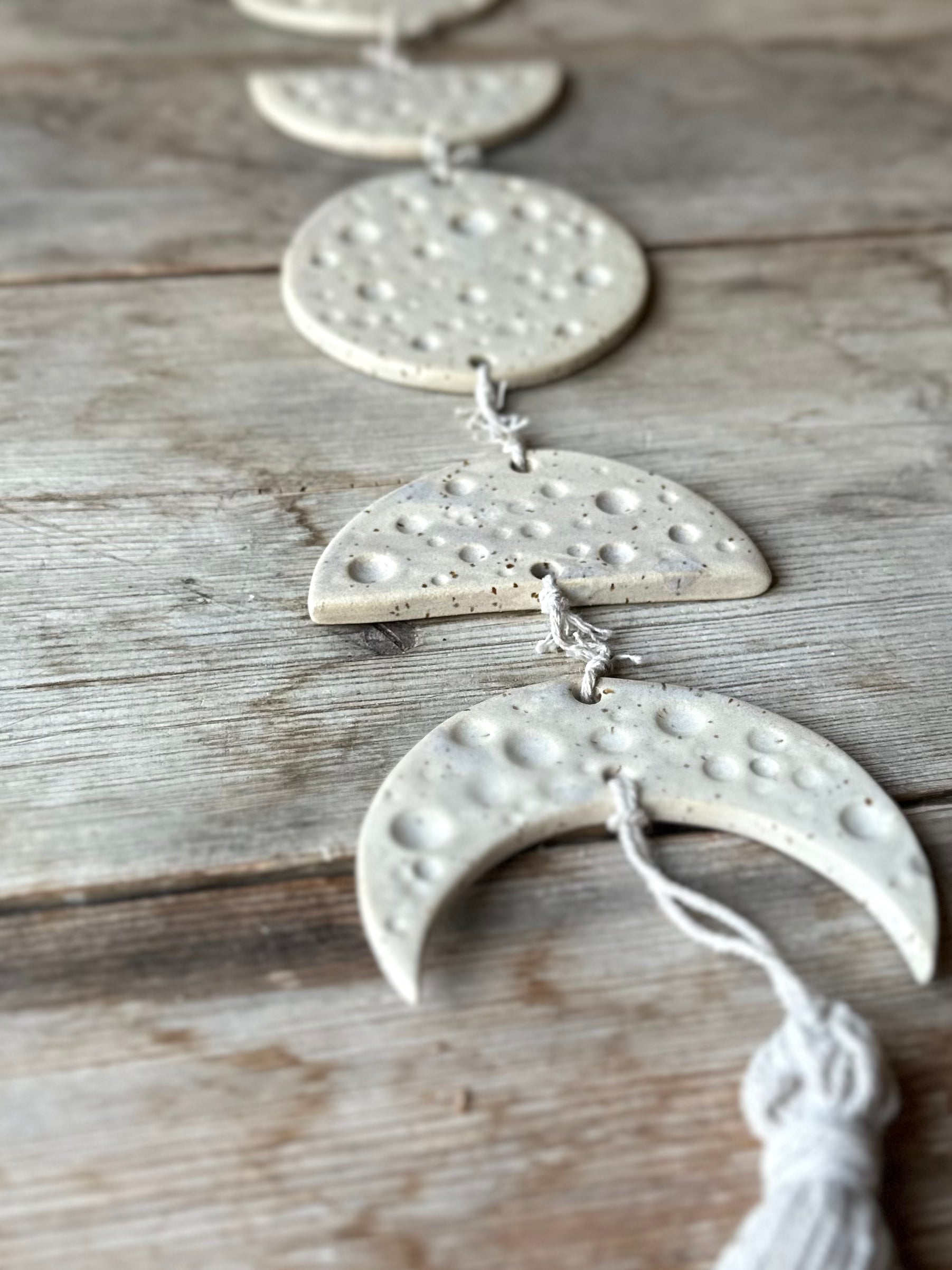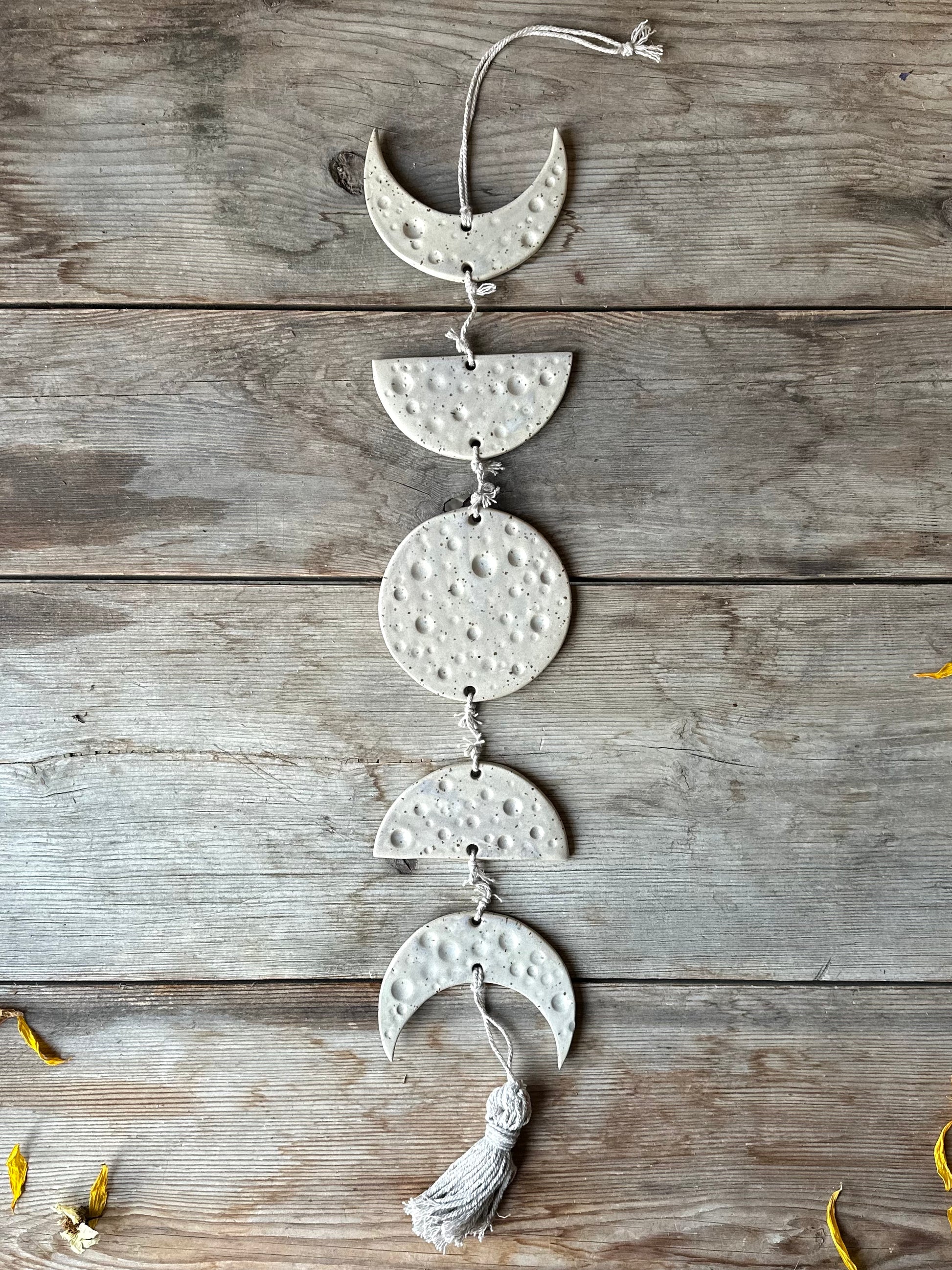 Väggdekoration / mobil med månens faser. Skapad i prickig stengodslera, dekorerade med kratrar och glaserad i en matt ljusgrå glasyr. Snöre och tofs av grått bomullssnöre.