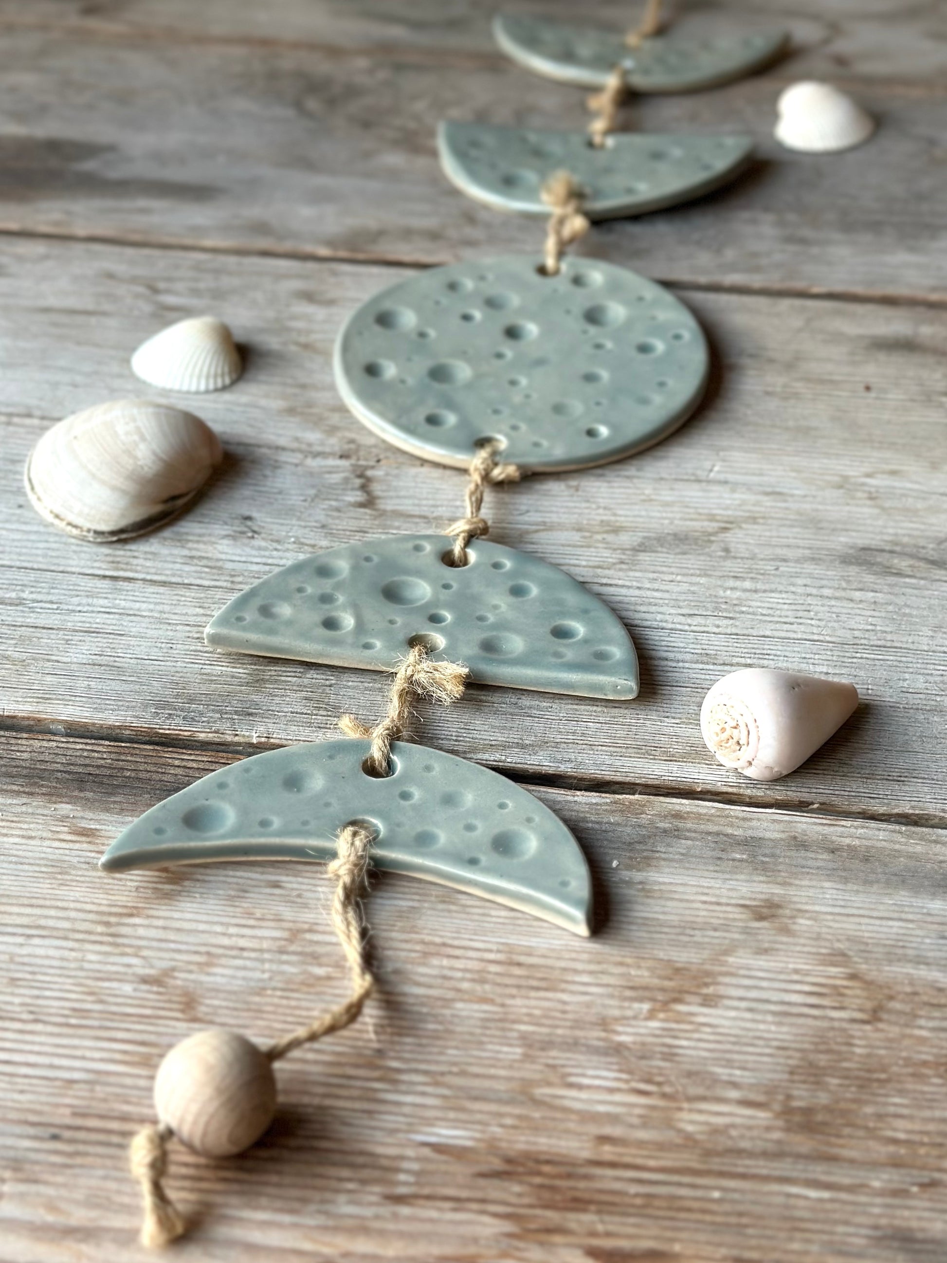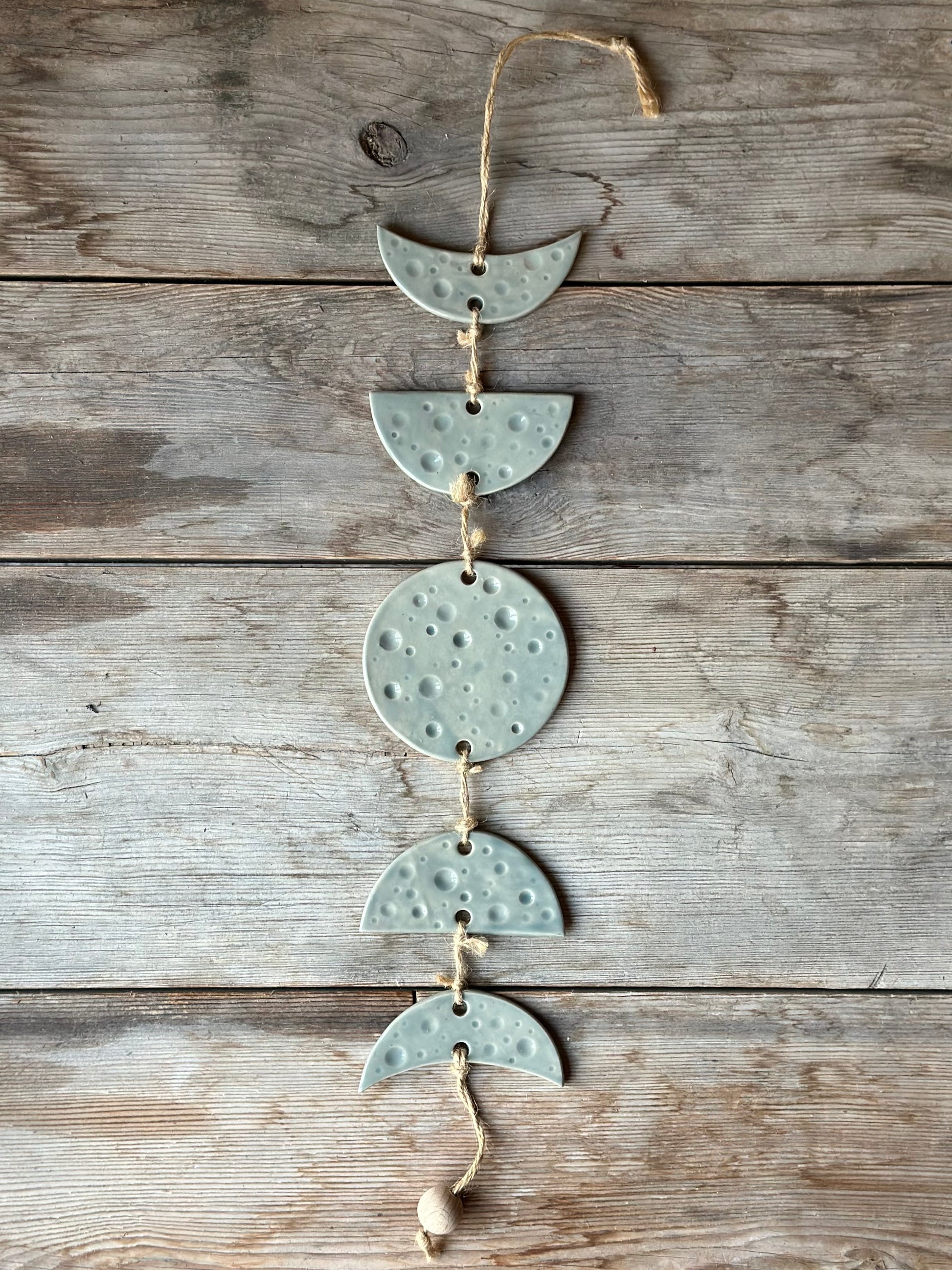 Väggdekoration / mobil med månens faser. Skapad i stengodslera, dekorerade med kratrar och glaserad i en blank, gråblå glasyr. Snöre och tofs av hampa, kula av trä.