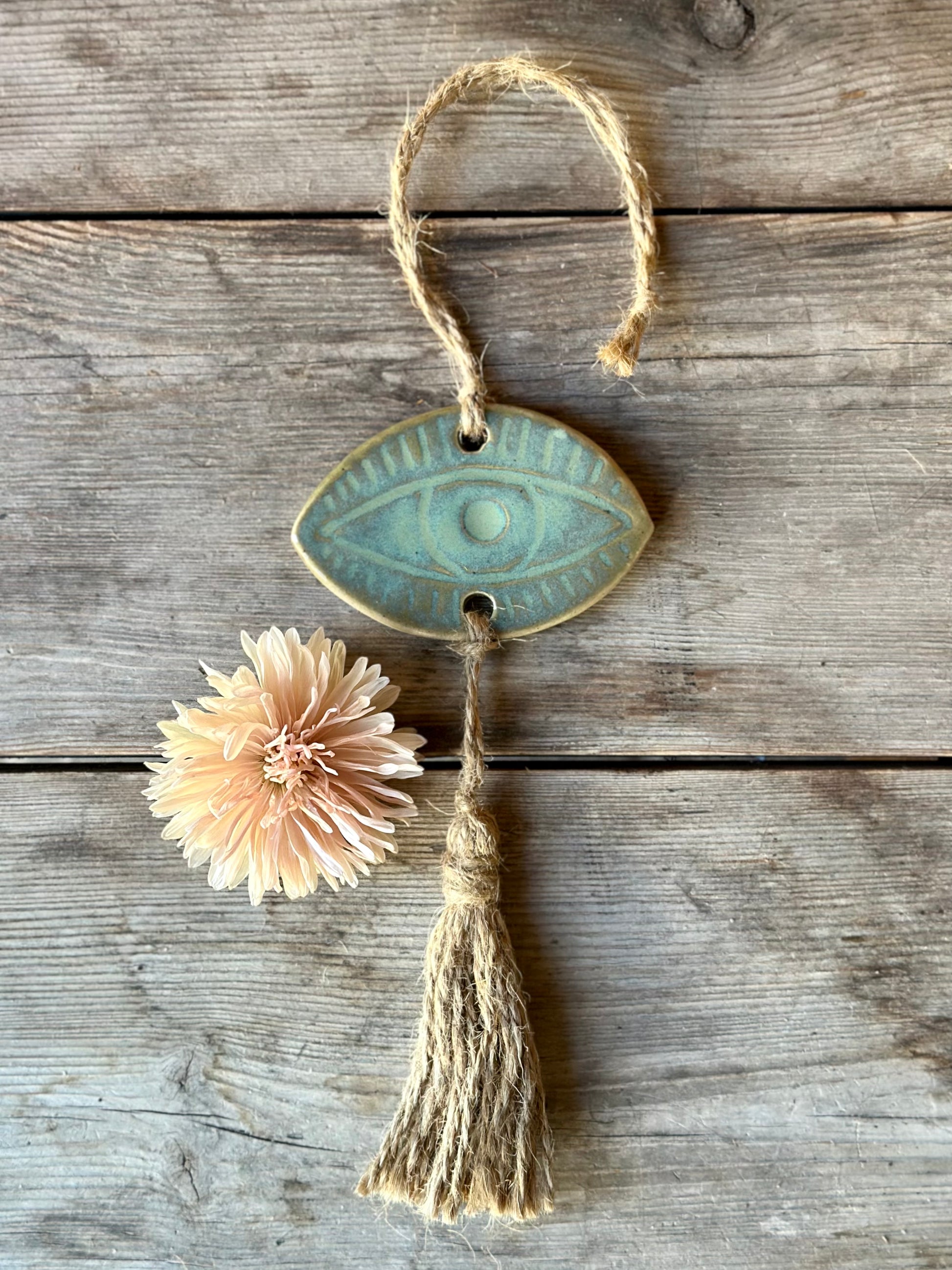 Skapad i stengodslera och glaserad i en turkos-grön glasyr. Snöre av hampa.