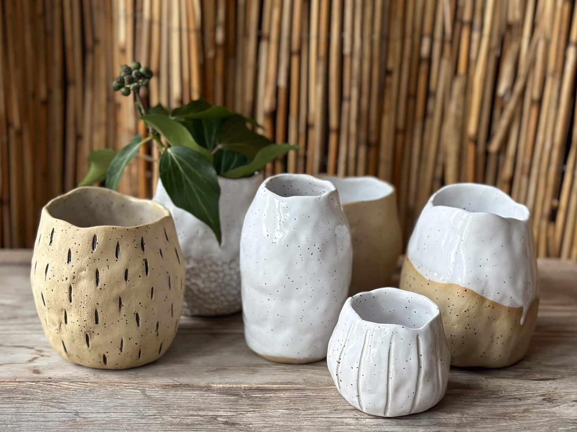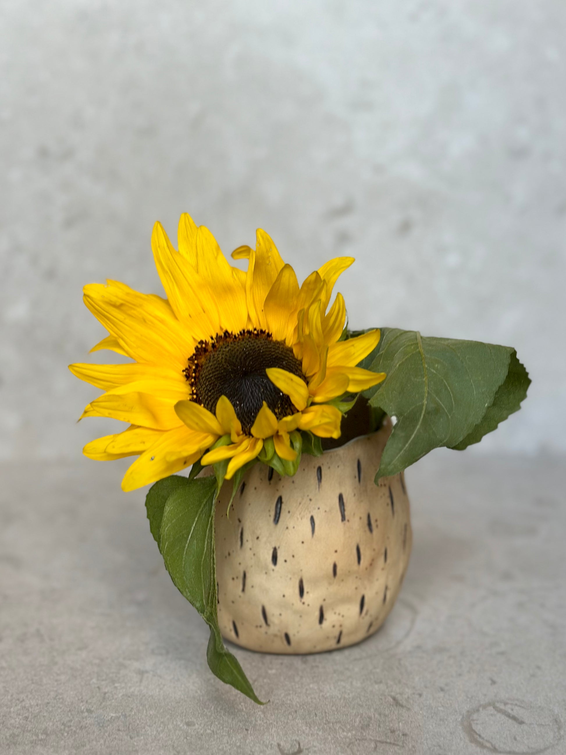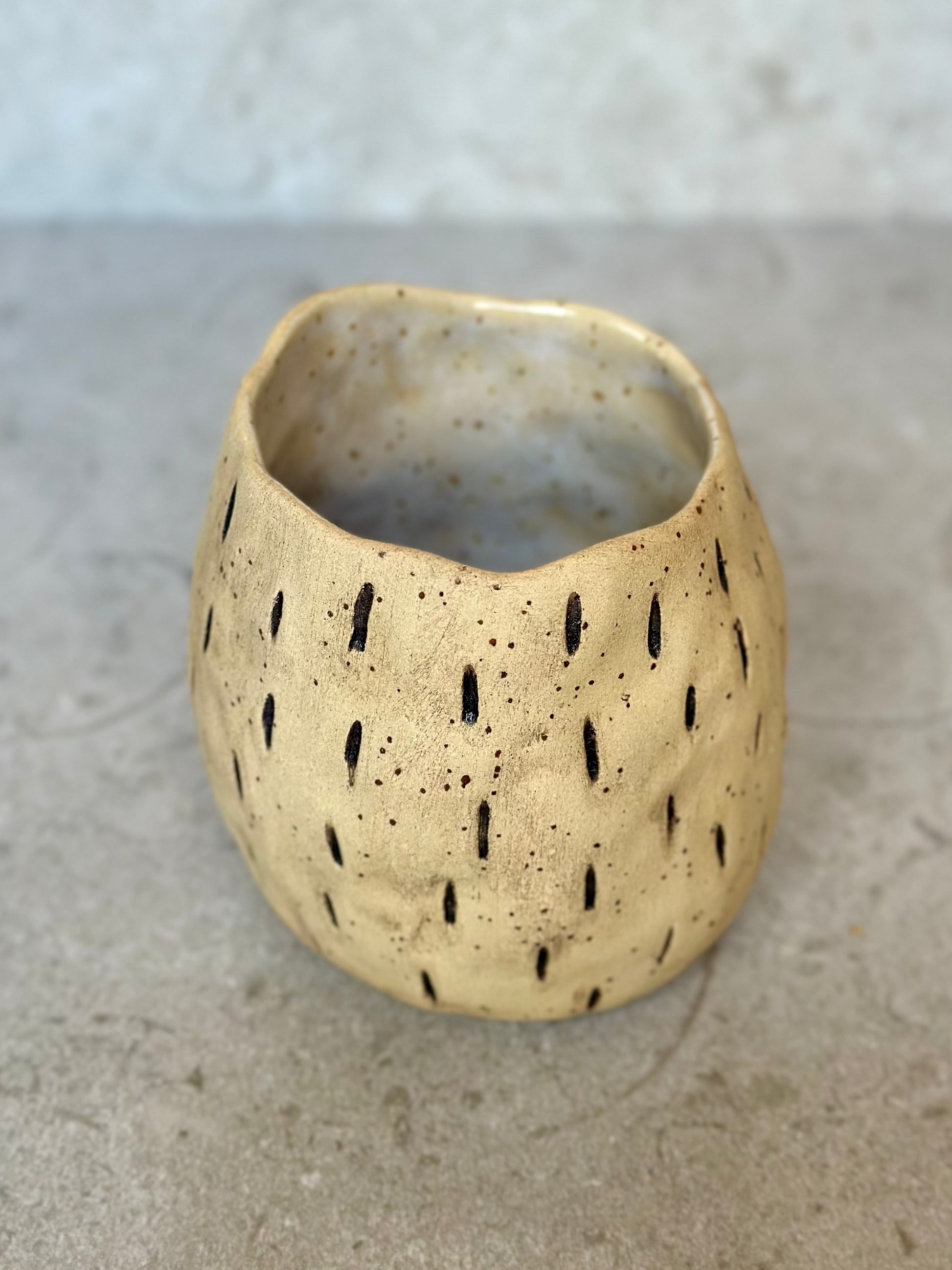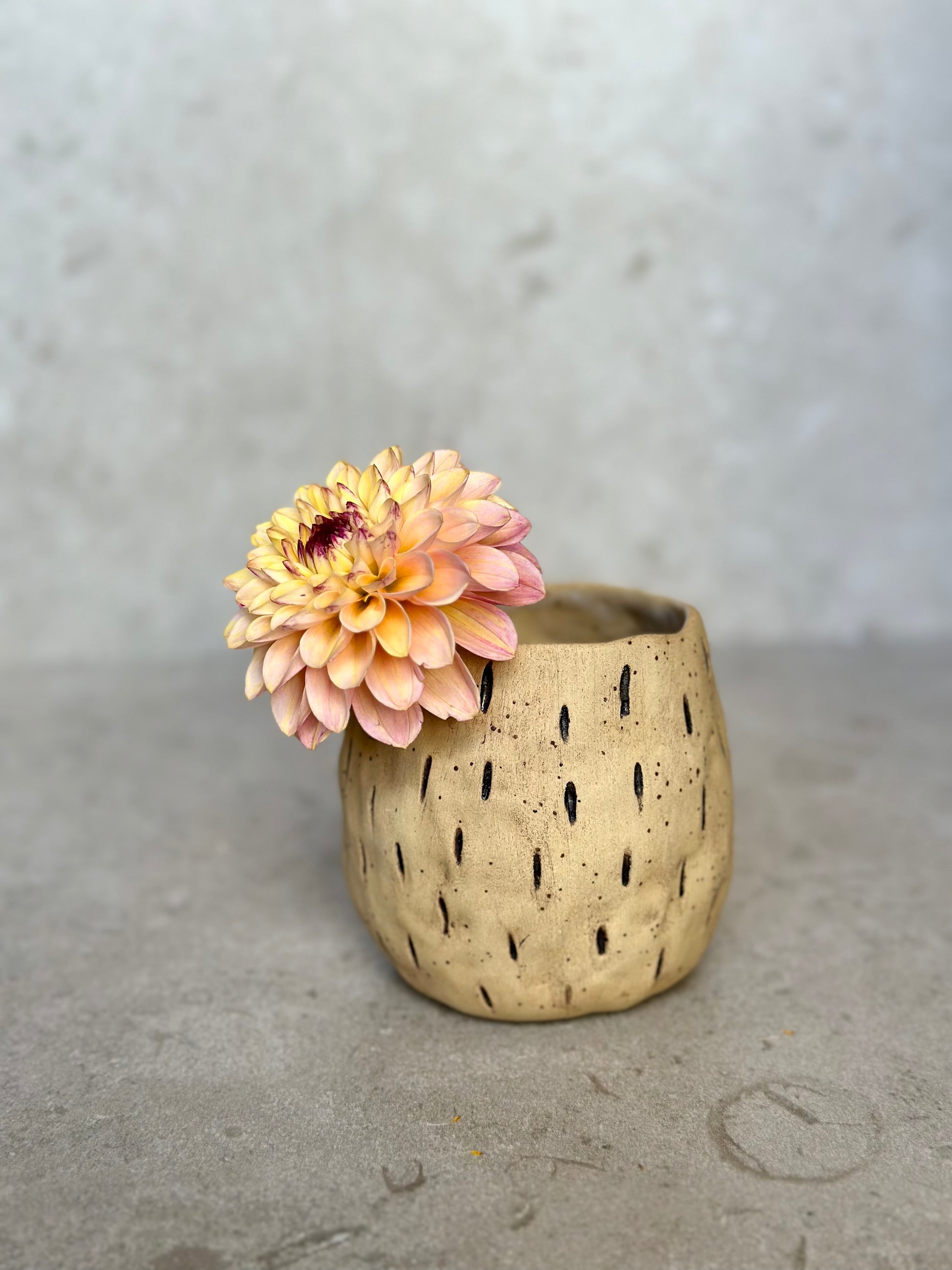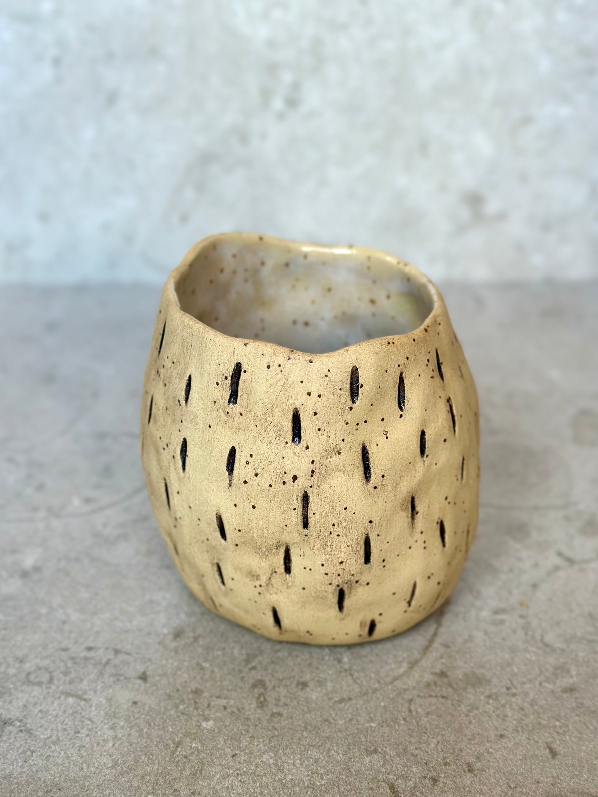 En söt liten vas i prickig lera med karvad dekor, oglaserad rå utsida, transparent glasyr på insidan.
