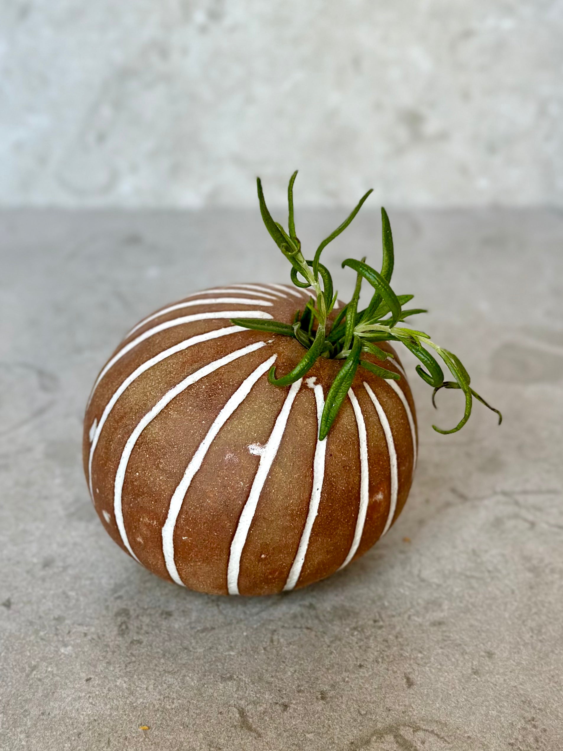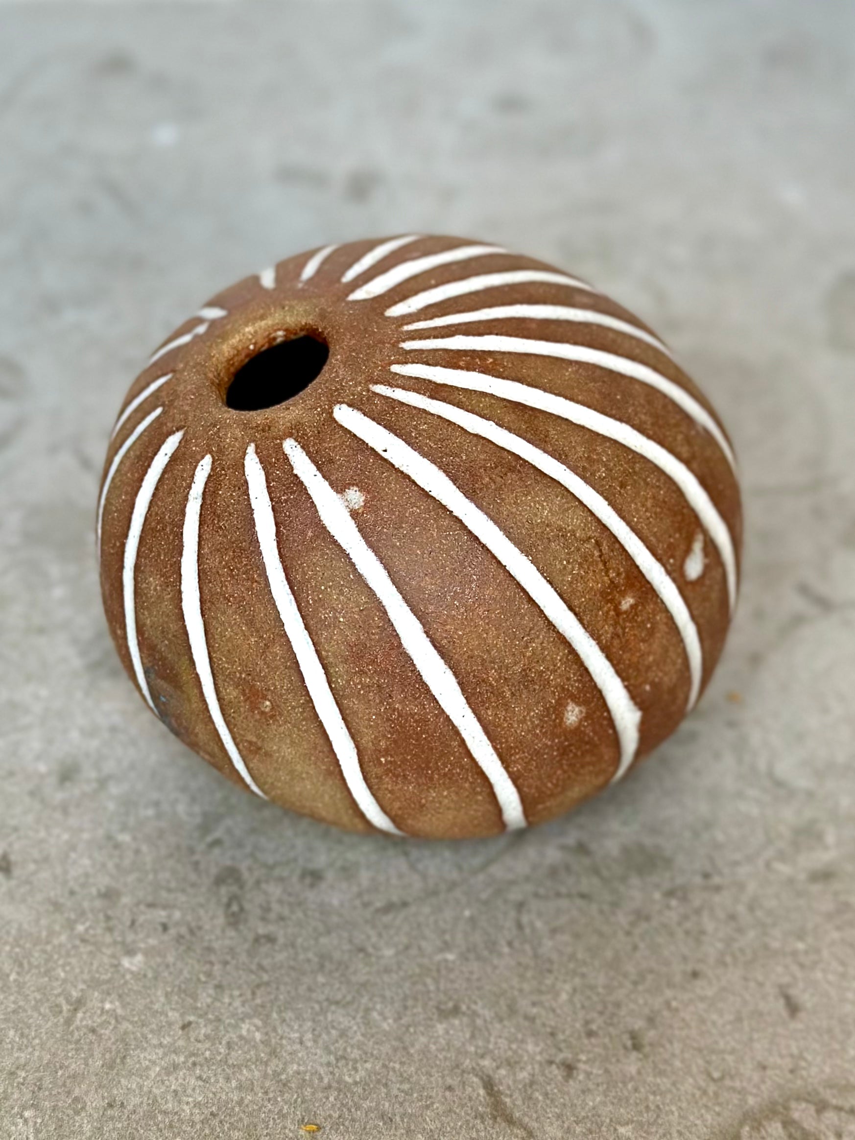En söt, rund liten vas i brun stengodslera med vita glaserade ränder på utsidan och glasyr på insidan.