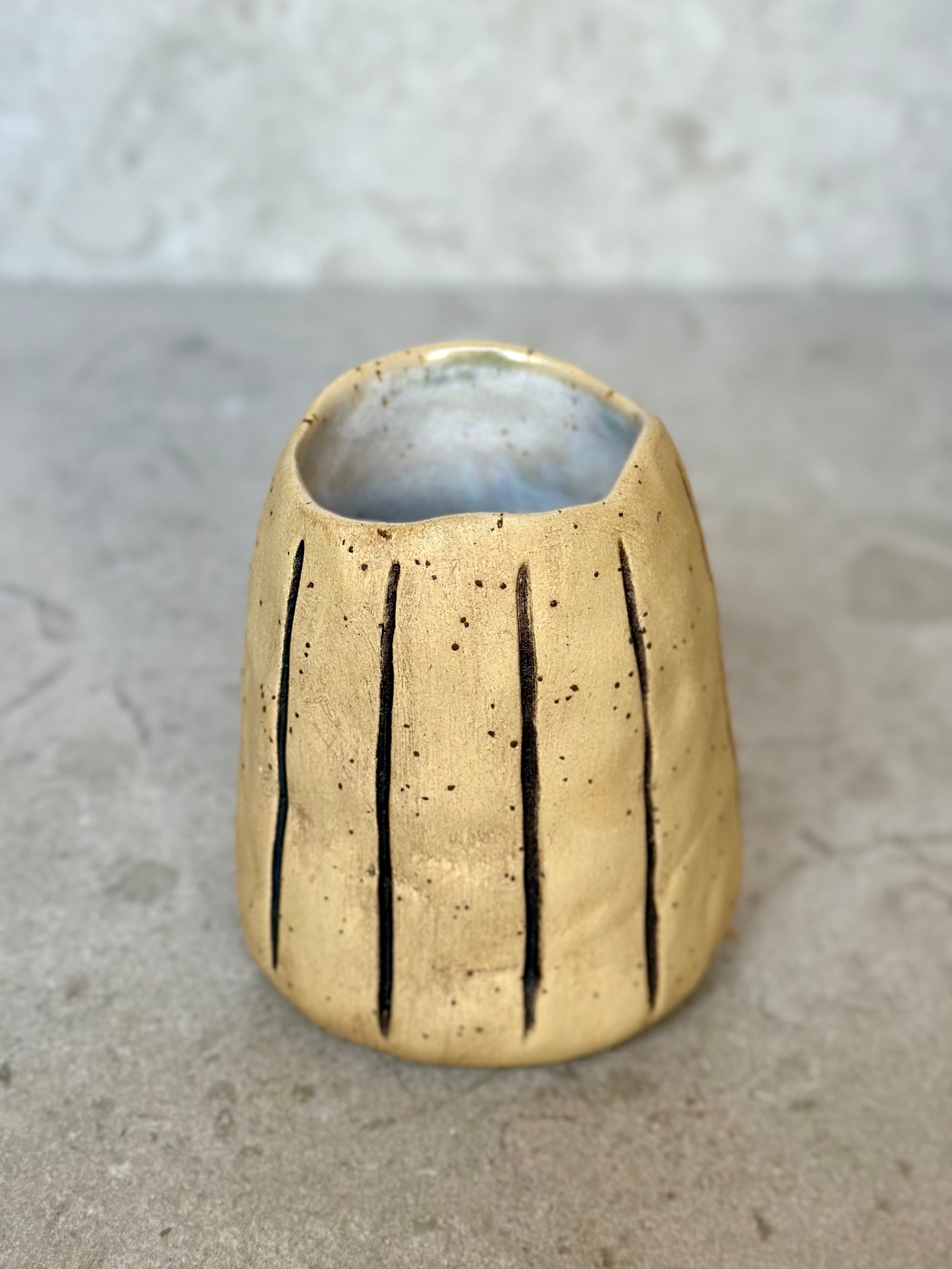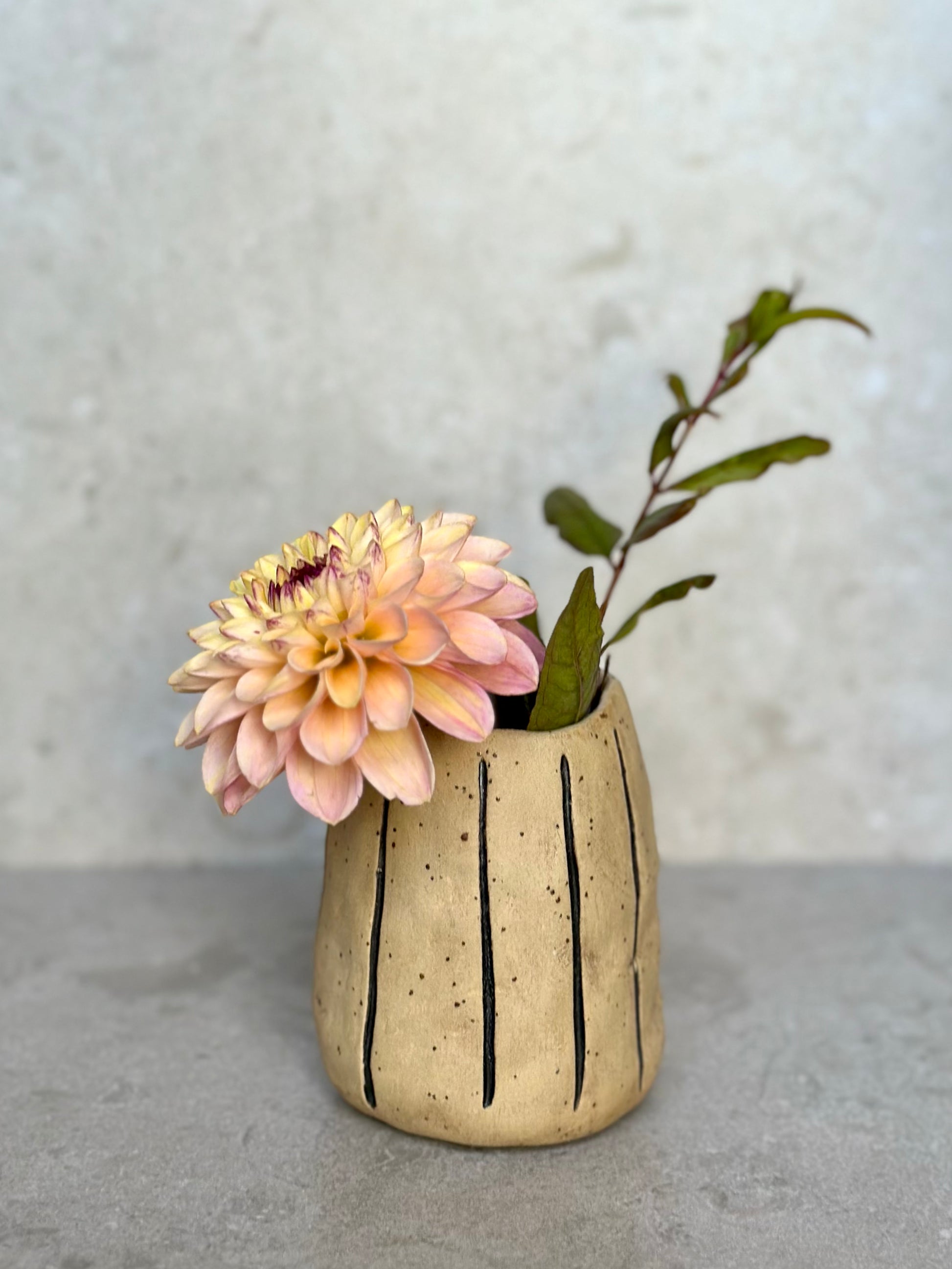 En söt liten vas i prickad stengodslera med karvad infärgad dekor, rå utsida och glasyr på insidan.