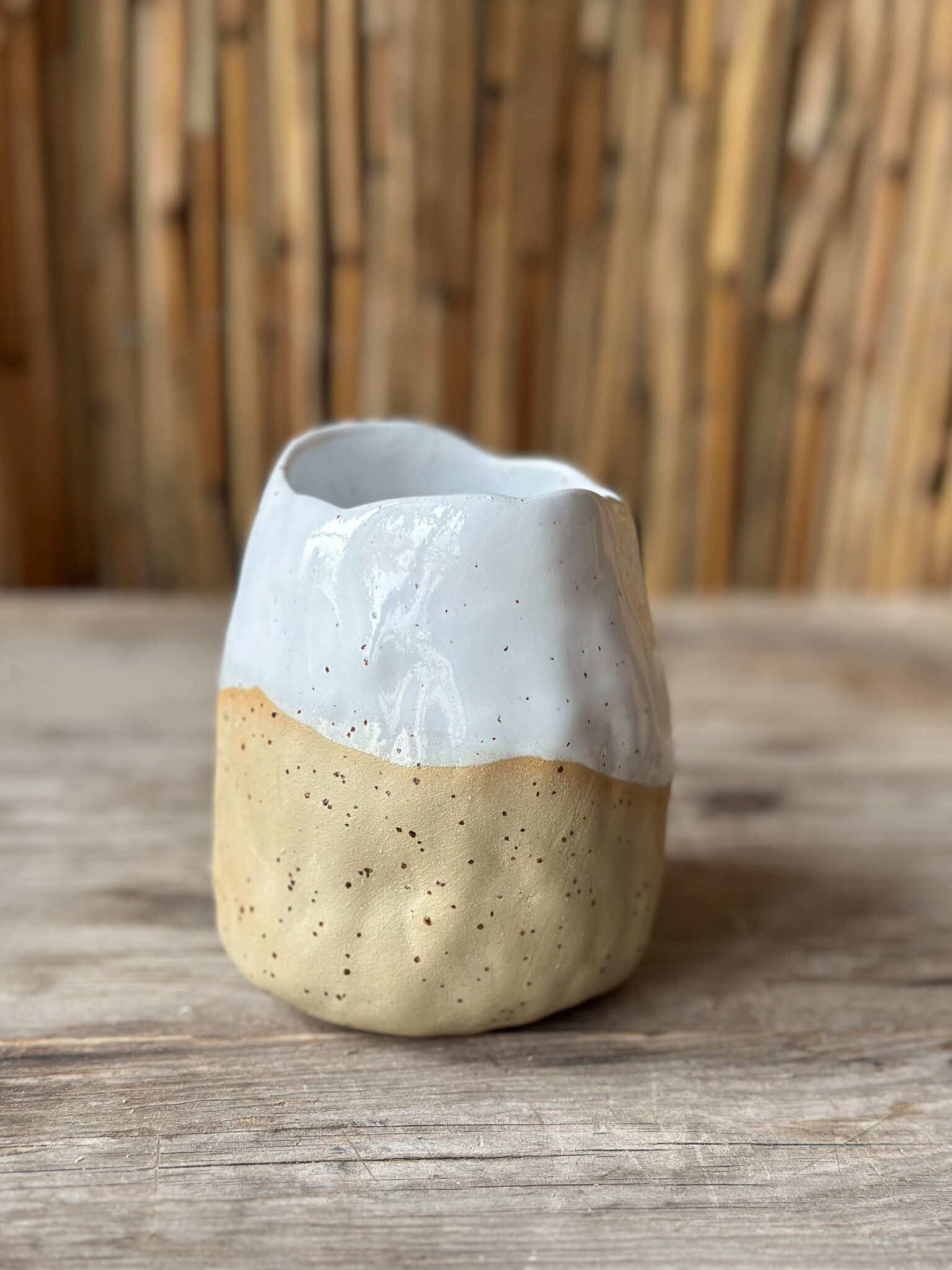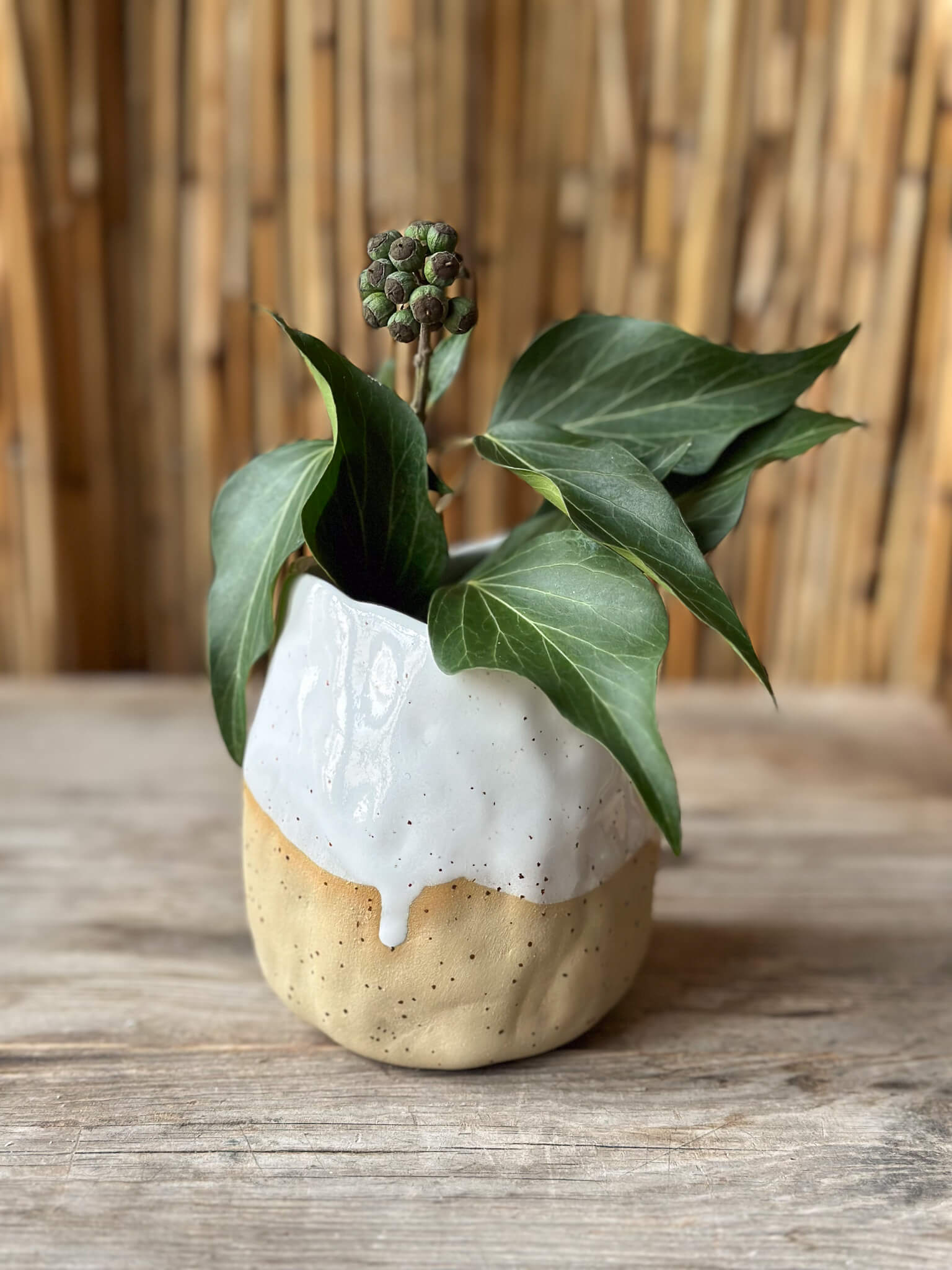 En söt liten vas i prickig stengodslera. Vit glasyr på insidan och halva utsidan.